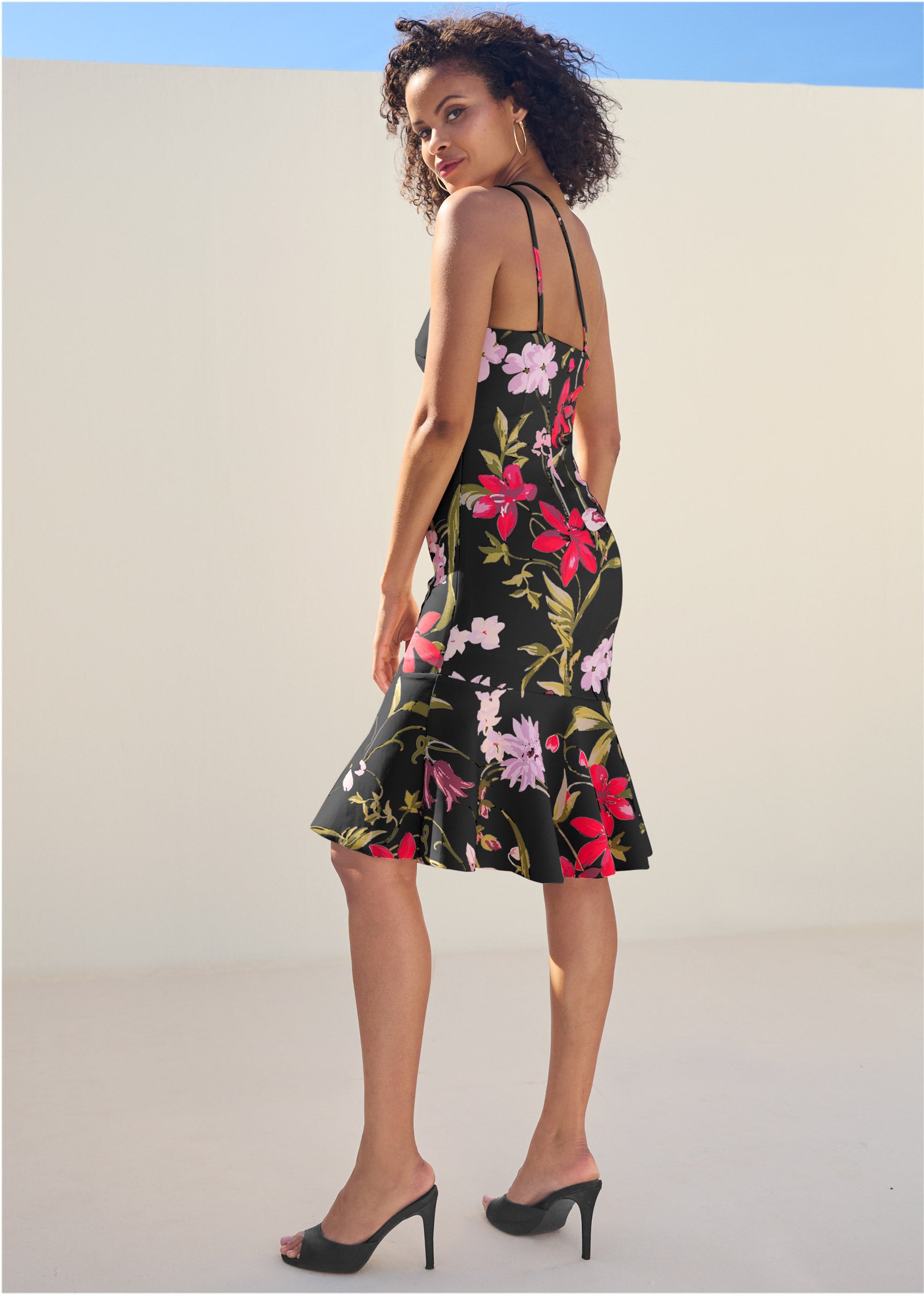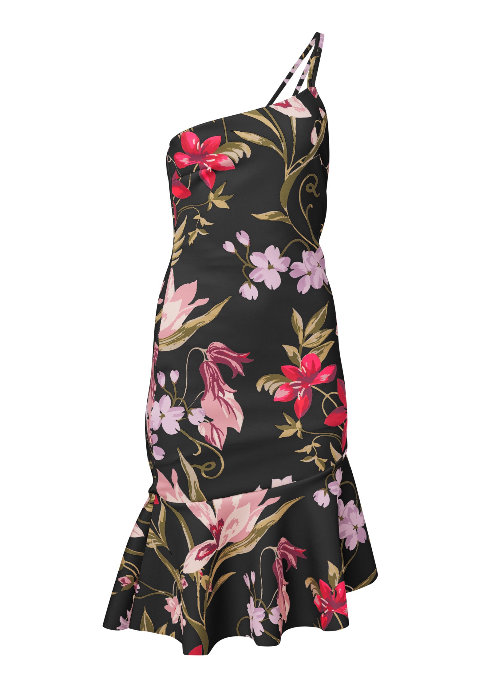 Find your flirt in this form-fitting tiered midi dress. The one-shoulder design with double narrow straps adds a delicate touch to the neckline. The asymmetrical ruffle hemline flares out from the body adding movement to each step.* Sizes: XS (2). S (4-6). M (8-10). L (12-14). XL (16)* Plus sizes: 1X (18-20). 2X (22-24). 3X (26-28)* 38" at shortest point. 43" at longest point; measurements vary by size* Double adjustable straps at one shoulder* Asymmetrical ruffle hem* Invisible side zipper closure* Print placement may vary* Fabric has stretch* Poly/elastane. Imported