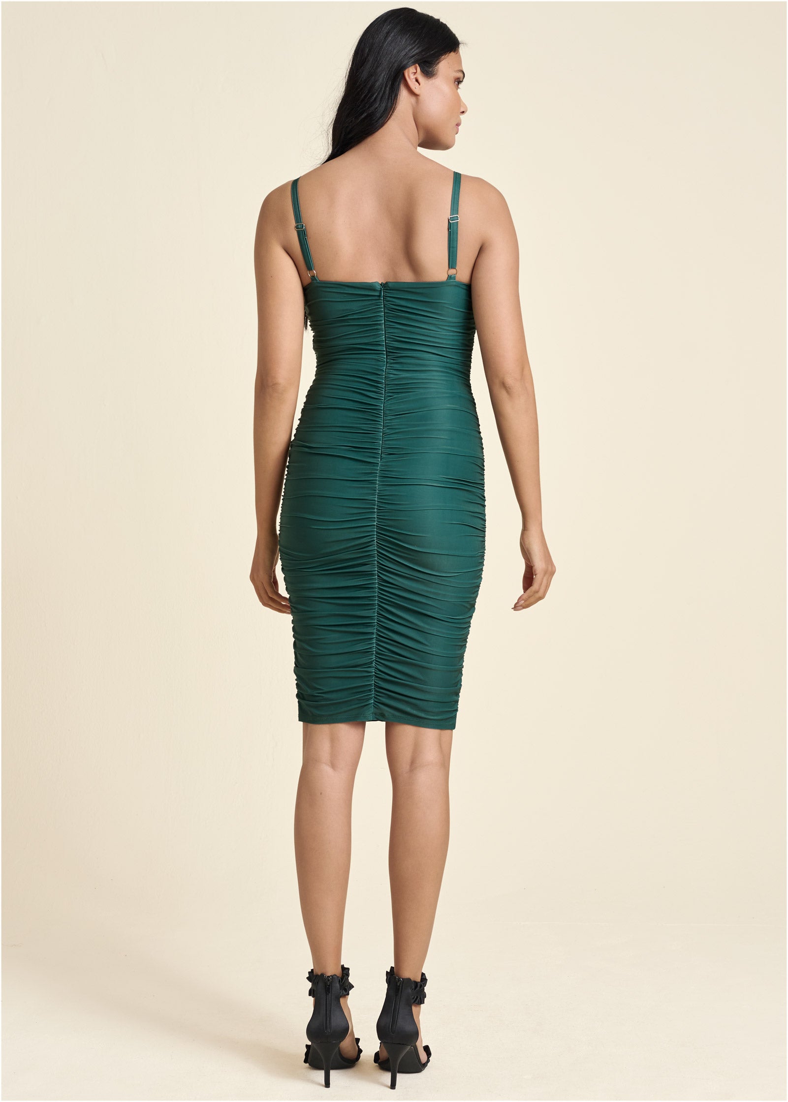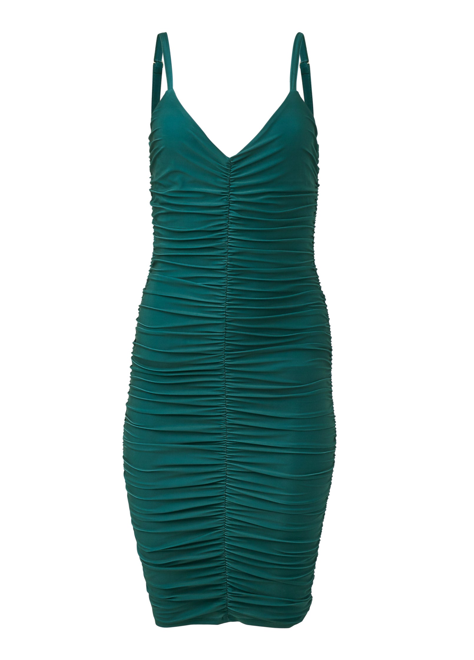 Ruched and ready to party. this mini feels instantly at home in your occasion-wear rotation. Vertical seams at center front and back have a flattering effect that hugs your figure. The subtle dip of the neckline leaves space for a necklace. while adjustable spaghetti straps make it easy to layer.* Sizes: XS (2). S (4-6). M (8-10). L (12-14). XL (16) * Plus sizes: 1X (18-20). 2X (22-24). 3X (26-28)* Fabric has stretch* 38" length from HPS. varies by size* Adjustable spaghetti straps* Fully lined* Poly/elastane. Imported