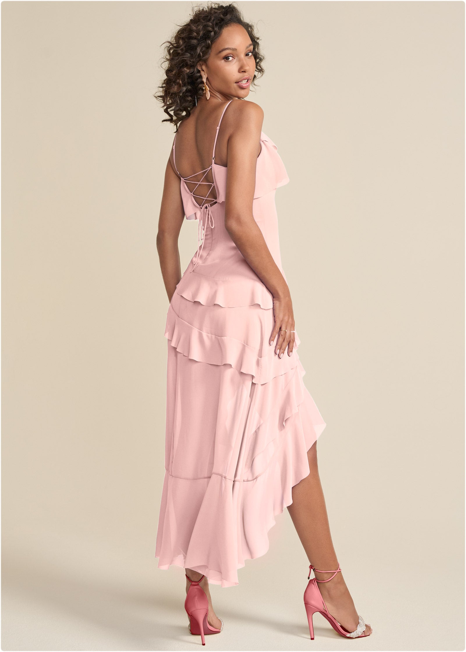 Arrive already in party mode when you wear this ruffled high-low dress! Fluttery tiers drape from the bust. across the mini-length front and to the longer-in-the-back hem of this event-ready dress. Adjustable spaghetti straps and corset-style lace-up back make for a custom fit that says you own the room.* Sizes: XS (2). S (4-6). M (8-10). L (12-14). XL (16) * Plus sizes: 1X (18-20). 2X (22-24). 3X (26-28)* Item runs small; size up for a better fit* Back zipper and lace-up closure * Adjustable spaghetti straps* High-low hem: 57" at longest point; 33" at shortest point* Measurements vary by size* Fabric does not have stretch * Poly. Imported