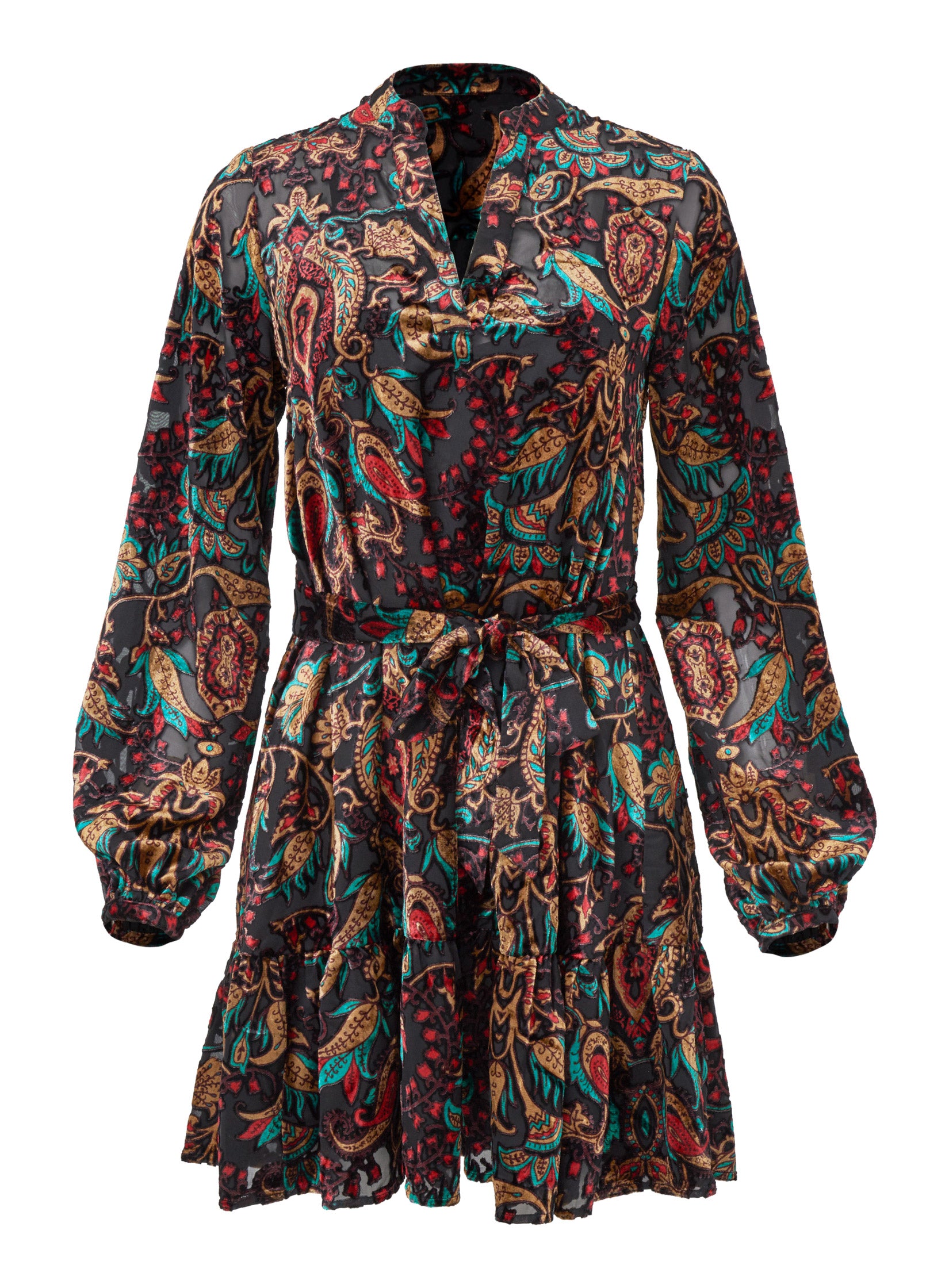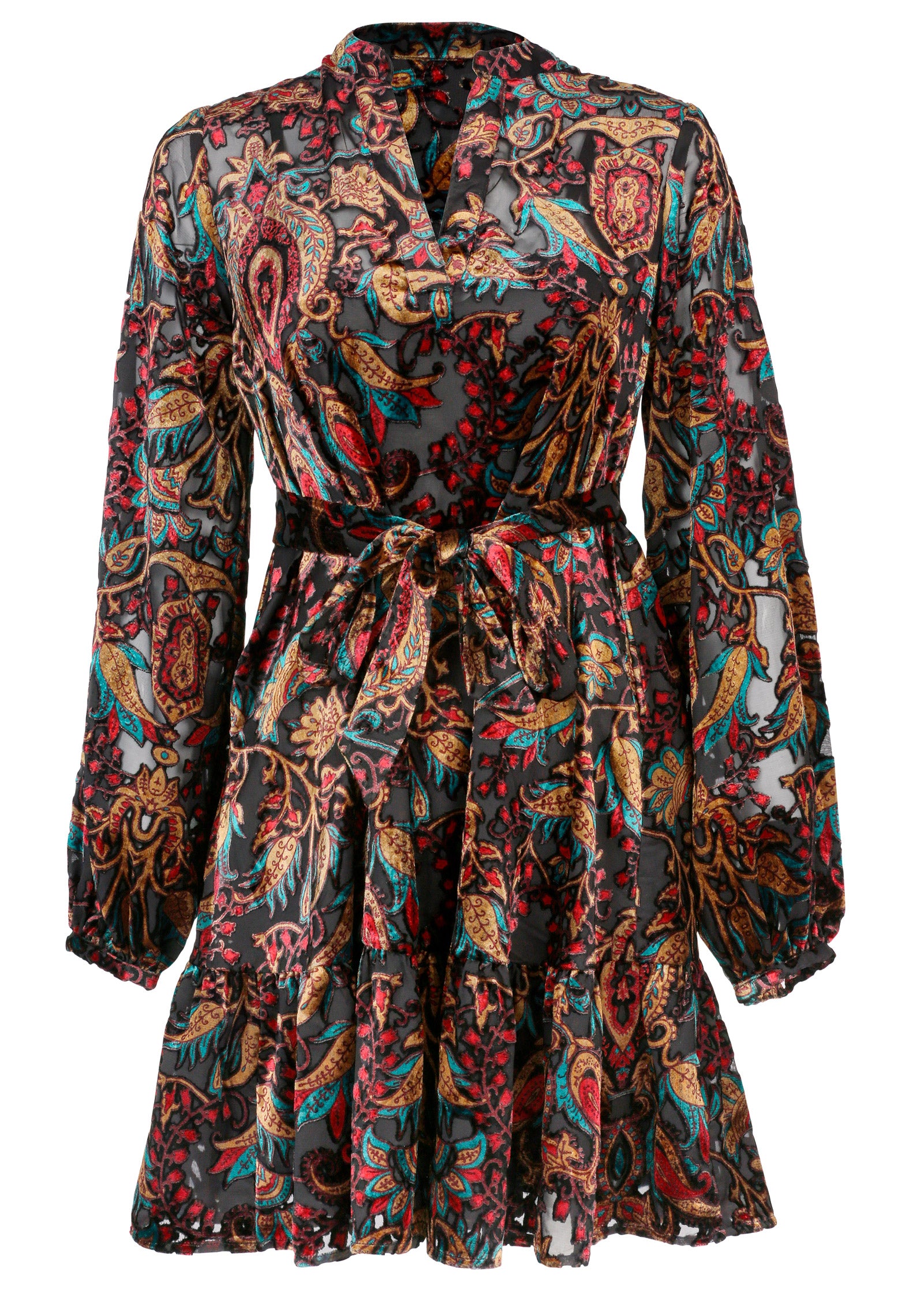 There's nothing we're crushing on harder than velvet. except maybe burnout velvet! Look closely and you'll notice the background of the lavishly-plush print is sheer. giving this twirly mini an elevated and flirty feel. Tie the waist belt to show off your shape and you've got a luxe look for date nights. parties and more.* Available in plus sizes * Mini length. 36" from shoulder* V-neck* Long sleeves* Tie waist belt* Fully lined* Viscose/poly. Imported