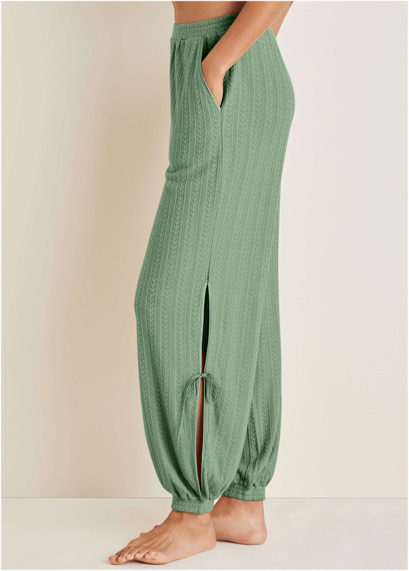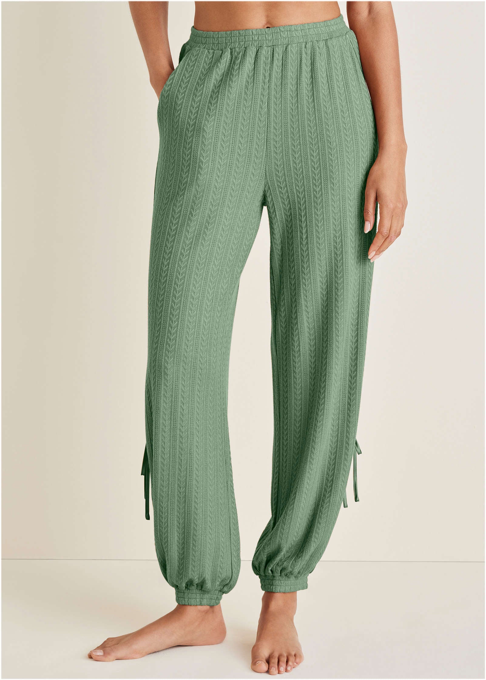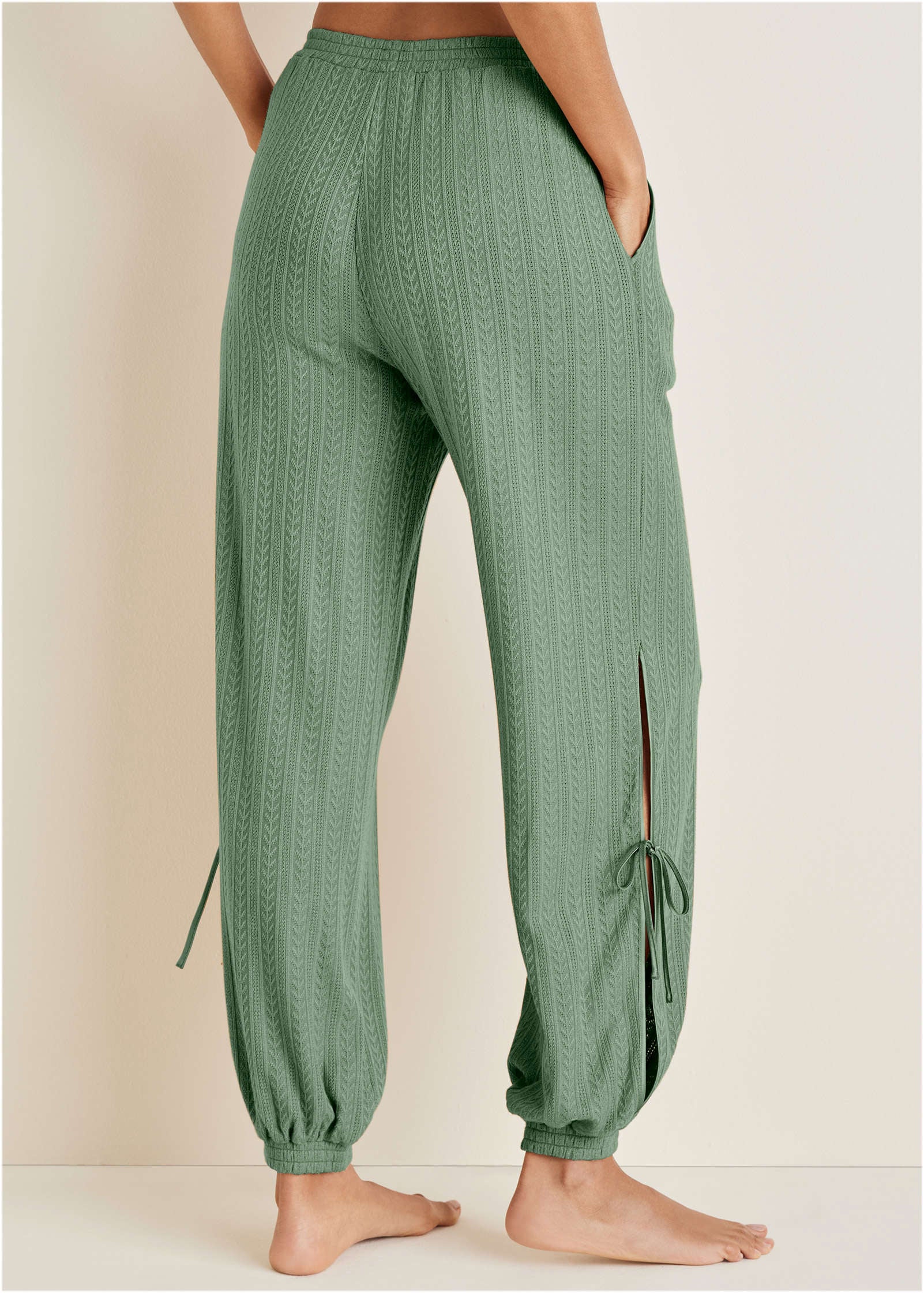 Get the hotel feel right at home with these lightweight joggers that make every day feel like checking in for a five-star stay—the only thing missing is room service! Delicately-textured fabric along with breezy side slits affixed with feminine bow ties give these easy-chic lounge pants an elevated look. What are you waiting for? Book your stay now.* Sizes: XS (2). S (4-6). M (8-10). L (12-14). XL (16)* Mid rise* Elastic waistband* Pockets* Side slits* Bow ties at sides* Rayon/polyester/nylon/spandex. Imported