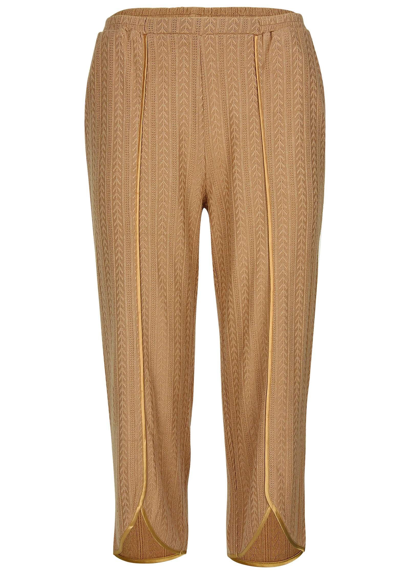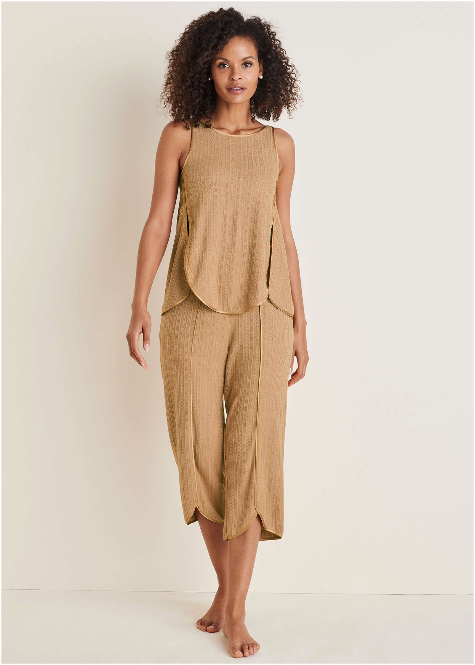 Get the hotel feel right at home with this lightweight. textured lounge set that makes every day feel like checking in for a five-star stay—the only thing missing is room service! This tank-and-capri-pant duo features delicate eyelash-lace trim along the tank and feminine tulip-hem details that give the easy-chic set an elevated look. What are you waiting for? Book your stay now.* Sizes: XS (2). S (4-6). M (8-10). L (12-14). XL (16)* Plus sizes: 1X (18-20). 2X (22-24). 3X (26-28)* Tank and pants* Tank: Sleeveless; Scoop back; Eyelash lace trim; Tulip hem* Pants: Mid rise; Cropped* Rayon/polyester/nylon/spandex. Imported