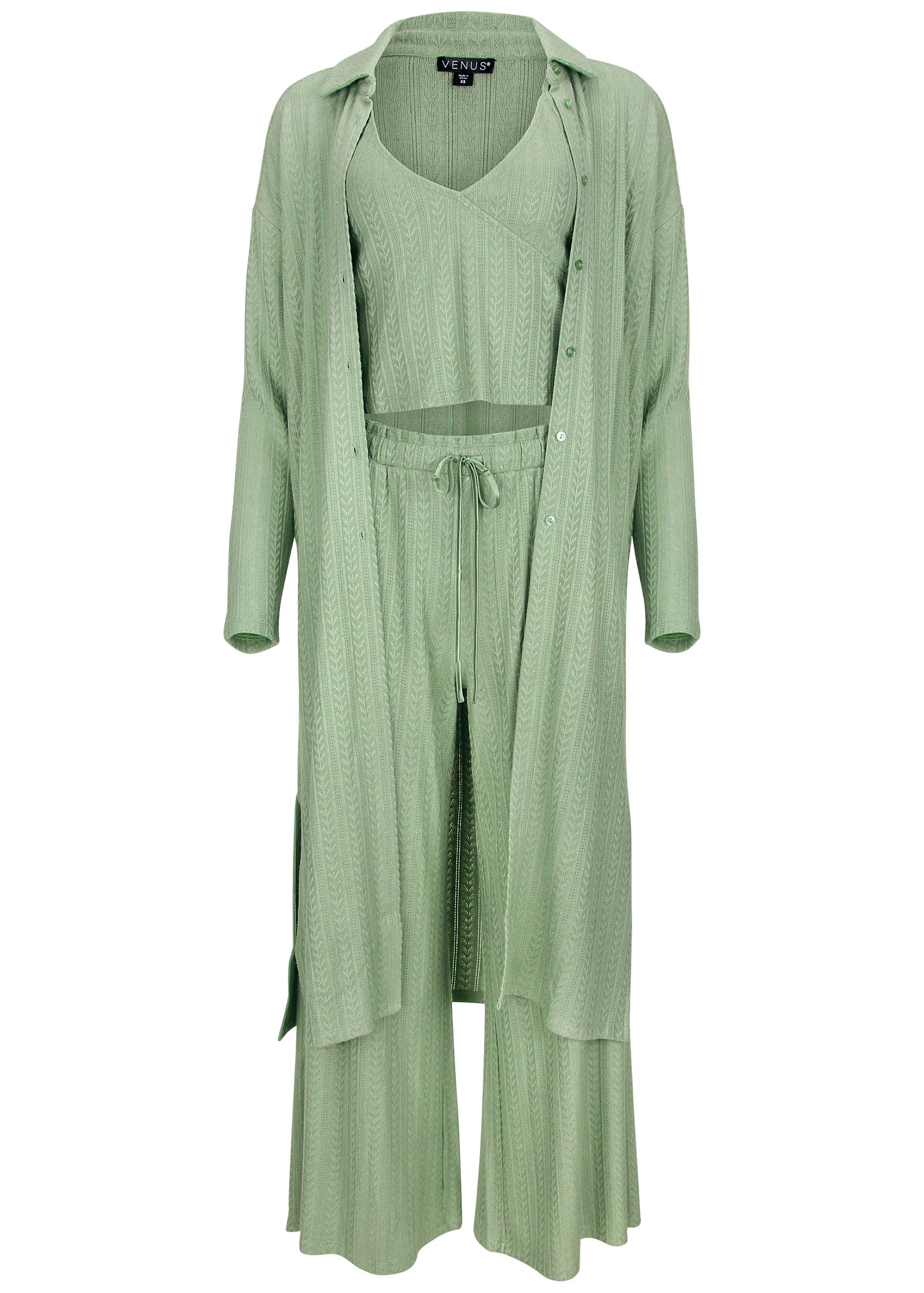 Get the hotel feel right at home with this lightweight lounge set that makes every day feel like checking in for a five-star stay—the only thing missing is room service! This duster. tank and wide-leg pant three-piece features delicately-textured fabric and an effortless fit that give the easy-chic set an elevated look. What are you waiting for? Book your stay now.* Sizes: XS (2). S (4-6). M (8-10). L (12-14). XL (16)* Plus sizes: 1X (18-20). 2X (22-24). 3X (26-28)* Duster. tank and pants* Duster: Collared; Long sleeves; Button closure* Tank: Adjustable spaghetti straps; V-neckline; Cropped* Pants: High waist; Drawstring closure; Side pockets; Wide legs* Rayon/polyester/nylon/spandex. Imported