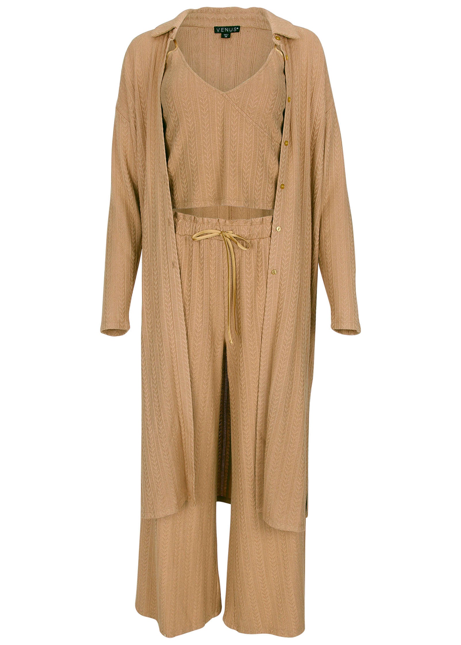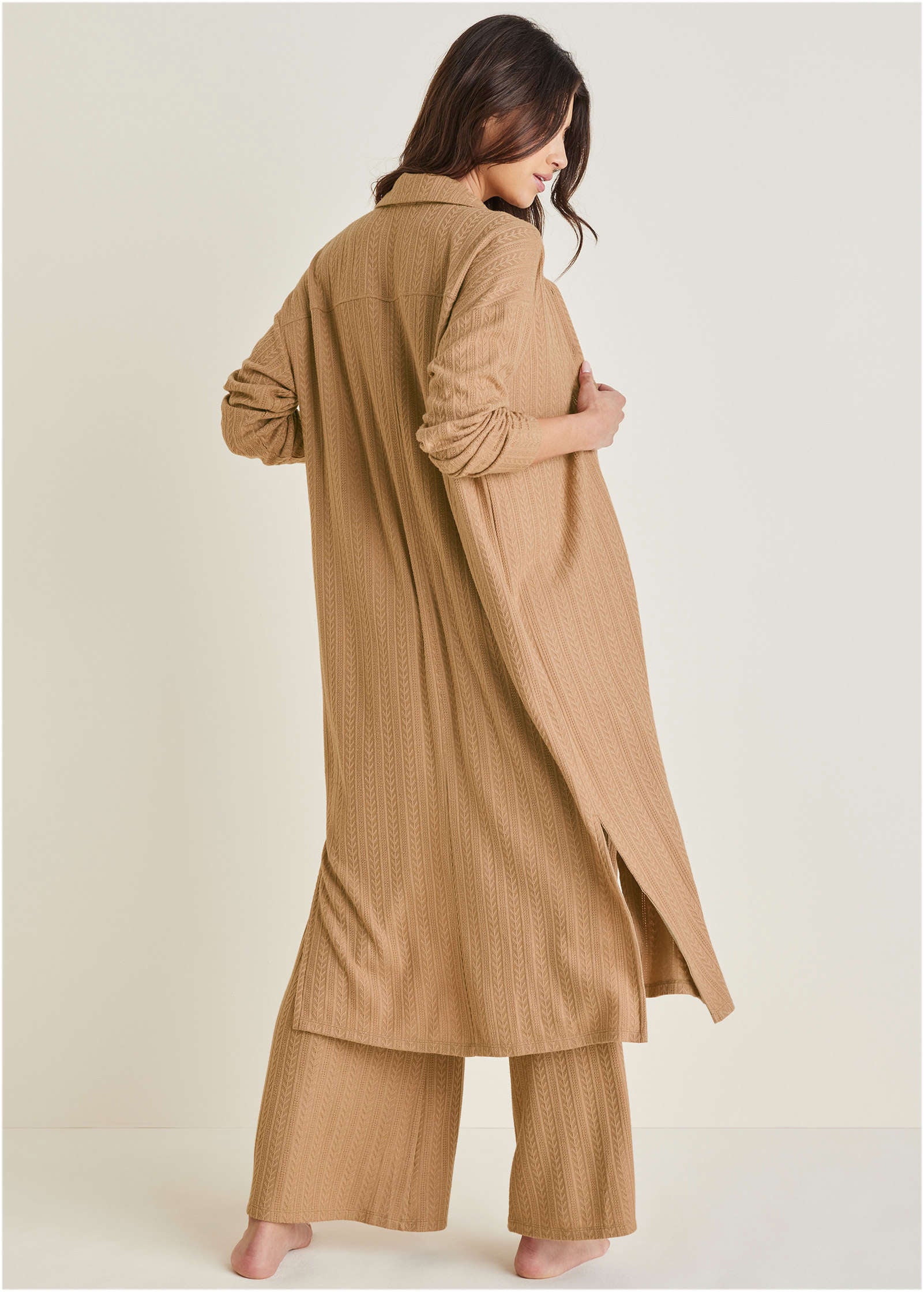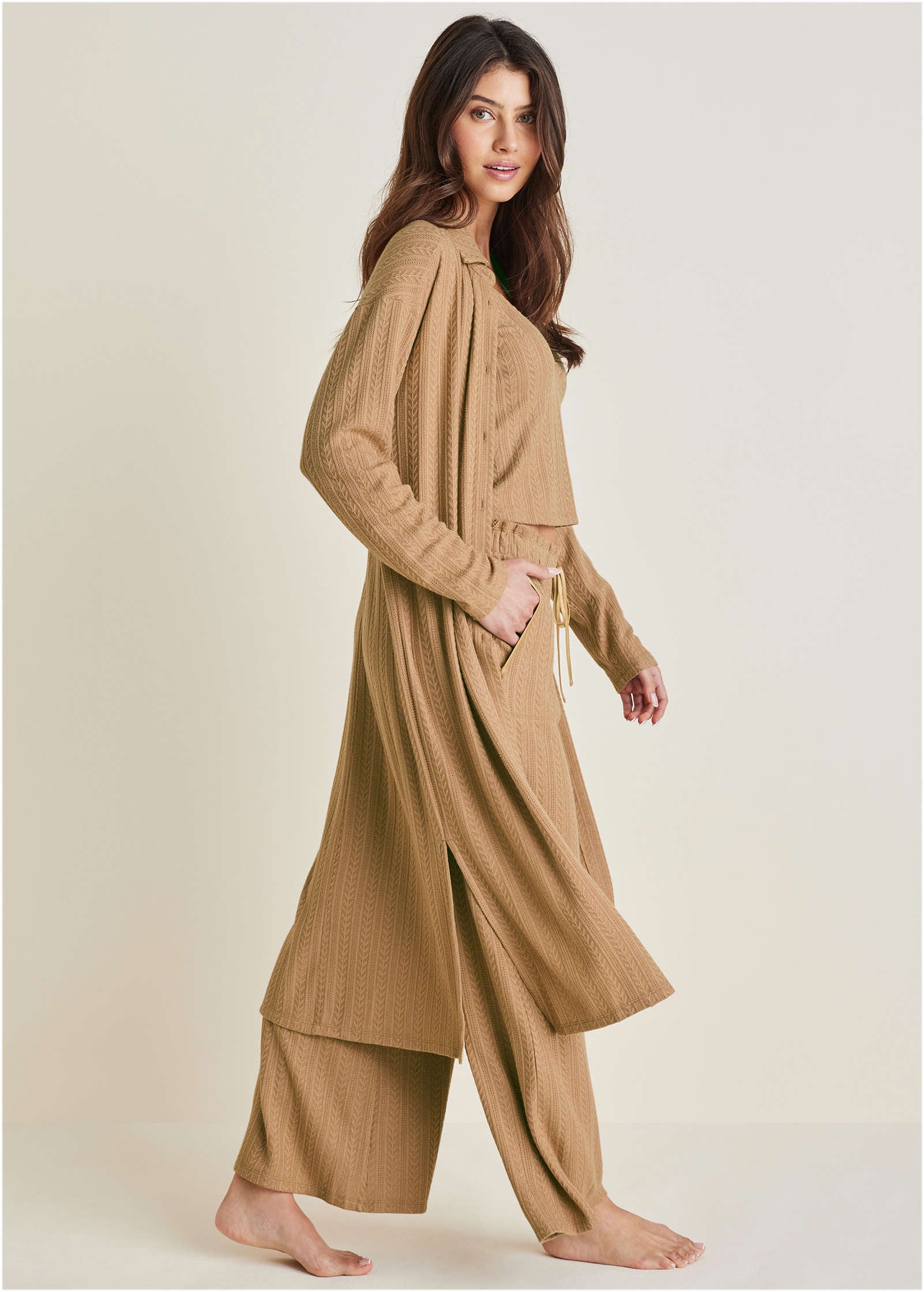 Get the hotel feel right at home with this lightweight lounge set that makes every day feel like checking in for a five-star stay—the only thing missing is room service! This duster. tank and wide-leg pant three-piece features delicately-textured fabric and an effortless fit that give the easy-chic set an elevated look. What are you waiting for? Book your stay now.* Sizes: XS (2). S (4-6). M (8-10). L (12-14). XL (16)* Plus sizes: 1X (18-20). 2X (22-24). 3X (26-28)* Duster. tank and pants* Duster: Collared; Long sleeves; Button closure* Tank: Adjustable spaghetti straps; V-neckline; Cropped* Pants: High waist; Drawstring closure; Side pockets; Wide legs* Rayon/polyester/nylon/spandex. Imported