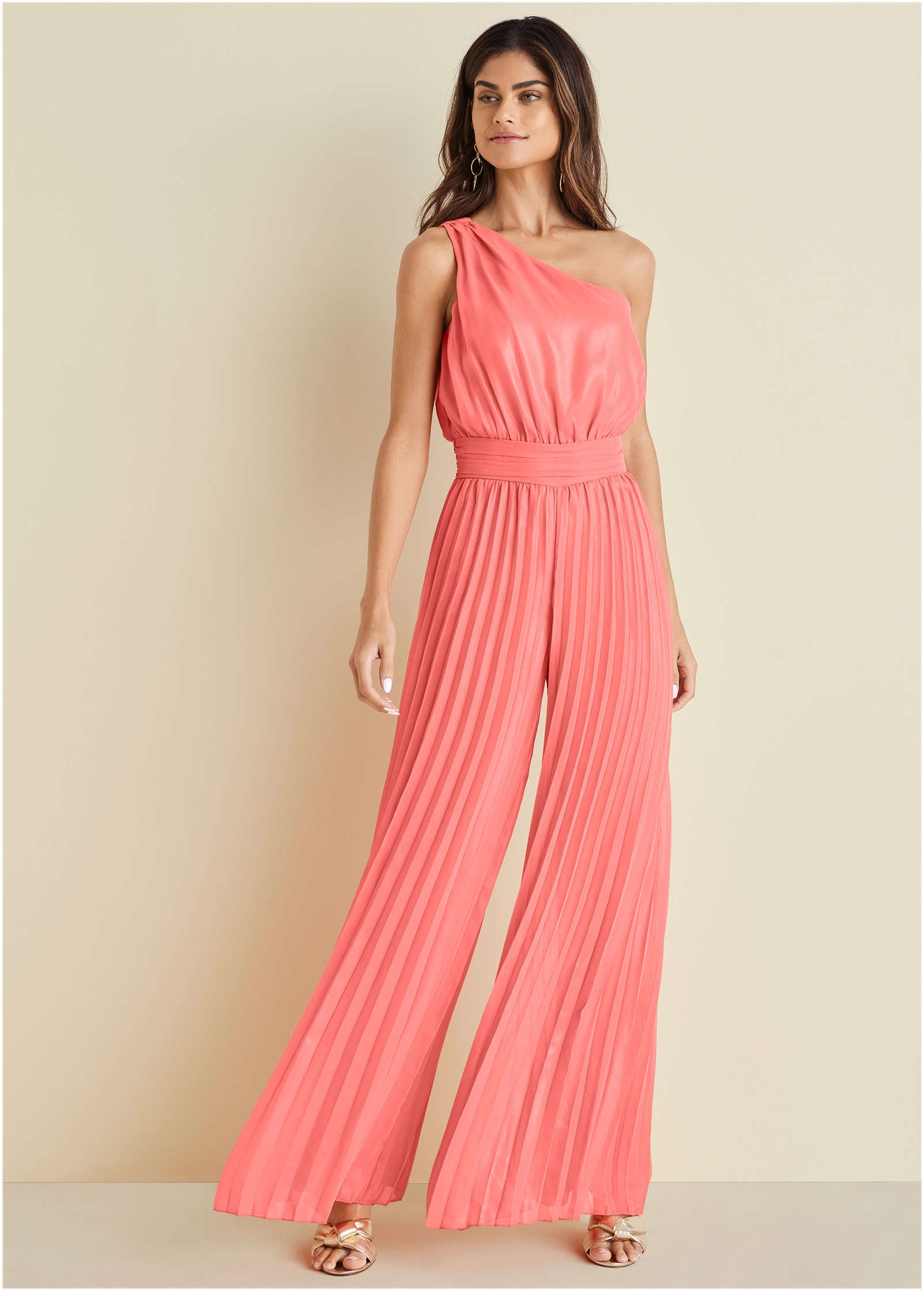 This one-shoulder jumpsuit is a sophisticated stunner. Not only does it have a metallic finish that glimmers when the light hits it. but the wide legs make a serious statement. Pleated fabric is equally polished yet breezy thanks to the billowy silhouette that sways with each step you take. Wear this for a wedding (or any warm-weather event) and you're guaranteed to be the best dressed guest.* Item runs small; size up for a better fit* 32" inseam* Metallic foil* Allover pleats* One shoulder* Wide legs* Invisible side zipper* Fully lined* Polyester. Imported