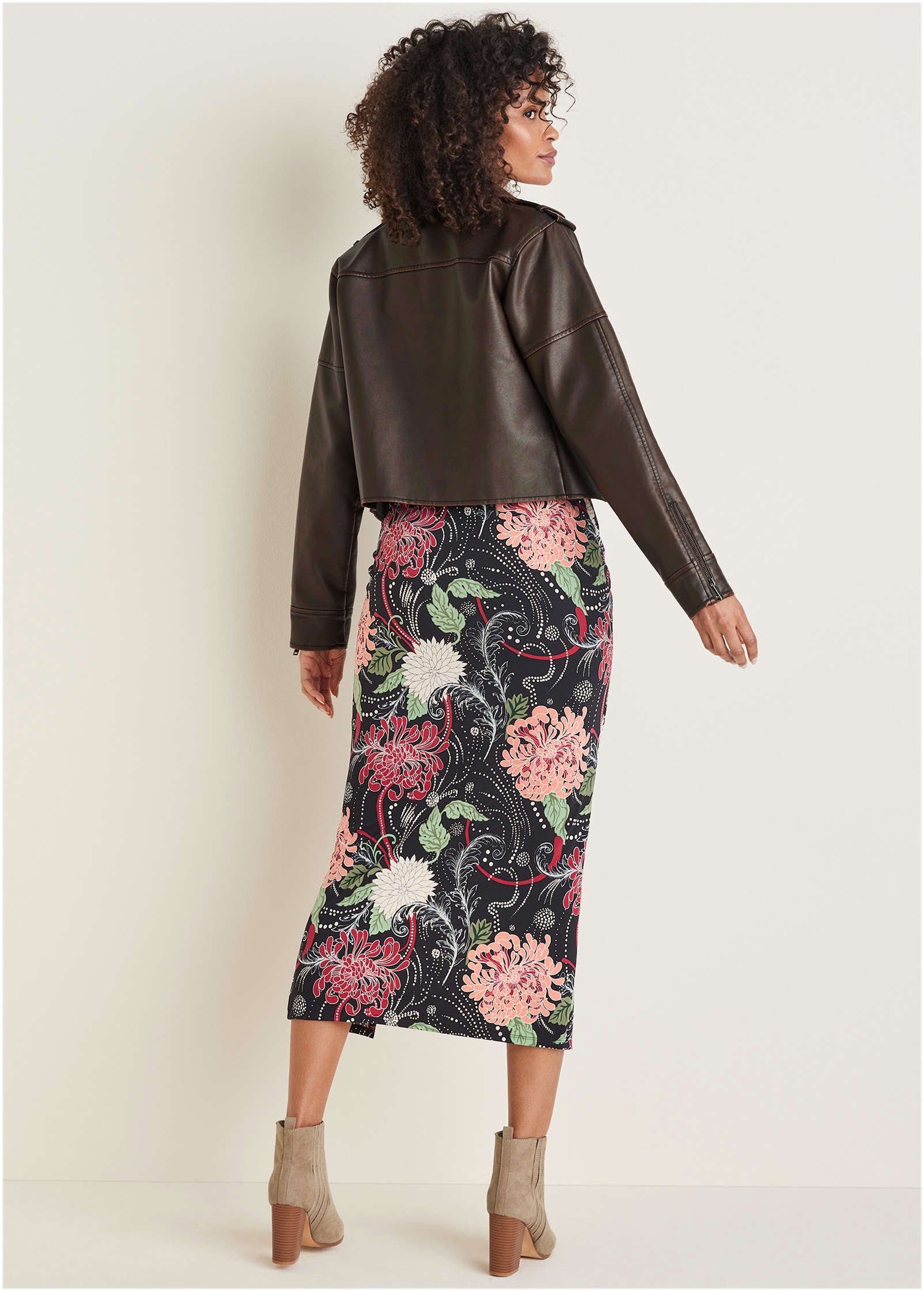 A faux leather jacket that looks and feels like the real deal! Made from buttery-soft fabric that mimics the feel of actual leather. this distressed jacket has the classic look your outfit deserves. Wear it with anything and everything in your closet as the perfect outfit completer. * Sizes: XS (2). S (4-6). M (8-10). L (12-14). XL (16)* Plus sizes: 1X (18-20). 2X (22-24). 3X (26-28)* Collared neckline* Long sleeves * Front zipper closure* Zippered sleeves* Zippered front pockets* Cropped* Fully lined* Fabric does not have stretch* Polyester/viscose/elastane. Imported