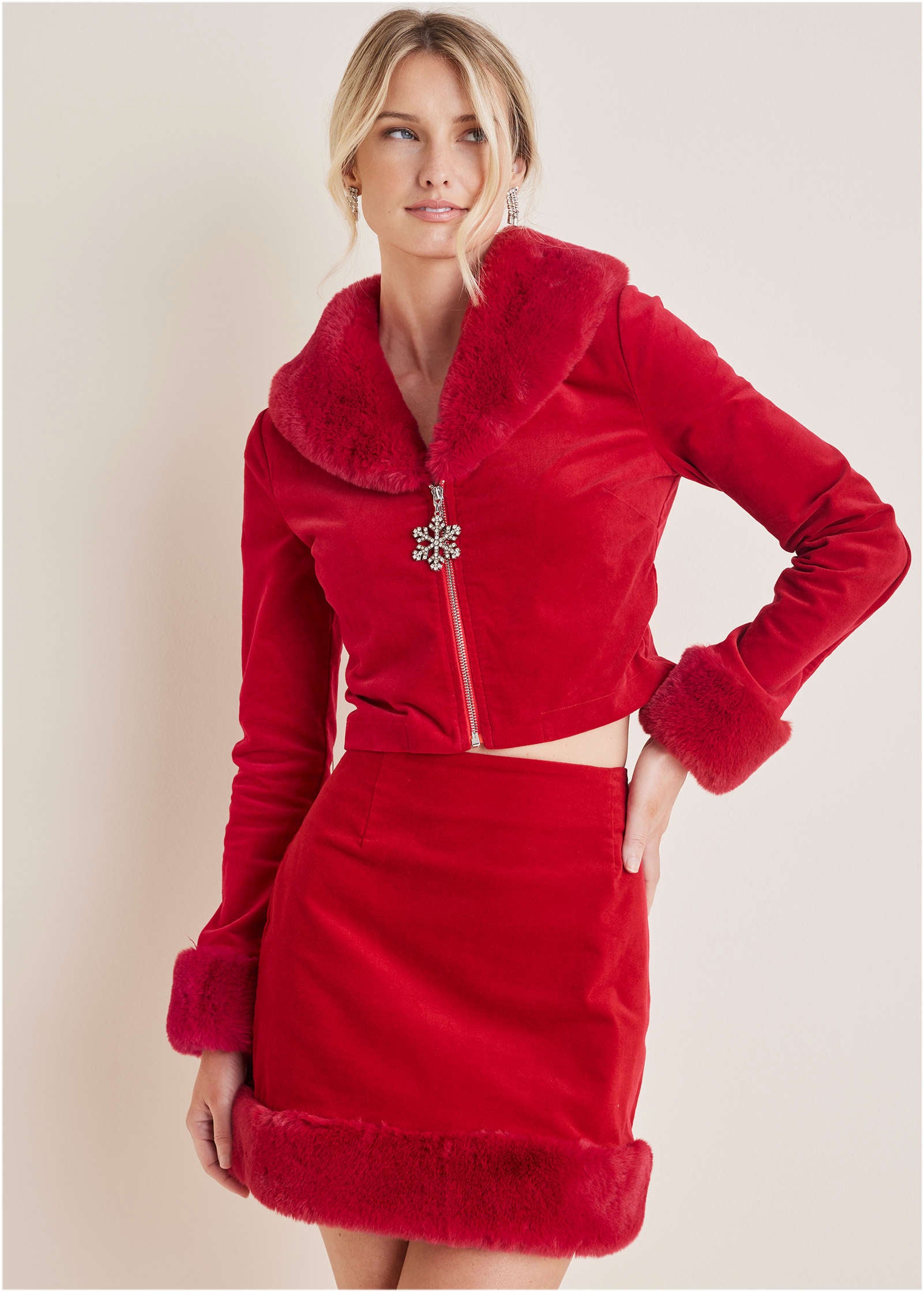 Make your holiday shopping list. check it twice. and make sure this jacket is on it! This velvet stunner is as festive as they come with plush faux-fur trim along the neckline and sleeves. plus a sparkly snowflake zipper pull for a touch of glam. Pair it with the matching mini skirt for the ultimate holiday set. dress it down with jeans or toss it over your party dress for your next seasonal soiree.* Sizes: XS (2). S (4-6). M (8-10). L (12-14). XL (16)* Faux fur trim* Zipper front closure* Rhinestone snowflake zipper pull* Cotton/spandex. Imported
