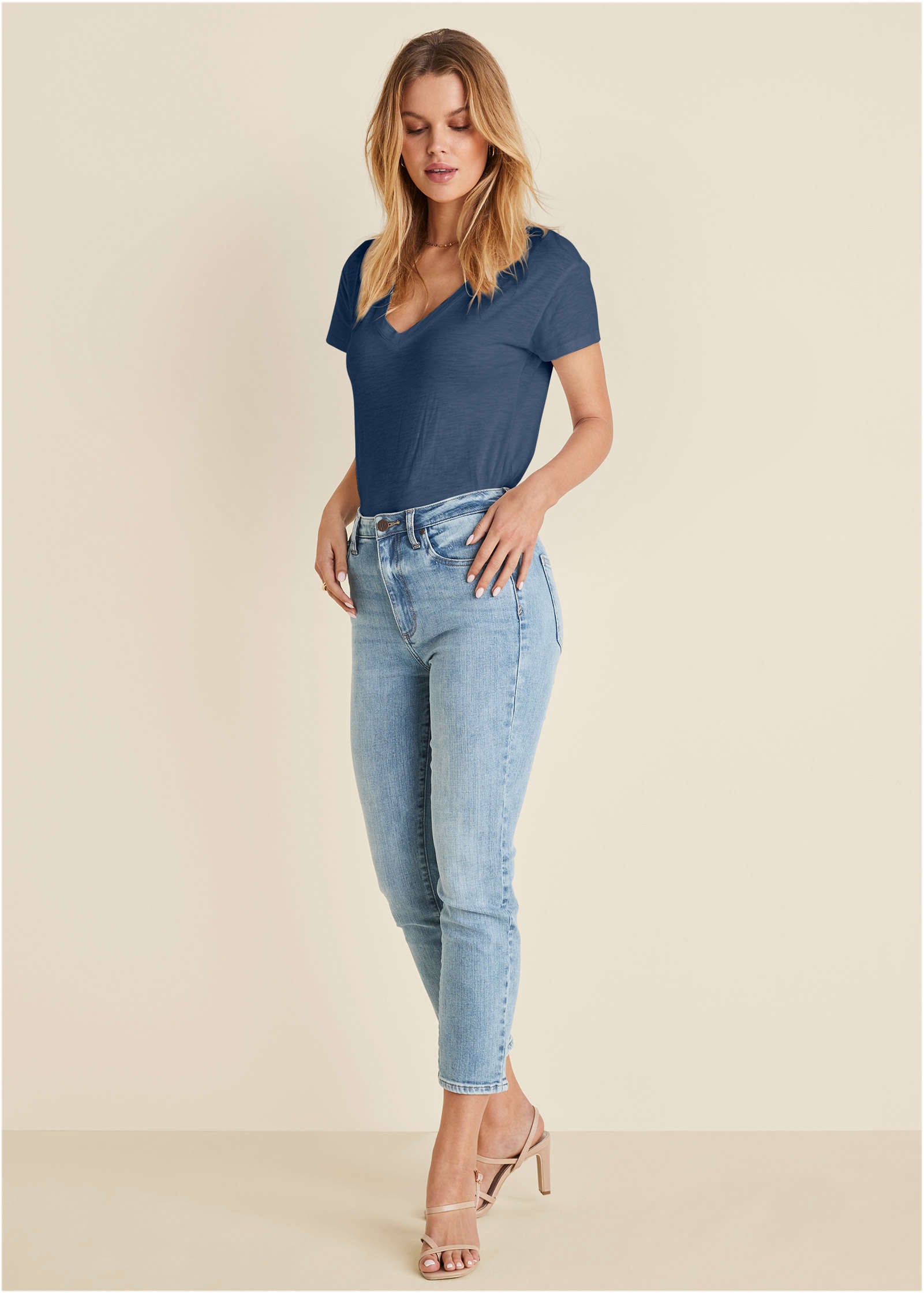 Let's be clear. there's nothing "basic" about this V-neck tee. It may be a versatile wardrobe staple and a styling dream. but the attention to detail makes it special. We gave it a perfectly relaxed fit and rounded hem for a feminine and elevated feel. Plus. it's made in our Weekend Slub cotton. so it's live-in soft and lightweight with just the right amount of stretch for a laid-back feel 24/7. * Sizes: XS (2). S (4-6). M (8-10). L (12-14). XL (16)* Plus sizes: 1X (18-20). 2X (22-24). 3X (26-28)* 25" from shoulder* Short sleeves* V-neck* Relaxed fit* Weekend Slub (Organic cotton. Imported)