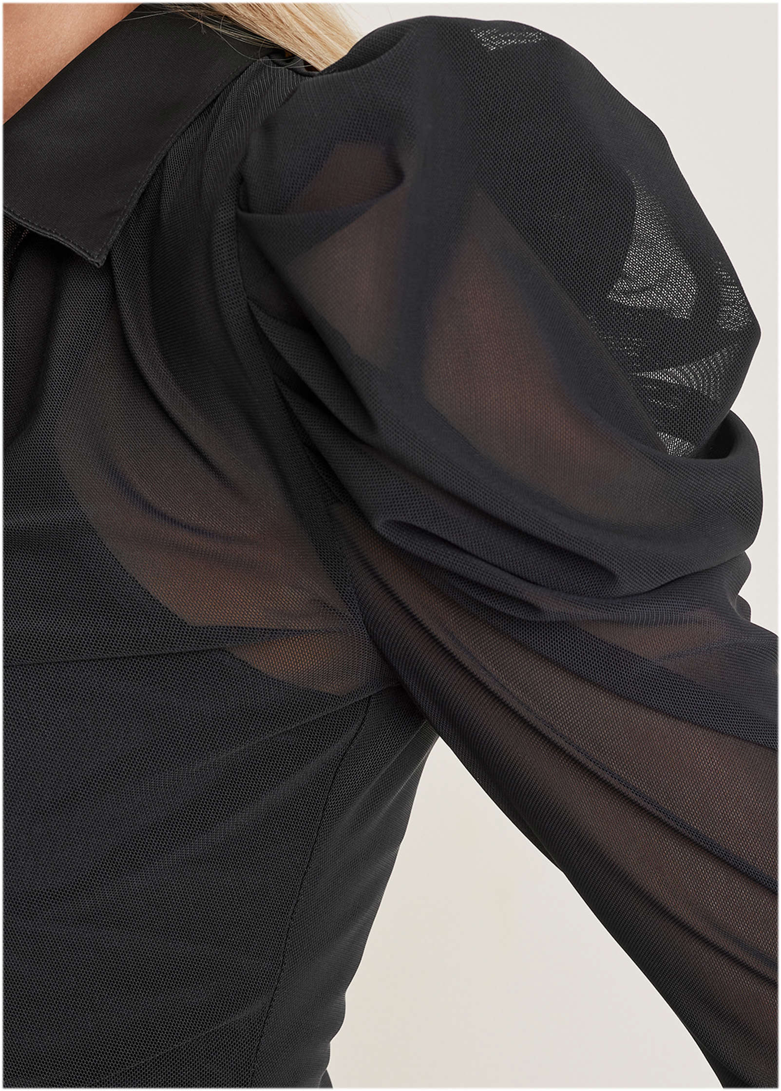This top features a sheer mesh fabric and bold sleeves that add modernity to the traditional button-up design. The lightweight material allows for breathability and a comfortable fit. while the button-up front offers versatility for dressing up or down. Perfect for layering over a camisole or bra. this top brings a fresh. elevated element to your look.* Sizes: XS (2). S (4-6). M (8-10). L (12-14). XL (16)* Collared neckline* Runs small; size up for a better fit* Puff shoulders* Long sleeves* Button front closure* Sheer* Fabric has stretch* Polyester/spandex. Imported