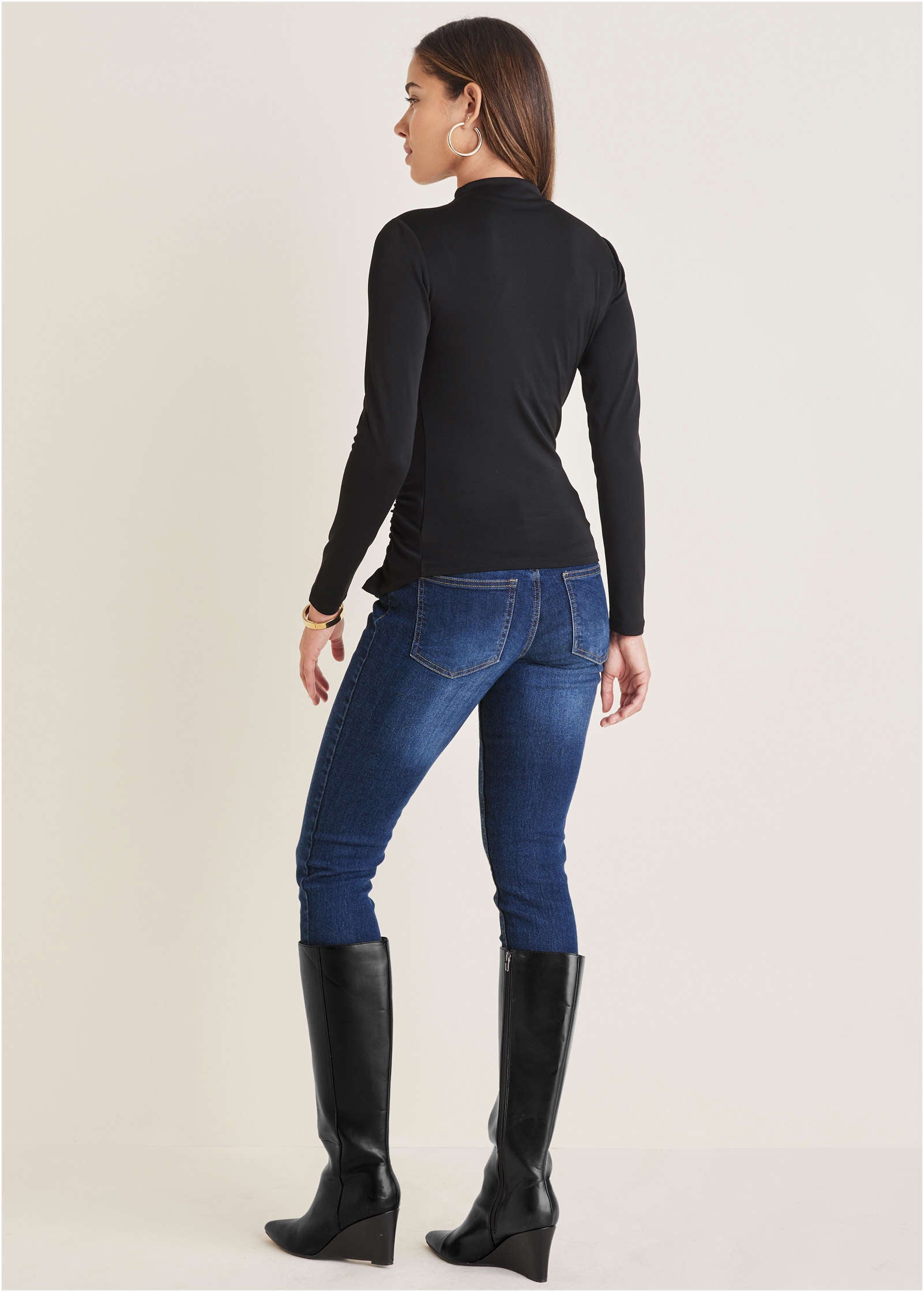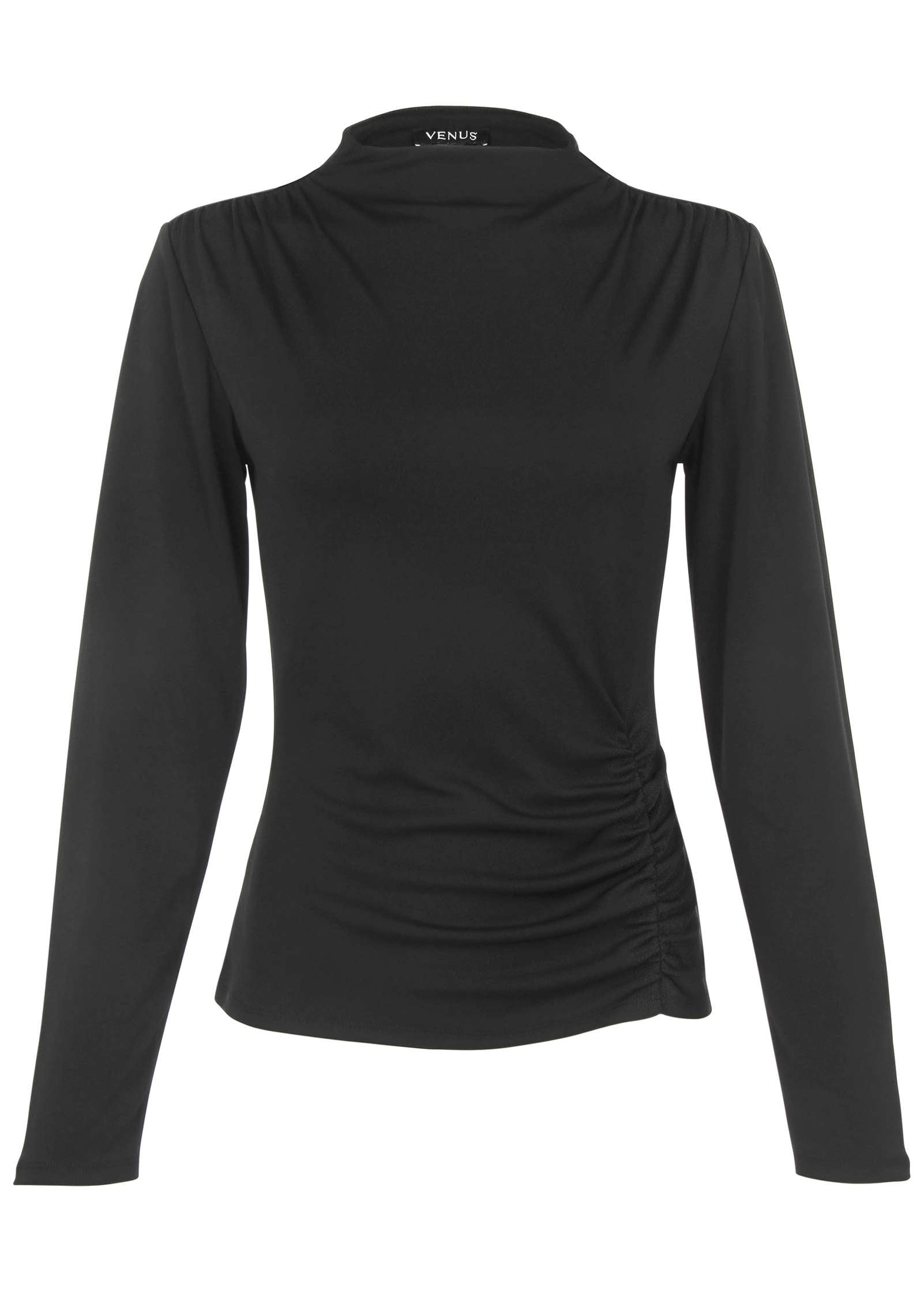 This gathered long-sleeve blouse is a new take on your favorite basic! Its ruched sides create a slimming look that flatters your middle. The super soft and smooth fabric makes it perfect for layering with a denim or faux leather jacket. but with standout detailing. it stands out worn solo.* Sizes: XS (2). S (4-6). M (8-10). L (12-14). XL (16)* Plus sizes: 1X (18-20). 2X (22-24). 3X (26-28)* Mock neckline* Long sleeves* Fabric has stretch* Polyester/spandex. Imported