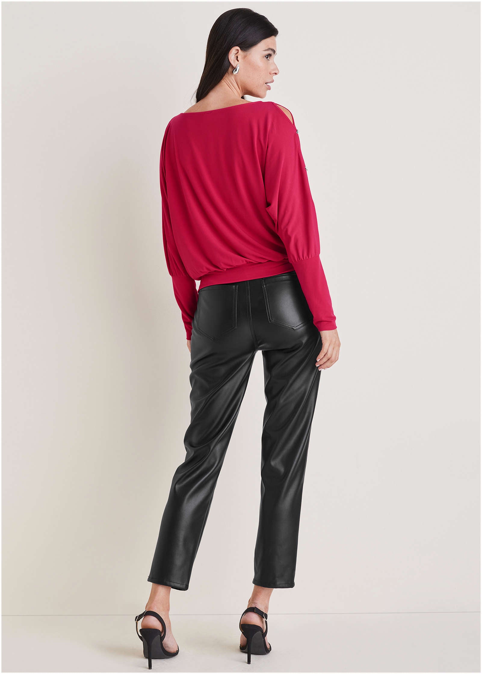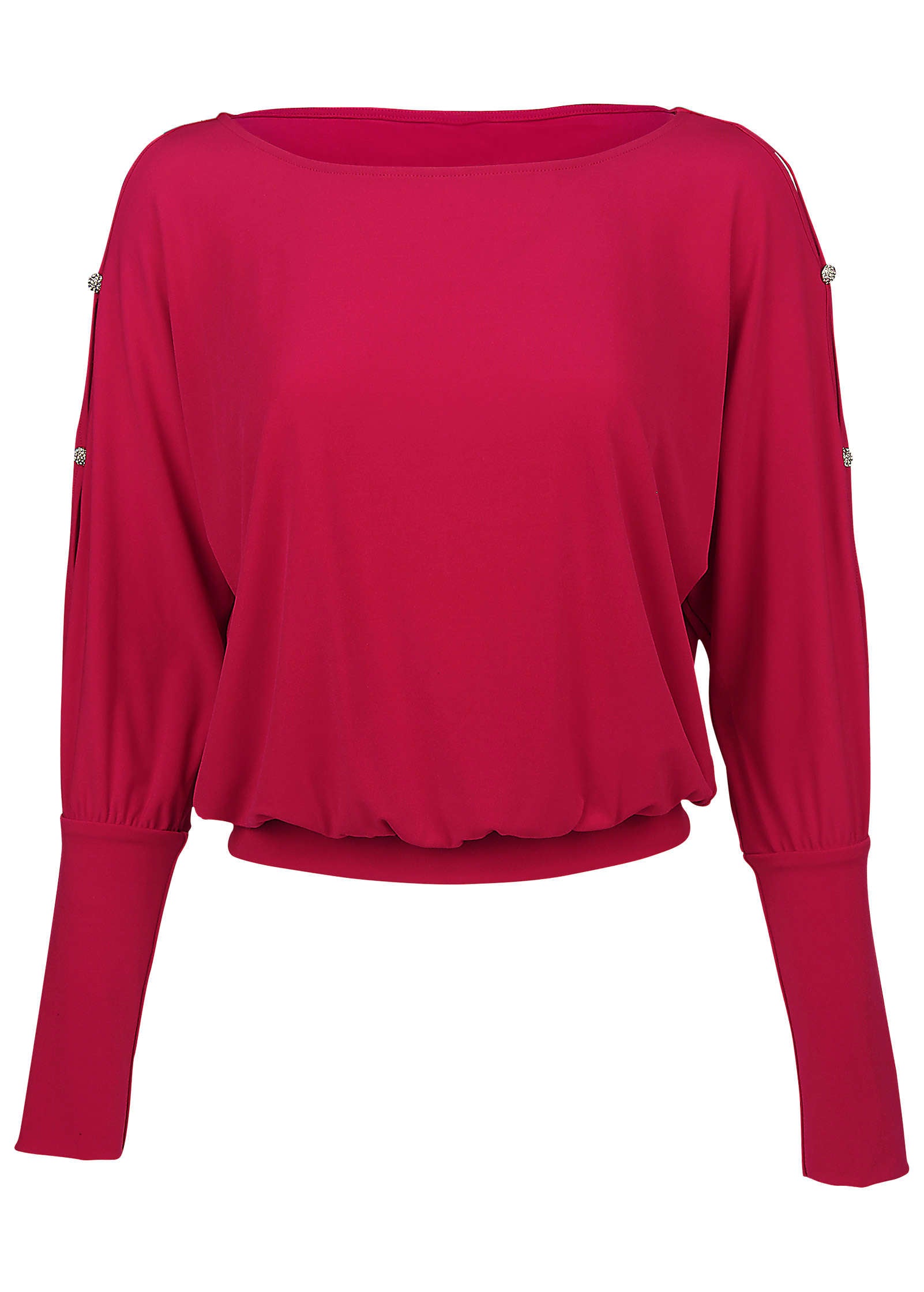 This cold-shoulder top is a lesson in subtle sparkle. For daytime or evenings when sequins are overkill. the rhinestone embellishments on the cutout sleeves provide just enough shine to add a little glam to your look. We love it styled with sleek faux-leather bottoms. and denim is always a favorite pairing too.* Sizes: XS (2). S (4-6). M (8-10). L (12-14). XL (16)* Plus sizes: 1X (18-20). 2X (22-24). 3X (26-28)* Cold-shoulder style* Long sleeves* Rhinestone embellishment on sleeves* Polyester/elastane. Imported