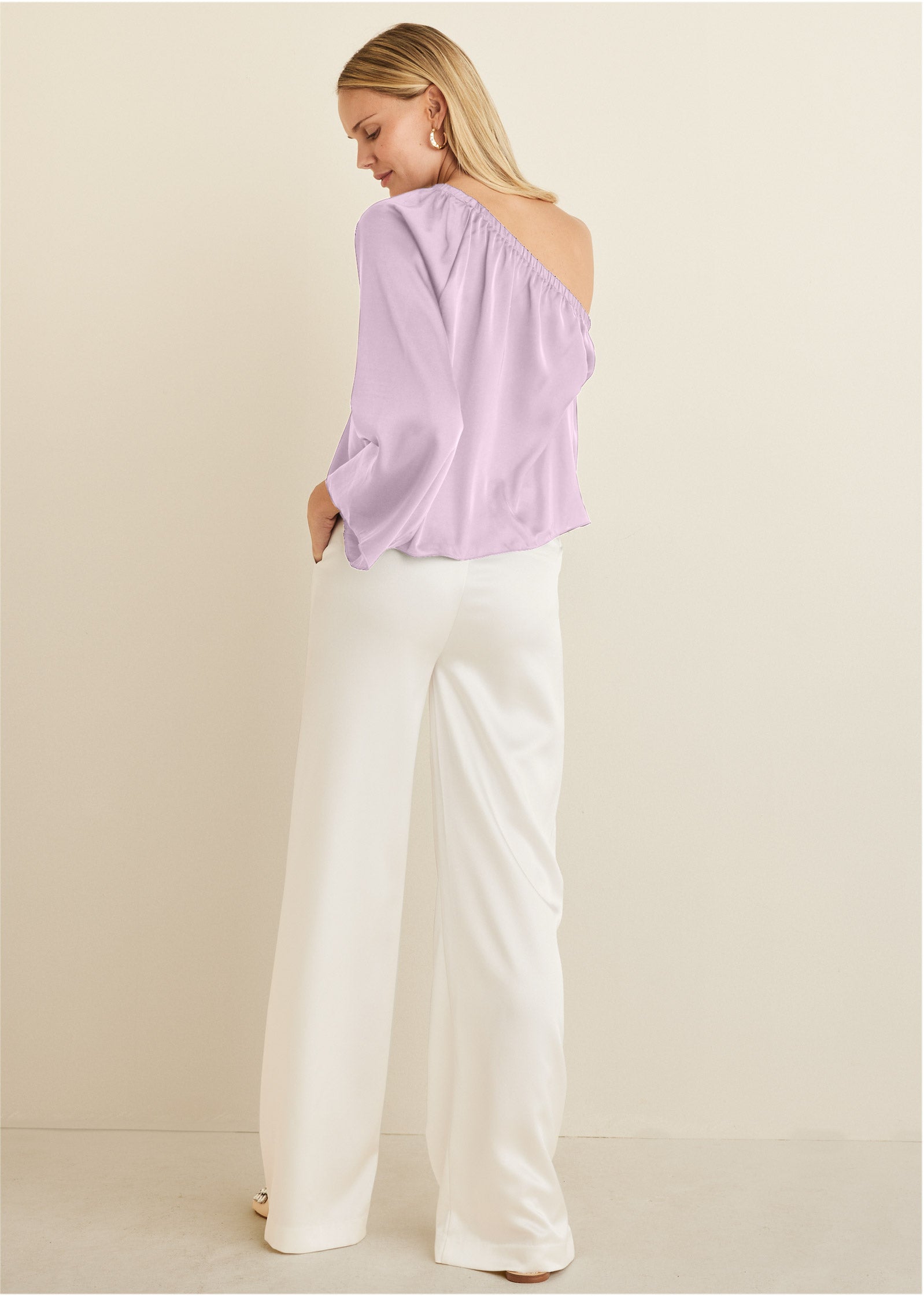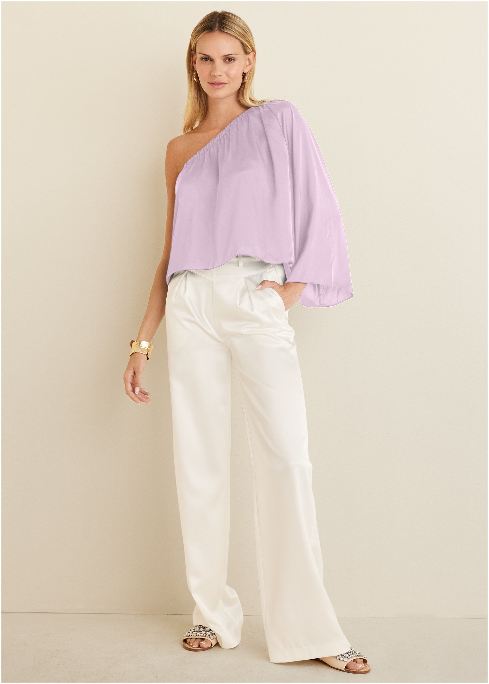 This is the top to have in your closet for when you want to look like an 11/10 without putting in that much effort. Toss on this elegant one-shoulder stunner with a draped bell sleeve and everyone will do a double take. thinking you're somebody they should know. Done in our EffortLuxe fabric. it has a silky feel. subtle sheen and gorgeous drape with just a hint of stretch (read: doesn't wrinkle).* Sizes: XS (2). S (4-6). M (8-10). L (12-14). XL (16) * 21" from shoulder* One-shoulder* Long sleeve* Relaxed fit* For printed styles: Print placement may vary * EffortLuxe (Poly/spandex. Imported)