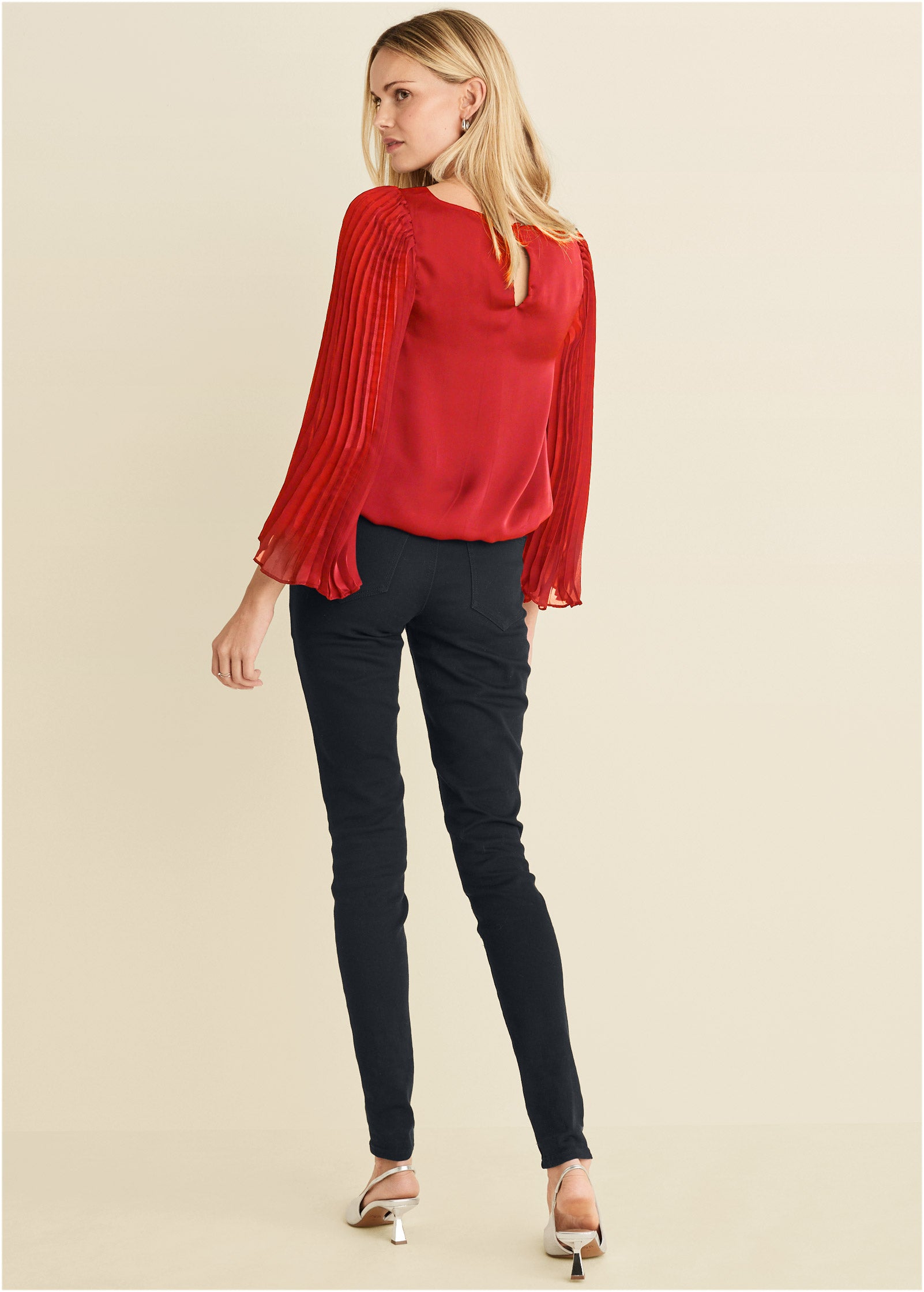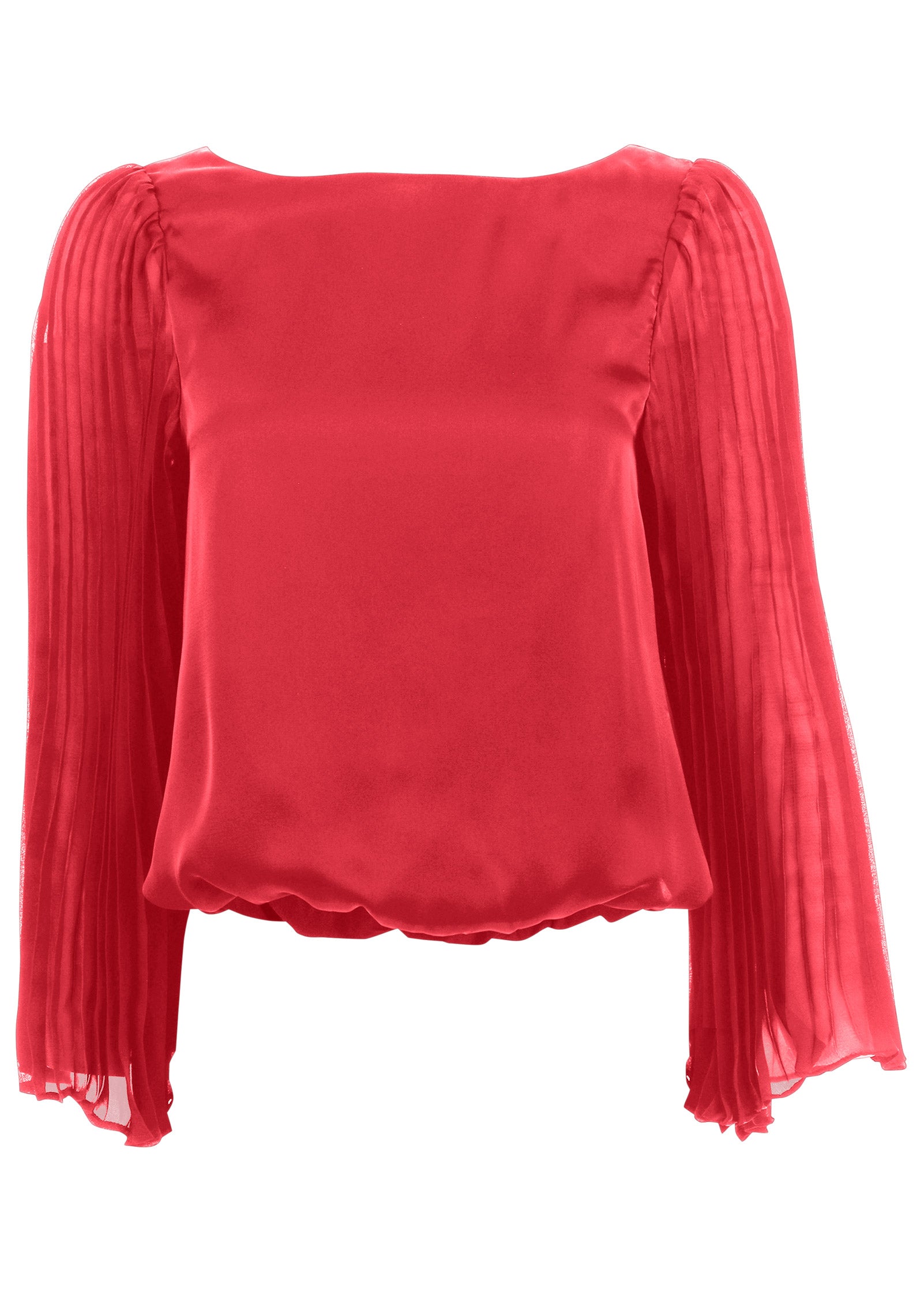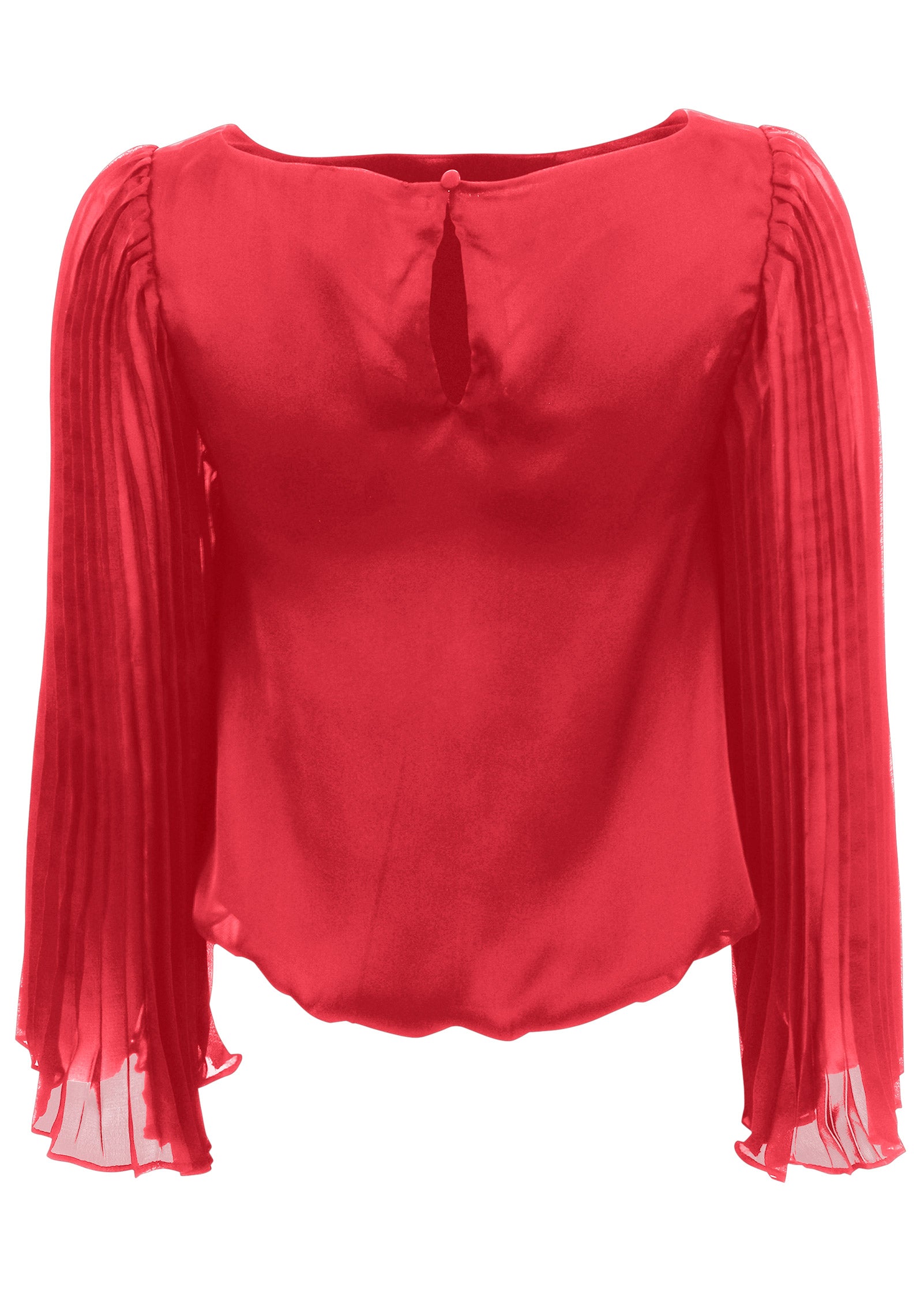 This blouse is the definition of understated elegance. It doesn't have any loud. over-the-top embellishments. but the luxe details speak volumes. Satiny fabric is smooth to the touch. while sheer statement sleeves feature eye-catching pleats that fan out ever so delicately as the floaty fabric moves. In fact. the sleeves are so mesmerizing. don't be surprised if all eyes end up on you. * Runs small; size up for a better fit* 22" approx. length; varies by size * Fabric does not have stretch * Back button closure * Partially lined * Pleated trumpet sleeves * Poly. Imported