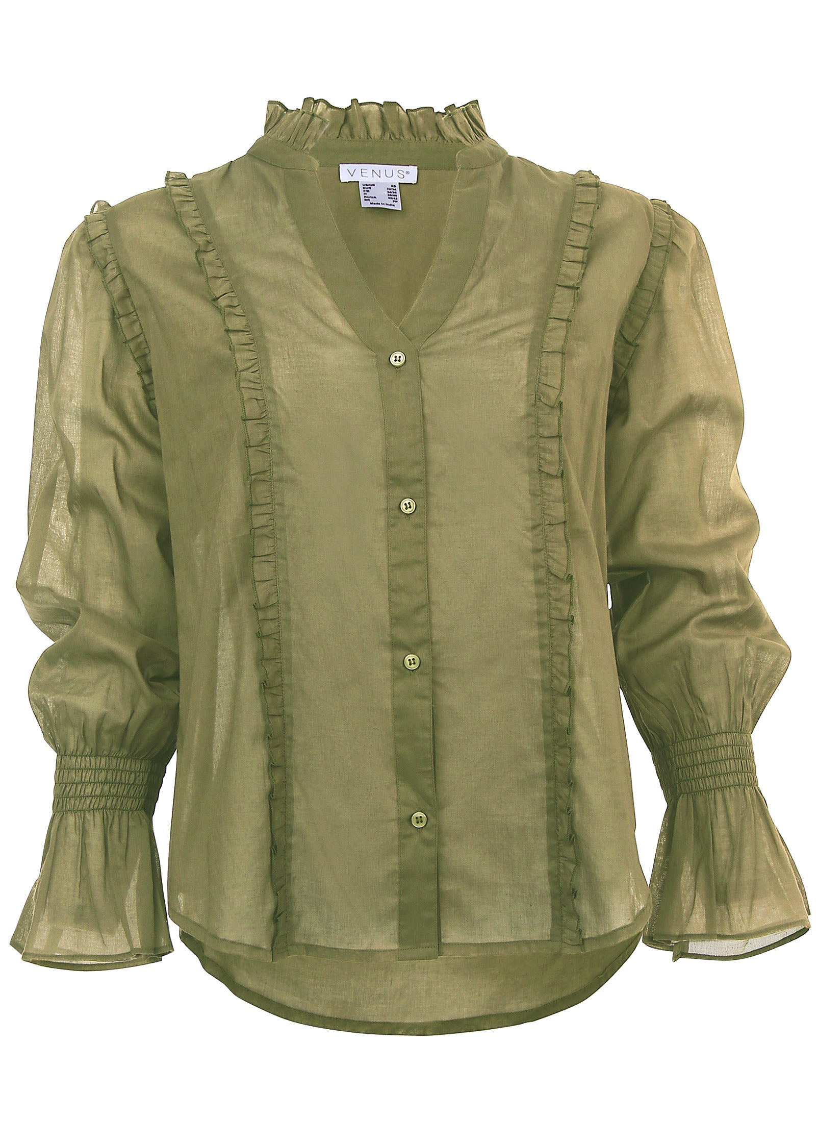Get ready to fall for this romantic top. From the ruffle trim along the collar and down the front. to the fluted sleeves. there are so many feminine details to love. Done in our ultra-lightweight Whisper Cotton. it has a barely-there sheer look and next-to-nothing feels that makes it a perfect choice for hot weather.* Sizes: XS (2). S (4-6). M (8-10). L (12-14). XL (16)* 25.5" from shoulder* Long sleeves* V-neckline* Button front closure* Smocked sleeves* Whisper Cotton (Cotton CmiA. Imported)