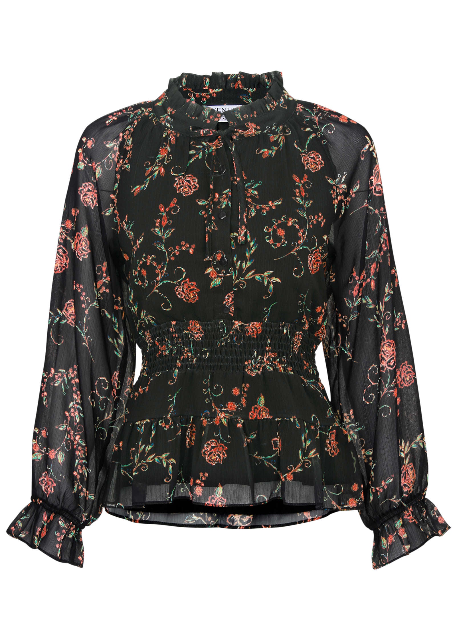 This blouse features a chic mock neck and an eye-catching print that adds personality to any outfit. The smocked waist creates a flattering silhouette. cinching you in at just the right spot while adding a touch of texture. Light and airy with just the right amount of coverage. this blouse is perfect for layering or wearing on its own for a polished. effortlessly stylish look.* Sizes: XS (2). S (4-6). M (8-10). L (12-14). XL (16)* Mock neckline* Ruffle detail on neck* Long sleeves* Smocked waist* Peplum style* Sheer* Polyester. Imported