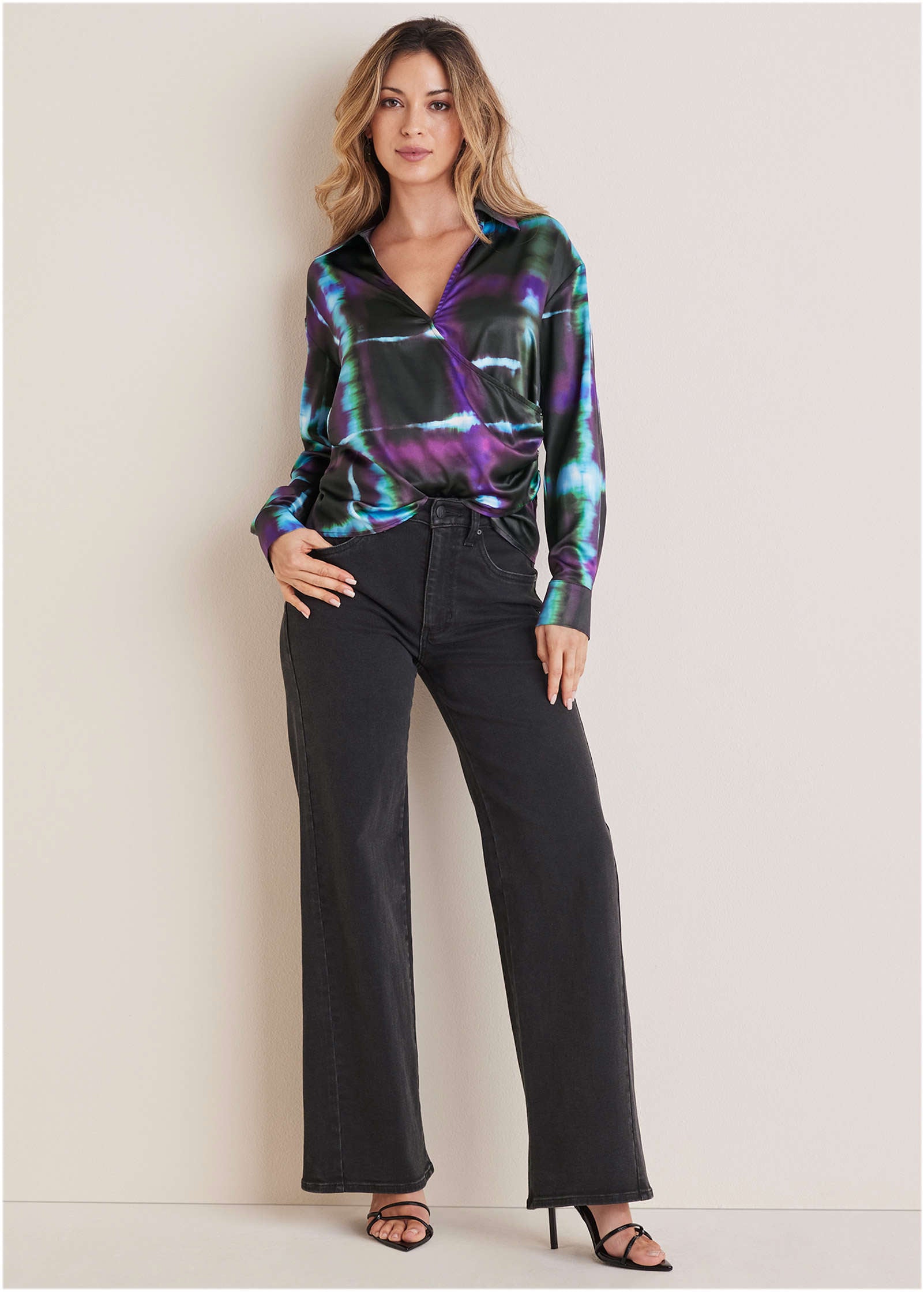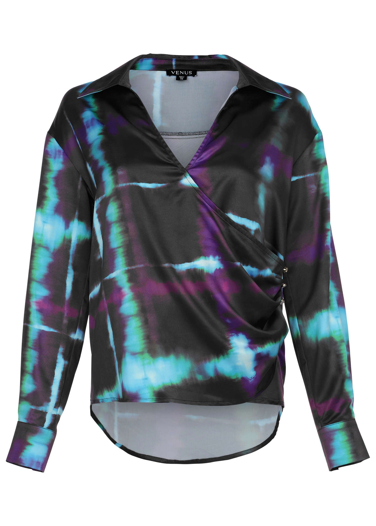 You've never seen plaid like this before. Leaning into the tie-dye-esque aura print trend. this top offers a fresh take on the cool-weather classic. Vibrant blues and purples pop against the black background. giving the illusion of a light leak. Style this universally-flattering wrap style top with everything from a denim maxi skirt to faux-leather cargo pants for a look that will make heads turn.* Available in plus sizes* Wrap style* Long sleeves* Polyester/spandex. Imported