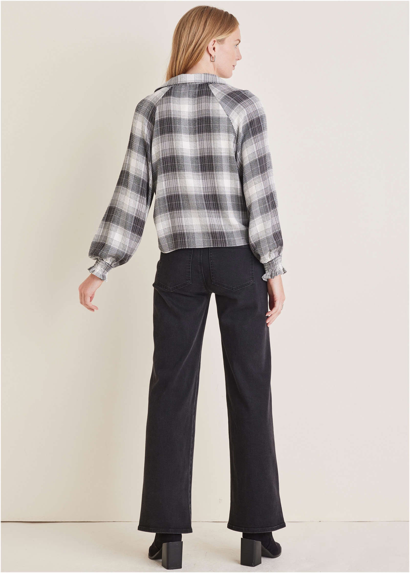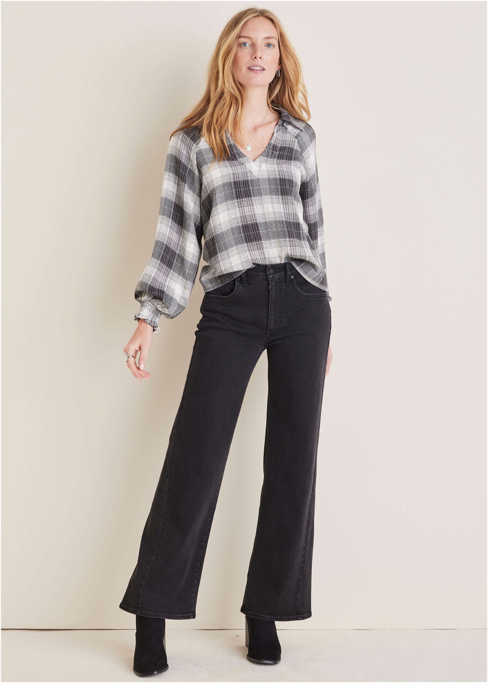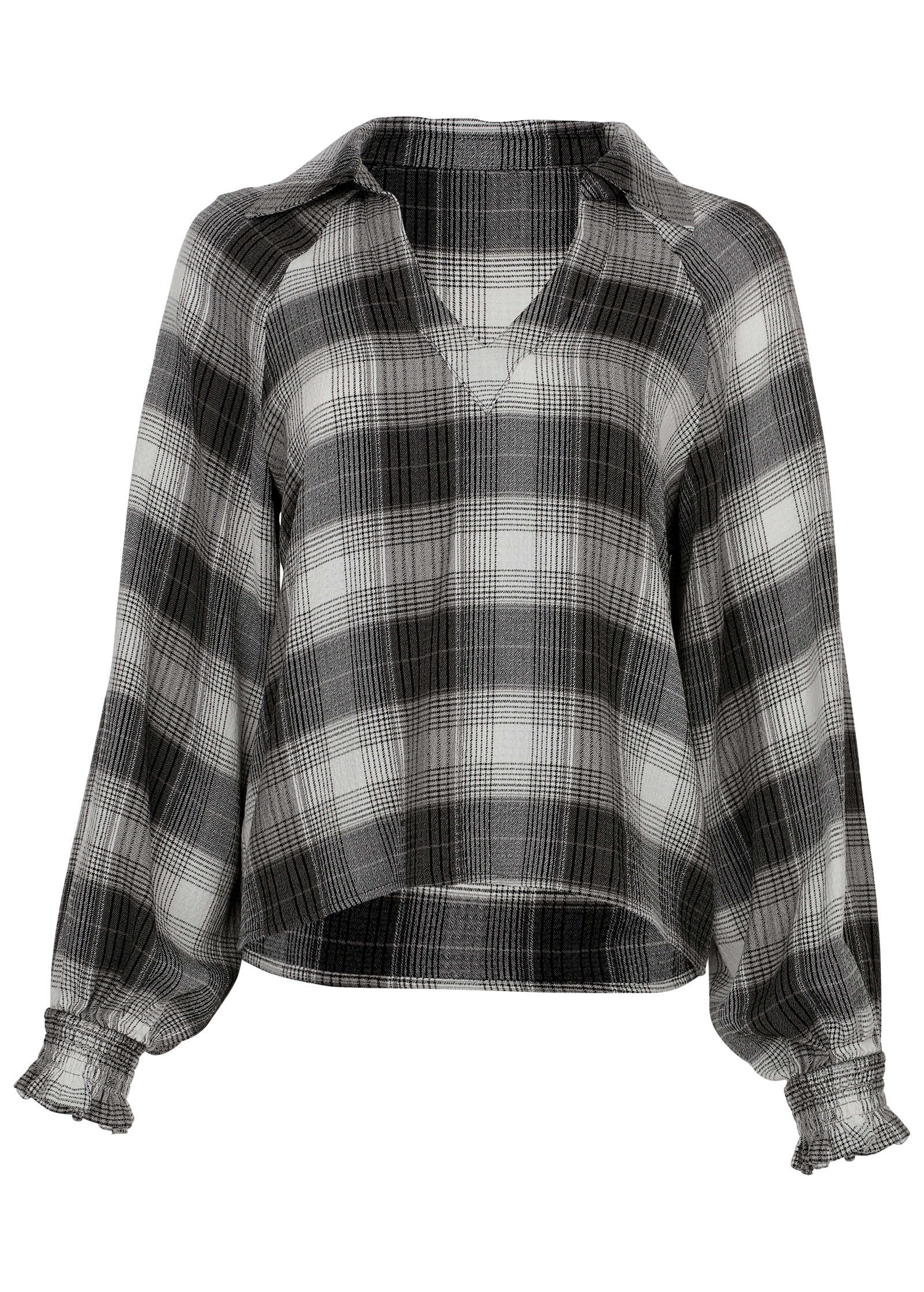 Plaid for fall? Groundbreaking! We put a new elevated spin on your favorite fall flannel. The soft. brushed plaid fabric offers cozy comfort that effortlessly transitions between seasons. With a loose silhouette and flowy sleeves. you get the comfortable. laidback appeal of a traditional flannel but with a refined design. It is your go-to for effortless. everyday sophistication.* Sizes: XS (2). S (4-6). M (8-10). L (12-14). XL (16)* Plus sizes: 1X (18-20). 2X (22-24). 3X (26-28)* Collared neckline* V-neckline* Long sleeves* Ruffle sleeve detail* Rayon/polyester/spandex. Imported
