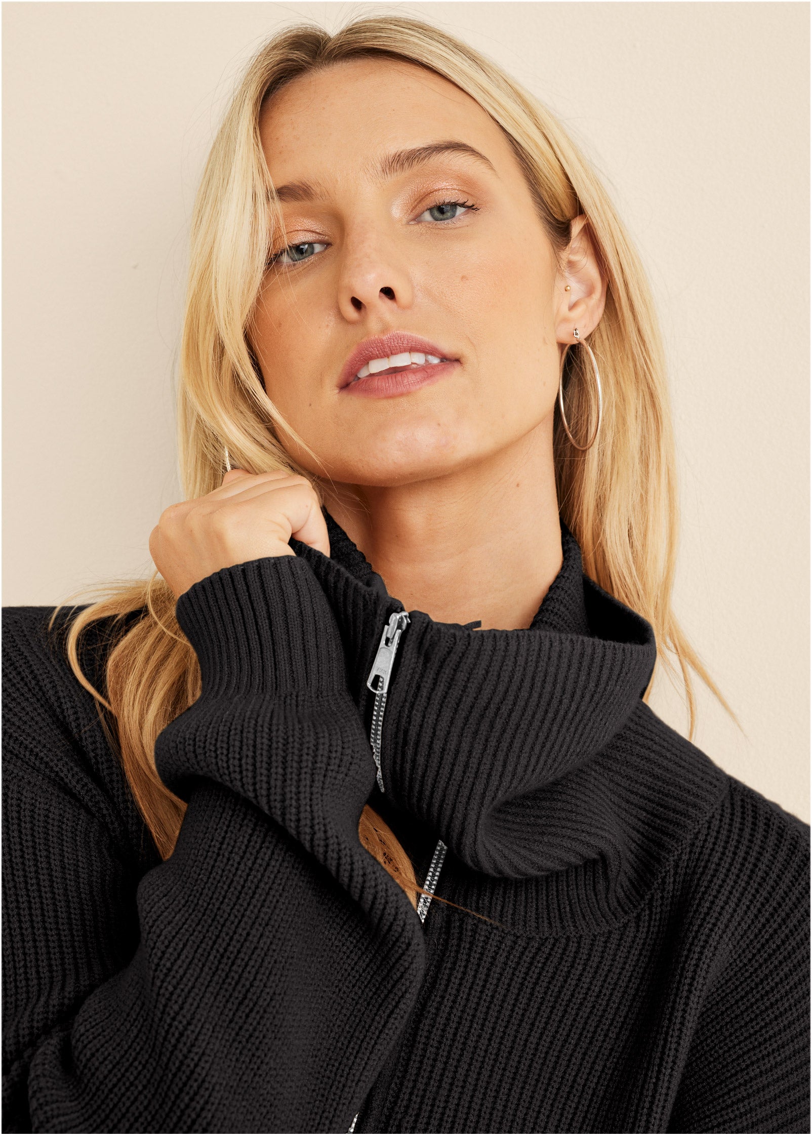 We love when cozy-comfort meets easy-elegance and this cropped quarter-zip sweater is exactly that. It's classic. yet the oversize foldover collar makes it a subtle standout. It's perfectly slouchy yet polished at the same time. Pair this knit with high-waist trousers for a chic work look or team with comfy joggers for off-duty moments.* Sizes: XS (2). S (4-6). M (8-10). L (12-14). XL (16)* Long sleeves* Quarter-zip closure* Relaxed fit* 18" from shoulder* Viscose/poly/nylon. Imported