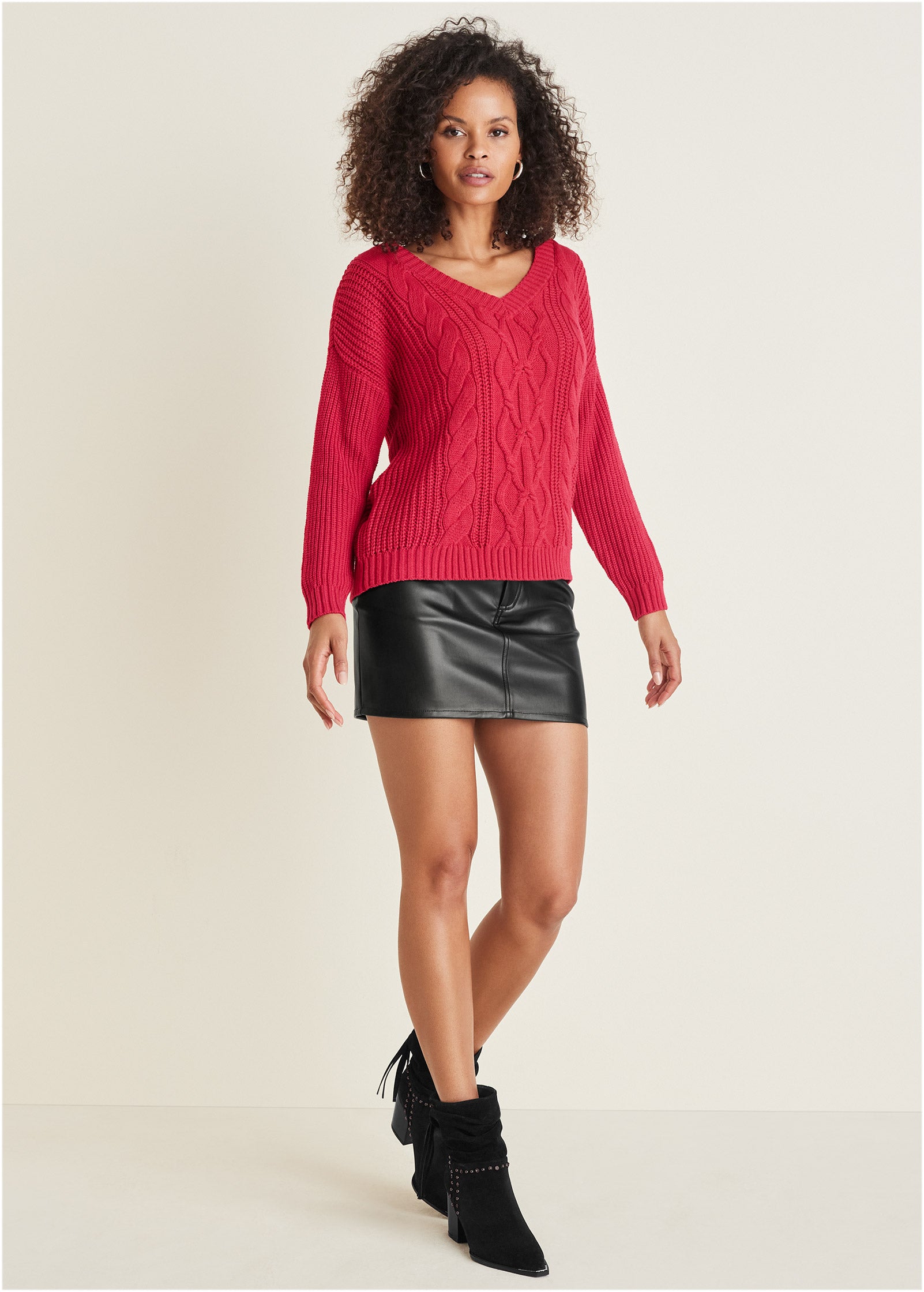 The forecast is calling for sweater weather! This cable knit sweater is the classic your wardrobe needs. With a traditional cable design and v-neckline. it's the sweater that pairs well with all your favorite skirts and jeans — you can't go wrong. * Sizes: XS (2). S (4-6). M (8-10). L (12-14). XL (16)* Plus sizes: 1X (18-20). 2X (22-24). 3X (26-28)* V-neckline* Long sleeves* Cable knit * Acrylic. Imported