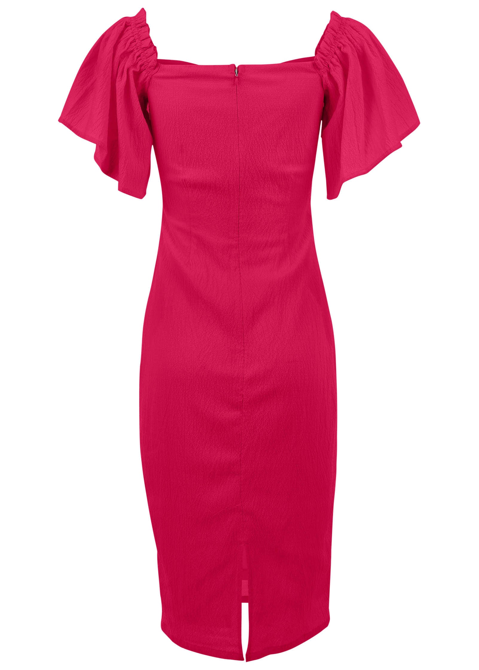 Floaty flutter sleeves up the feminine feel of this off-the-shoulder midi dress. That and the sweetheart-shaped neckline which perfectly frames your décolletage. This sheath silhouette skims over your curves. landing below the knee for a sophisticated look. Reach for it for weddings. date nights. showers. or any other dressed-up occasion.* Item runs small; Size up for a better fit* Off-the-shoulder* Midi length. 36.5"* Invisible back zipper closure* Fully lined* Polyester/Lycra. Imported