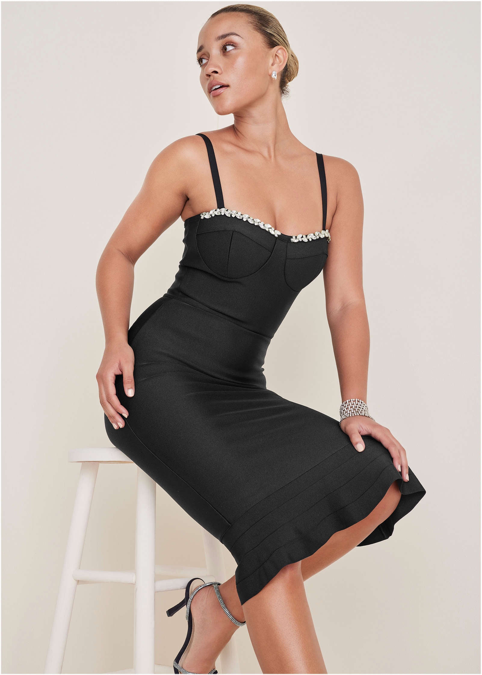 Caution: curves ahead in this bold bodycon dress. Hugging your figure from top to just below the knee where it flares out with a feminine ruffle to create an hourglass shape. this sleek piece does the most to put your curves in the spotlight. With a sultry bustier-style design that's trimmed with glam rhinestones. you'll twinkle all night just like the star you are.* Sizes: XS (2). S (4-6). M (8-10). L (12-14). XL (16)* Bodycon fit* Adjustable spaghetti straps* Back zipper closure* Knee length* Rhinestone embellishment* Polyester/spandex. Imported
