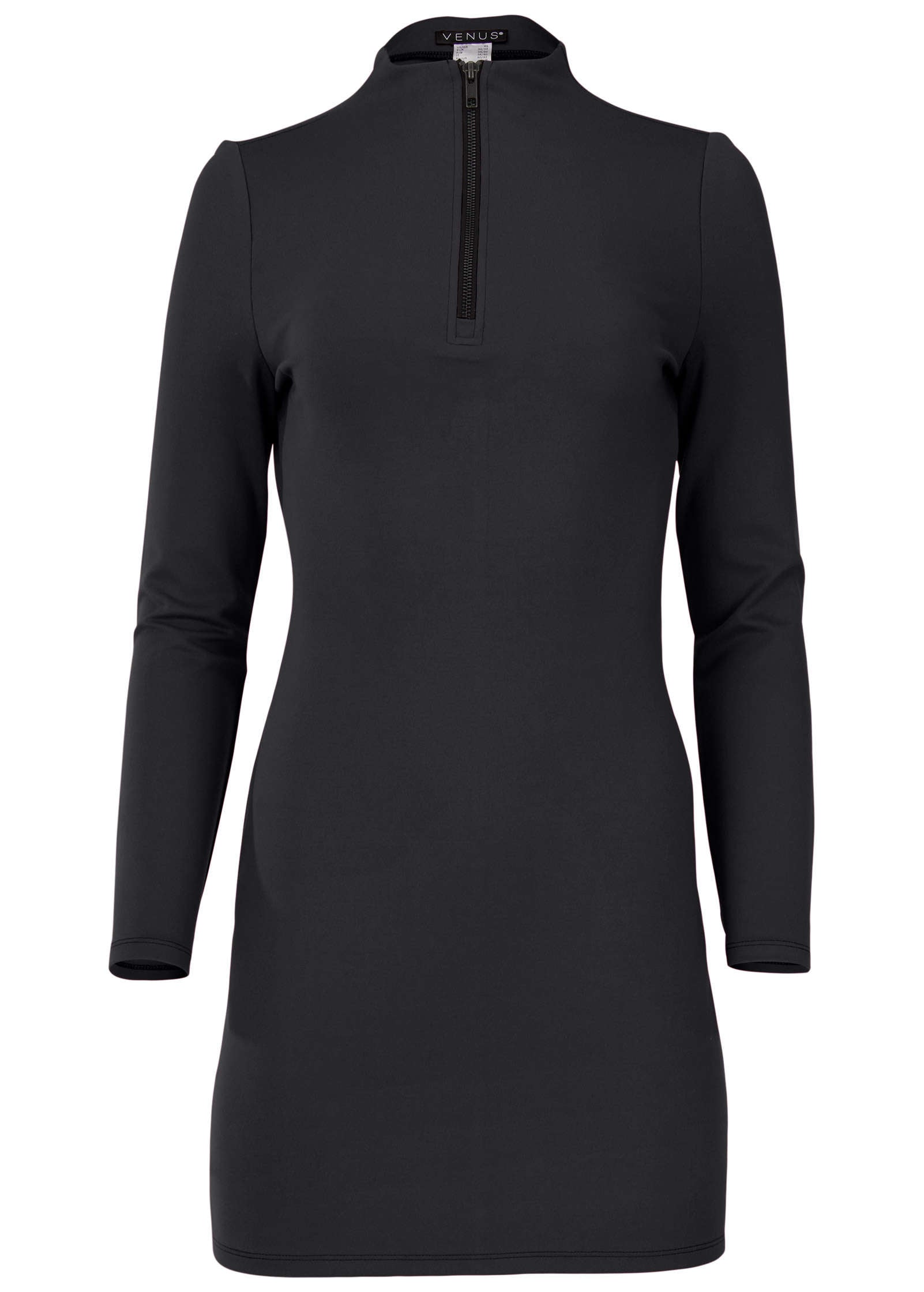 This modern mini dress has a sporty vibe with a mock neck and quarter-zip front. It's cut close to the body in an almost-A-line shape. skimming over your figure to create a clean silhouette. Done in our Ponte Perfect fabric. it looks refined. but feels relaxed thanks to low-key stretch that's ultra comfy and made to flatter.* Sizes: XS (2). S (4-6). M (8-10). L (12-14). XL (16)* Mini length. * Long sleeves* Mock neck* Quarter zip closure* Ponte Perfect (Rayon/nylon/spandex. Imported)
