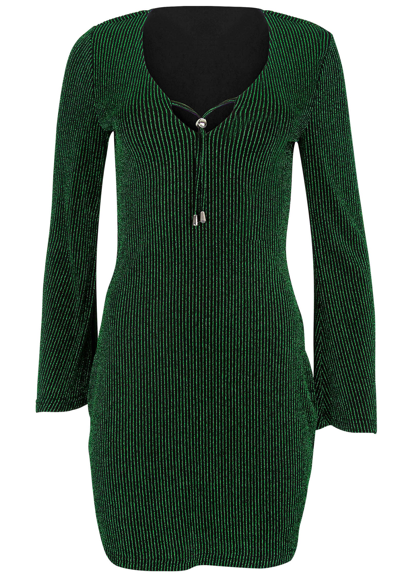We're going out! That's exactly what you'll say once this stunner of a dress arrives on your doorstep because this mini deserves to be shown off. Metallic fabric shines with every move. while fluid bell sleeves add a playful spin to the curve-hugging look. The bold finishing touch: a toggle closure with glam gold hardware that highlights the low-cut neckline. Grab your dancing heels and get ready to party!* Sizes: XXS (0). XS (2). S (4-6). M (8-10). L (12-14). XL (16)* Available in petite sizes* V-neck* Long sleeves* Mini length* Fully lined* Nylon/polyester/spandex. Imported