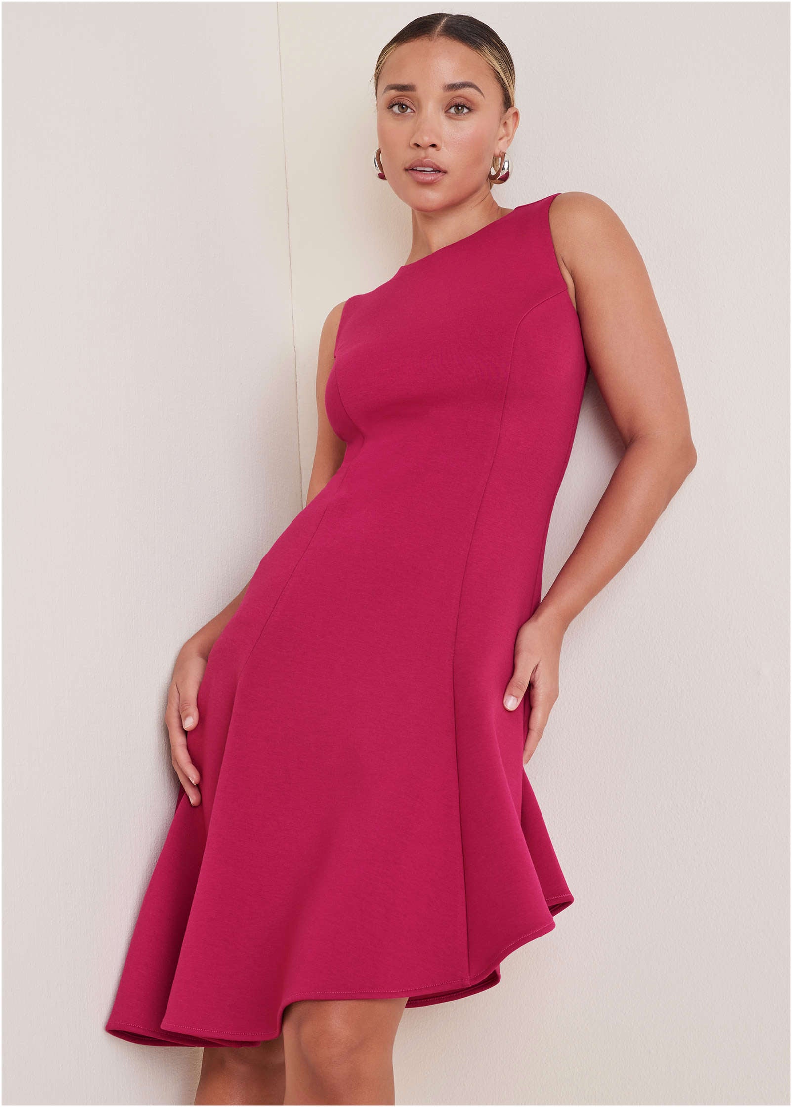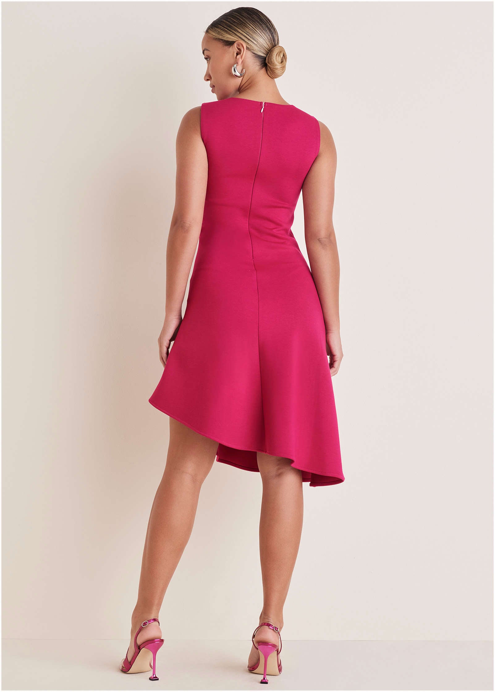 This femme and flattering dress is a closet staple for all seasons. Made in our double knit Luxe Scuba fabric. it has a smooth and structured fit that enhances your shape. but with plenty of stretch for a low-key comfy feel. From the sophisticated crew neckline to the drapey asymmetric hemline. this beauty is a subtle standout. making it a go-to for weddings. big meetings. holiday parties—you name it.* Sizes: XS (2). S (4-6). M (8-10). L (12-14). XL (16)* Plus sizes: 1X (18-20). 2X (22-24). 3X (26-28)* Sleeveless* Center back zipper closure*Asymmetric hemline: 36"-44" missy; 39.5"-47.5" plus* Partially lined* Polyester/viscose/elastane. Imported