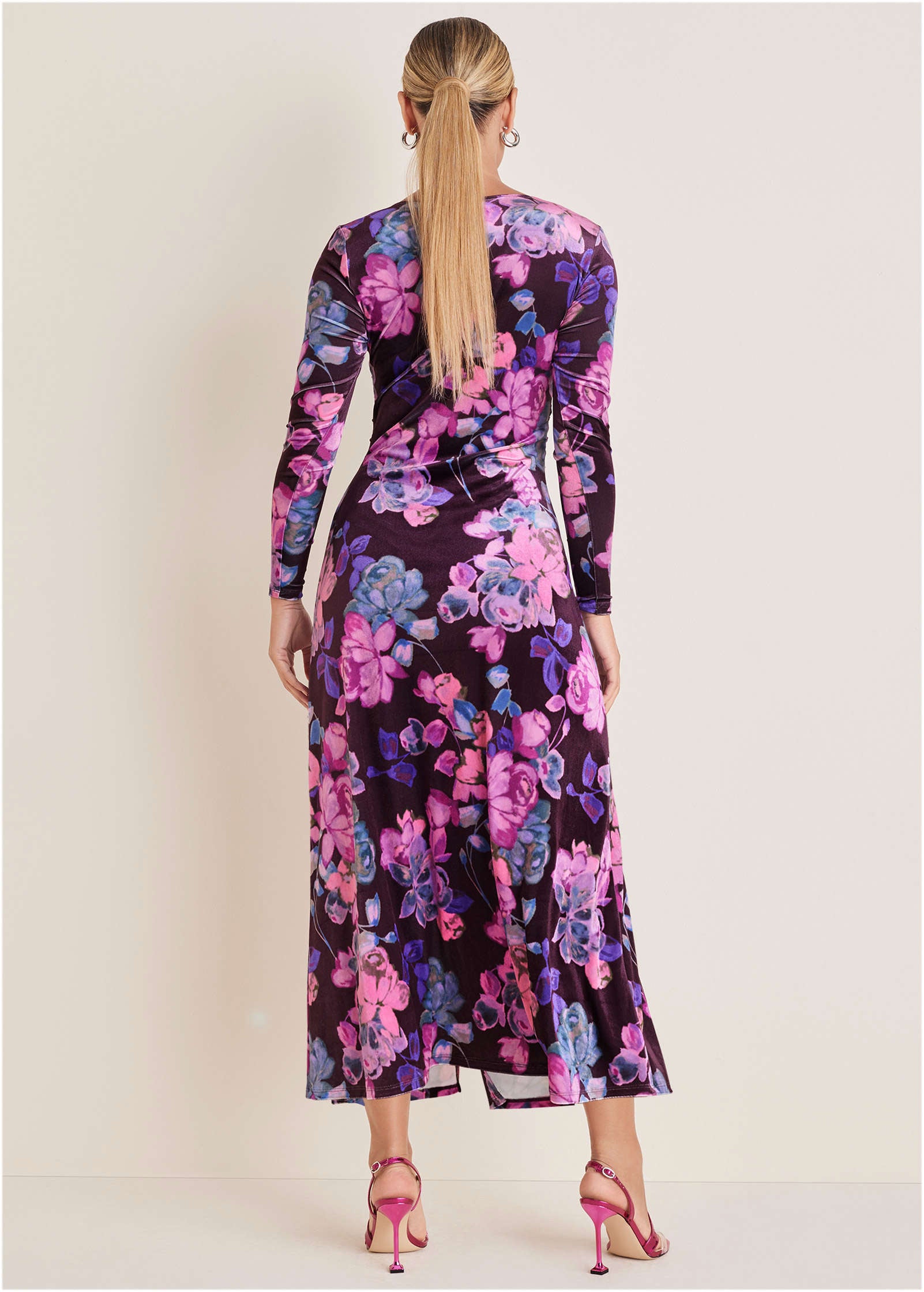 Prepare to crush hard on this velvet maxi dress (and then add-to-bag). Not only is the plush fabric extremely soft to the touch. it's also designed with comfy stretch (!!!)—a total party-season win. From the ruching at the waist that flatters your shape to the skirt slit that adds just enough sizzle. this dress gives chic. chic. CHIC.* Sizes: XS (2). S (4-6). M (8-10). L (12-14). XL (16)* Plus sizes: 1X (18-20). 2X (22-24). 3X (26-28)* Long sleeves* Front slit* Maxi length* Polyester/elastane. Imported