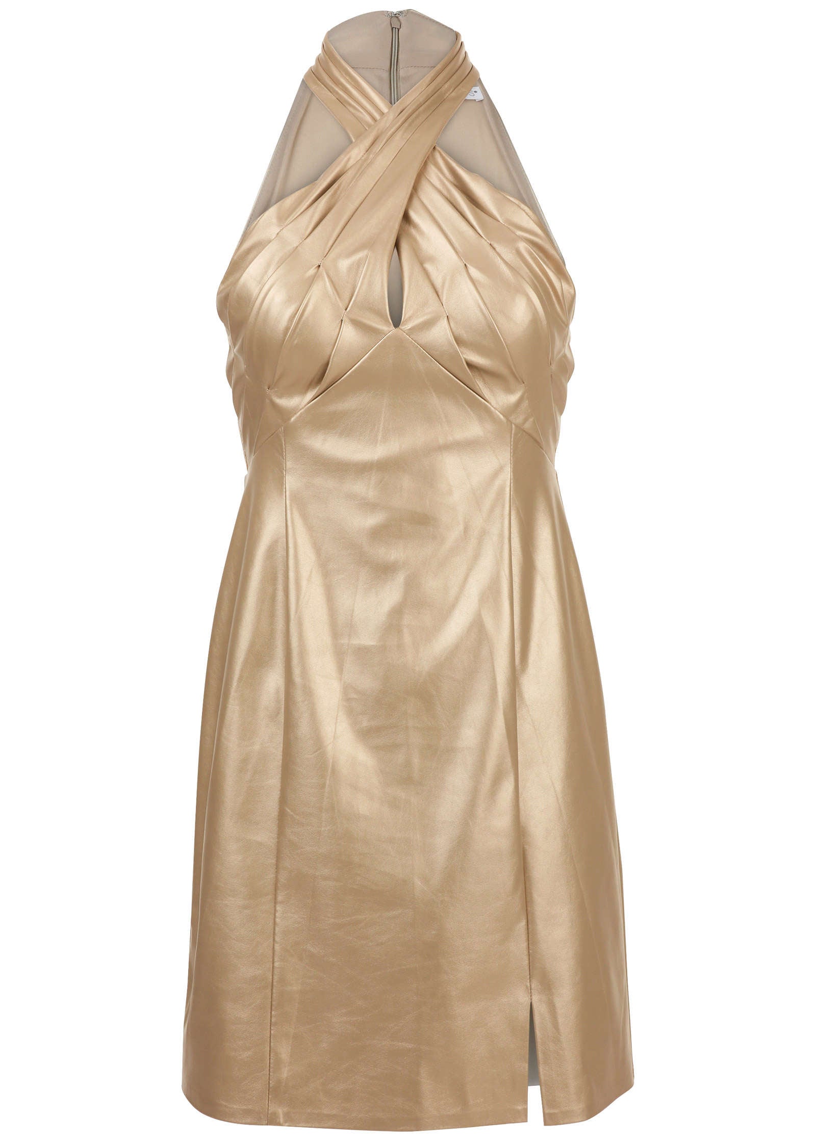 You'll be looking good as gold in this metallic mini dress. Buttery-soft and stretchy faux leather is looks so luxe and hugs every curve. The statement cross-neckline is the star of the show. but every inch of this mini shines.* Available in petite sizes* Sleeveless* Metallic finish* Mini length: 36" missy* Invisible back zipper* Viscose. Imported