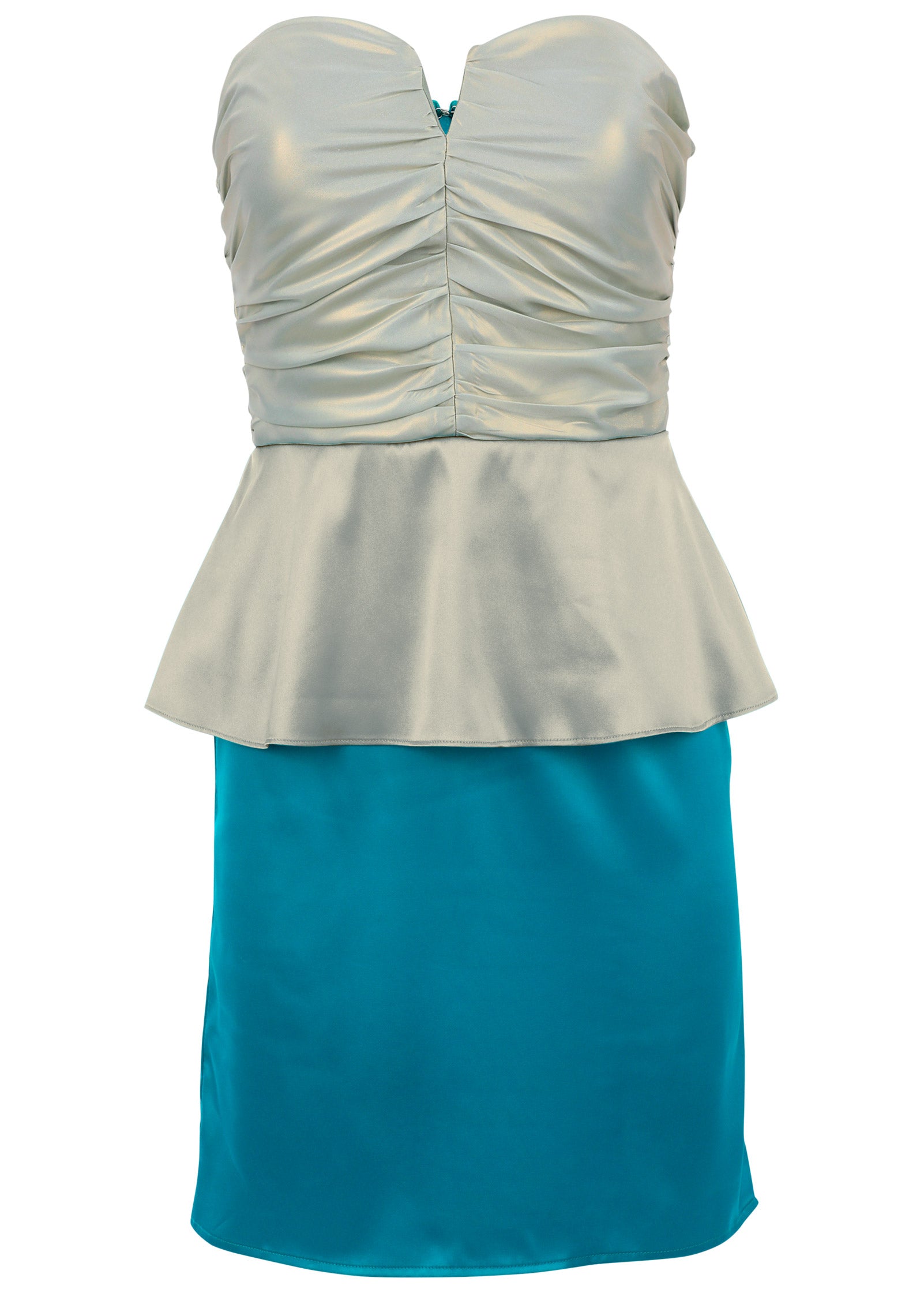 Get ready to make a splash in this playful strapless mini dress. Everything from the shimming metallic bodice and the fluttery peplum waist to the blue-hued skirt is giving mermaidcore vibes. While it may be ethereal. the silky piece makes a bold statement.* Item runs small; size up for a better fit* Strapless* Peplum waist* Mini length approx. 28"* Invisible back zipper closure* Unlined* Polyester/spandex. Imported