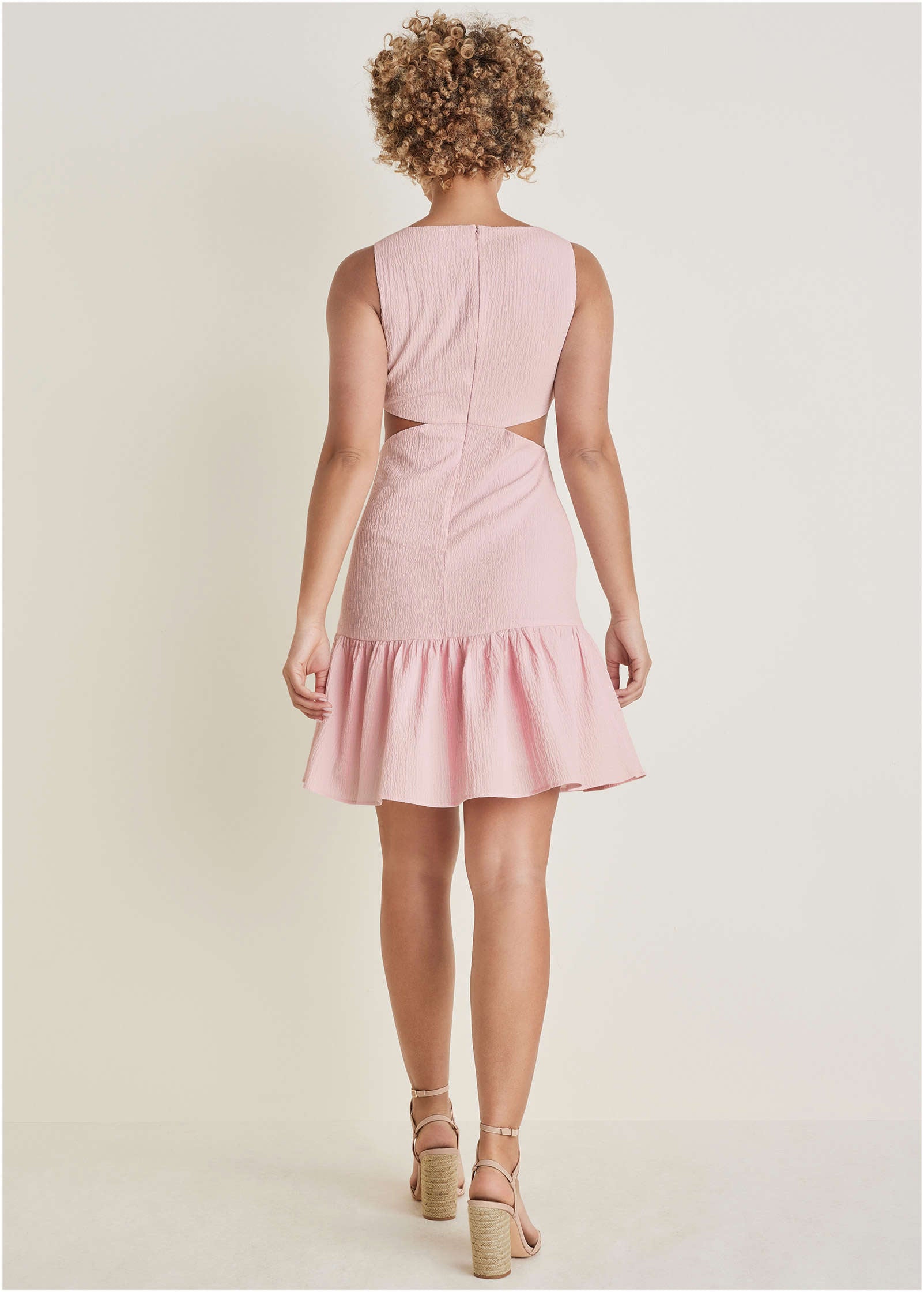 Flirty. frilly and fun! This mini dress is feminine to its core. with a fluted skirt and playful cutouts that can be dressed up or down. The satin provides an elevated look. while the sleeveless silhouette and plunging V-neck scream summer. Embrace the frills. don some heels and dance the night away at your next summer event or steamy date night. * Sizes: XS (2). S (4-6). M (8-10). L (12-14). XL (16)* Plus sizes: 1X (18-20). 2X (22-24). 3X (26-28)* V-neck* Sleeveless* Back zipper closure* Side cutouts* Ruffle hem* Mini length. 35" from shoulder* Lined* Polyester/Lycra. Imported
