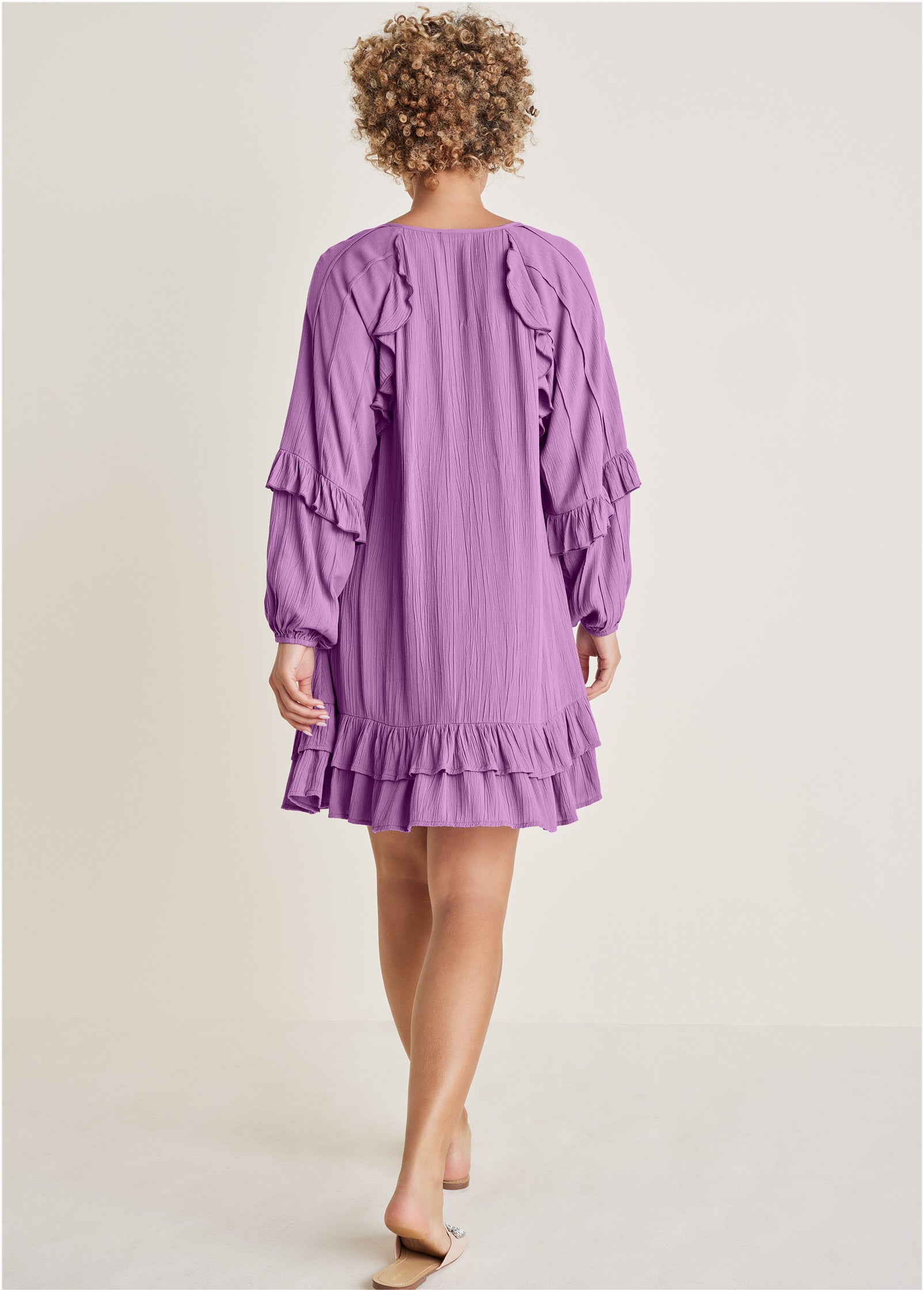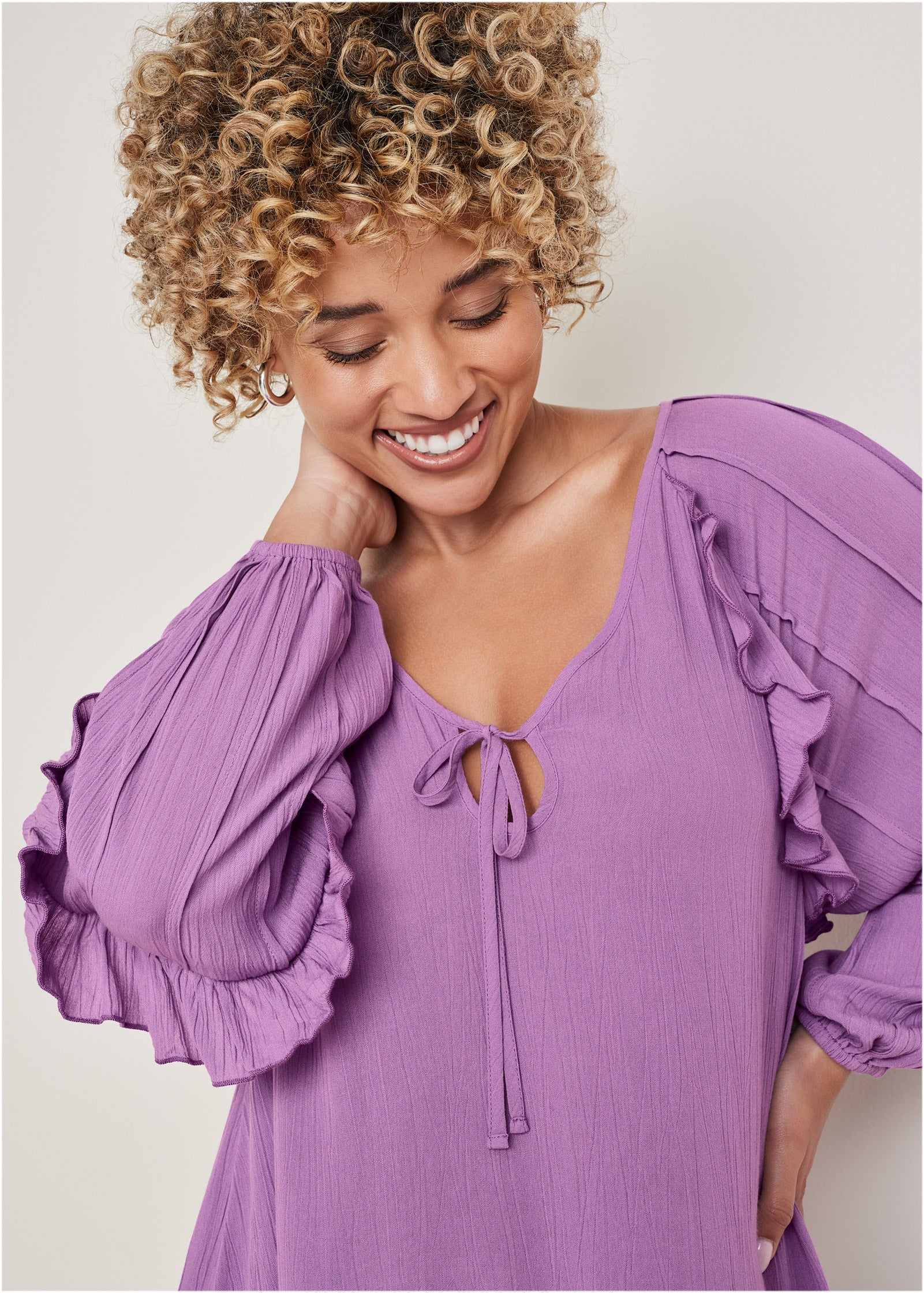 This lively mini dress has something up its sleeves: ruffles! With frilly. feminine details along the arms and at the hem. this dress ruffles up some flair in your wardrobe. Its long sleeves and tie neckline create a modest look that transitions effortlessly from season to season.* Sizes: XS (2). S (4-6). M (8-10). L (12-14). XL (16)* Plus sizes: 1X (18-20). 2X (22-24). 3X (26-28)* Long sleeves* Tie neckline with keyhole detail* High-low hem* Mini length. approx. 35" in front. 37" in back from shoulder* Viscose. Imported