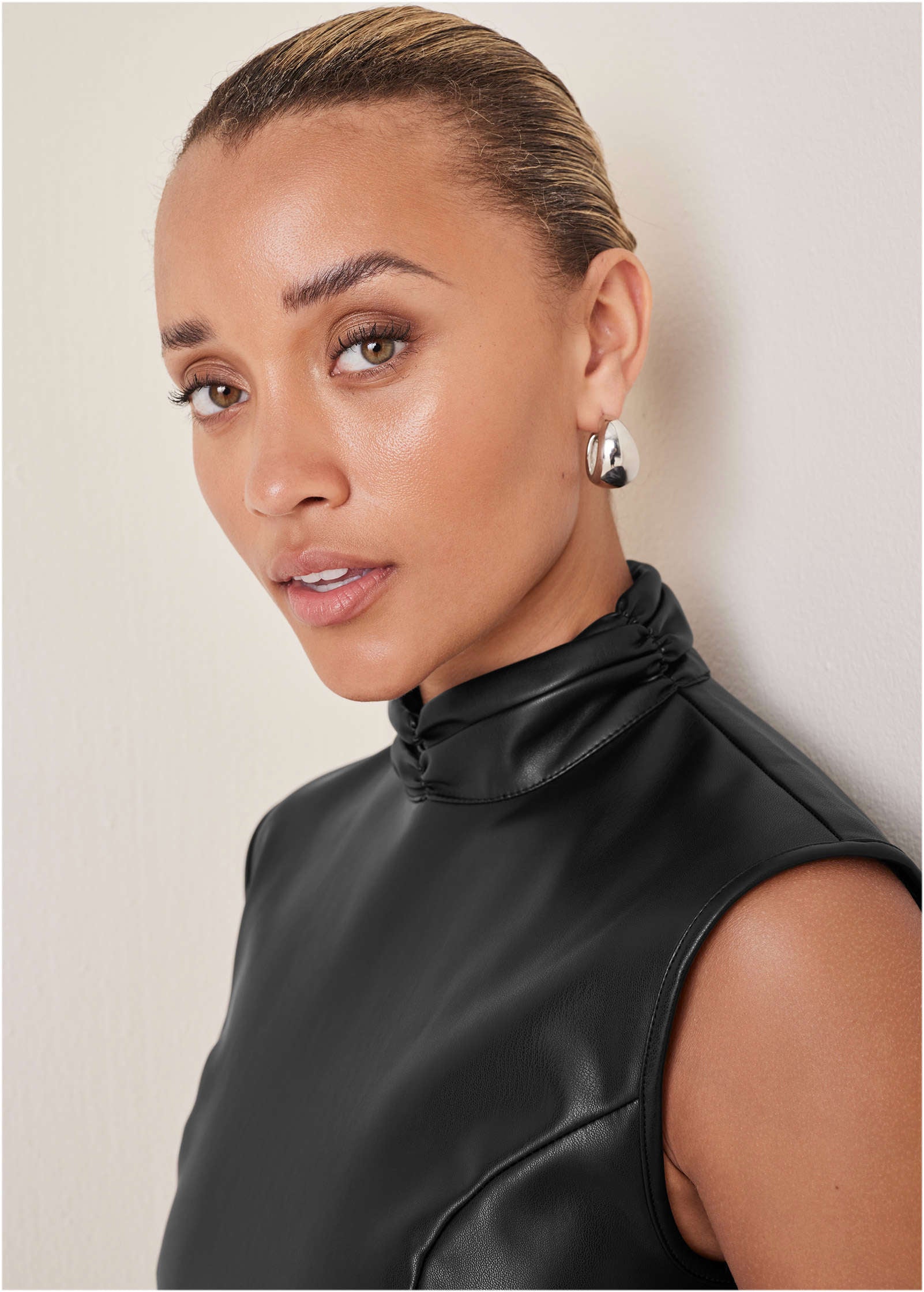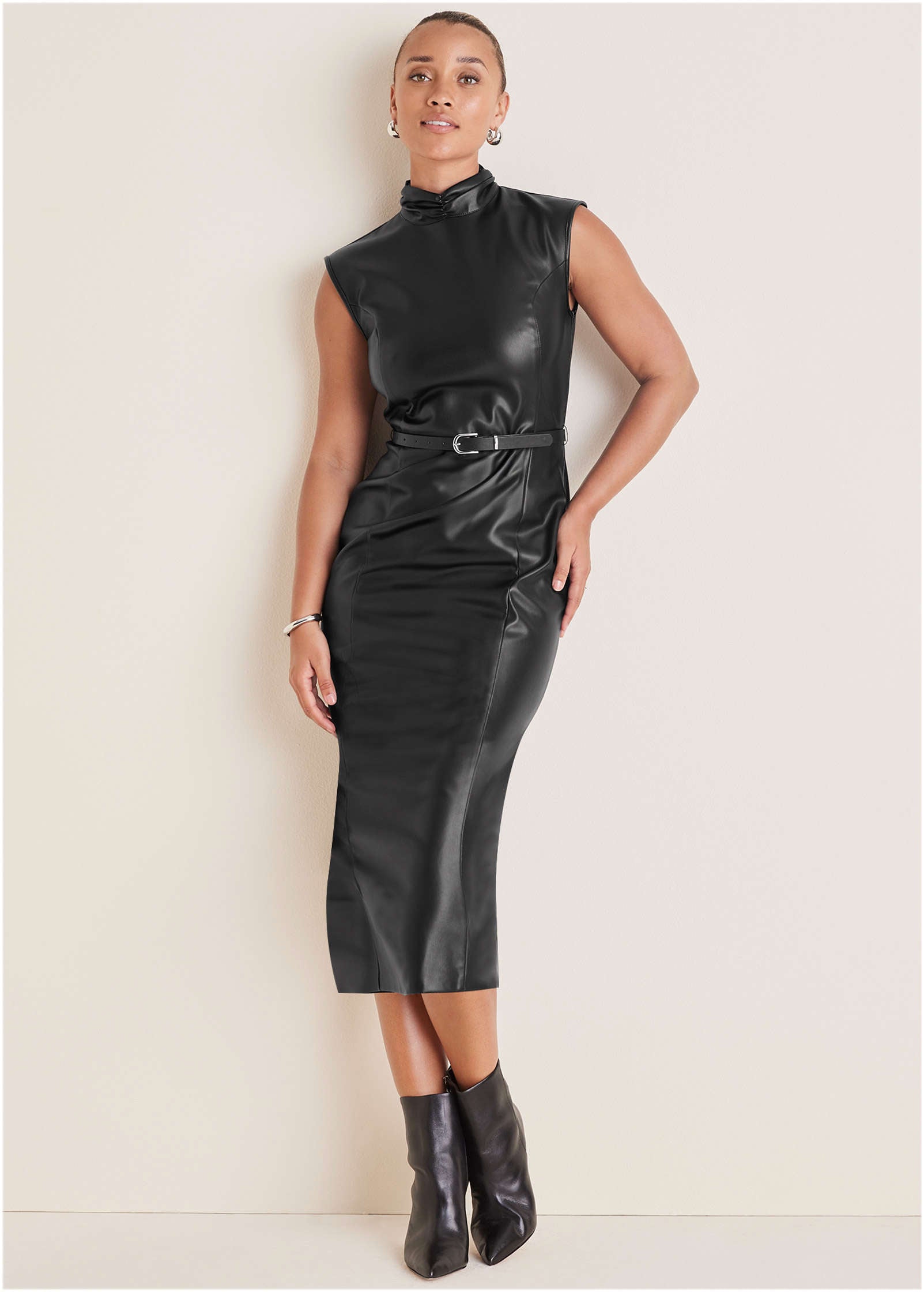 Buttery soft. comfortably stretchy and perfectly polished. this sleek faux-leather midi dress is a total triple threat! With its mock neckline. figure-flattering belted waist and mid-calf length. it's the picture of sophistication. But don't be fooled: while the edgy fabric may be faux. the attitude is 100% the real deal.* Sizes: XXS (0). XS (2). S (4-6). M (8-10). L (12-14). XL (16)* Available in petite sizes* Mockneck* Sleeveless* Back zipper closure* Belted waist* Maxi length: 45.75" missy; 42.75" petite* Polyurethane. Imported