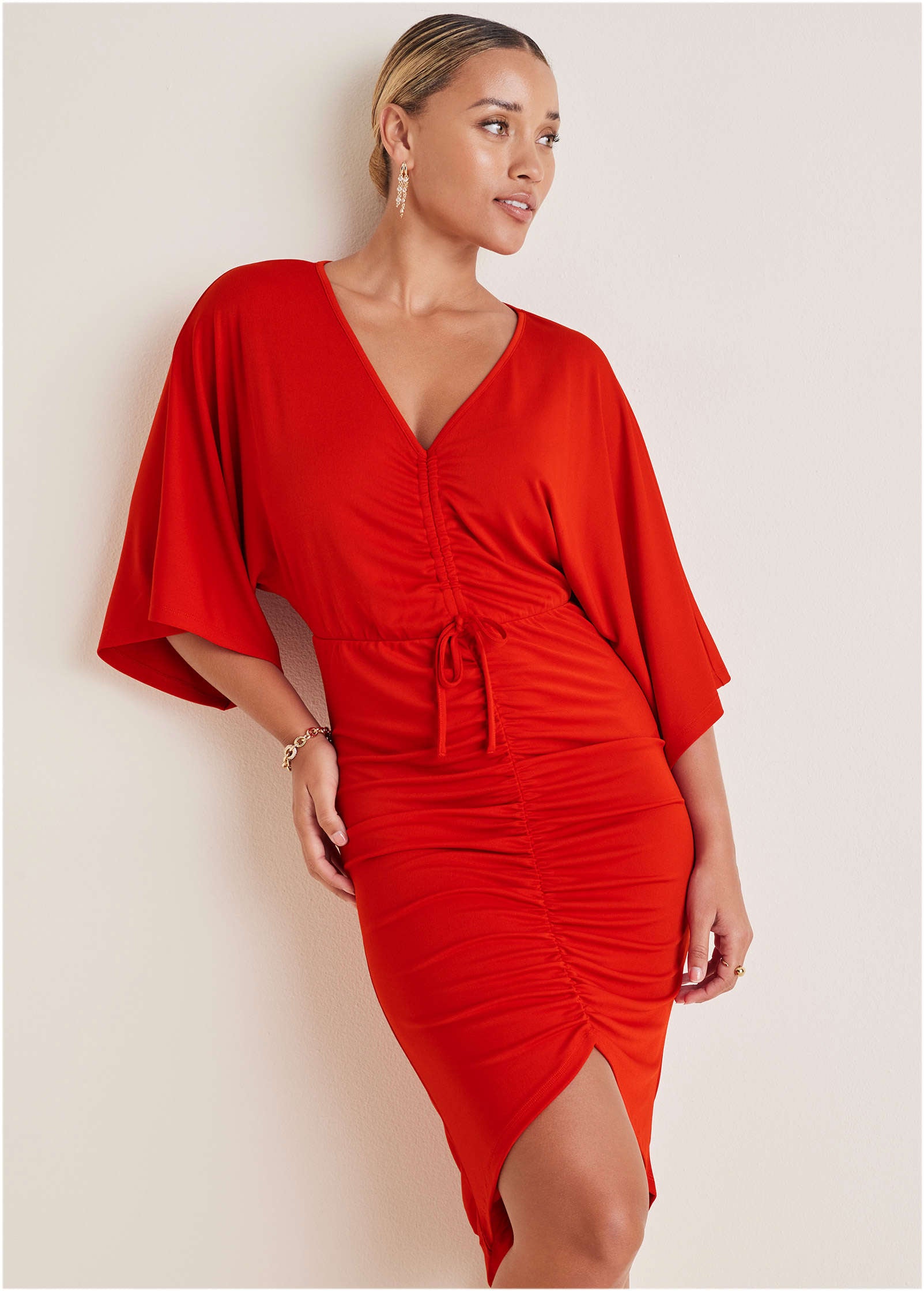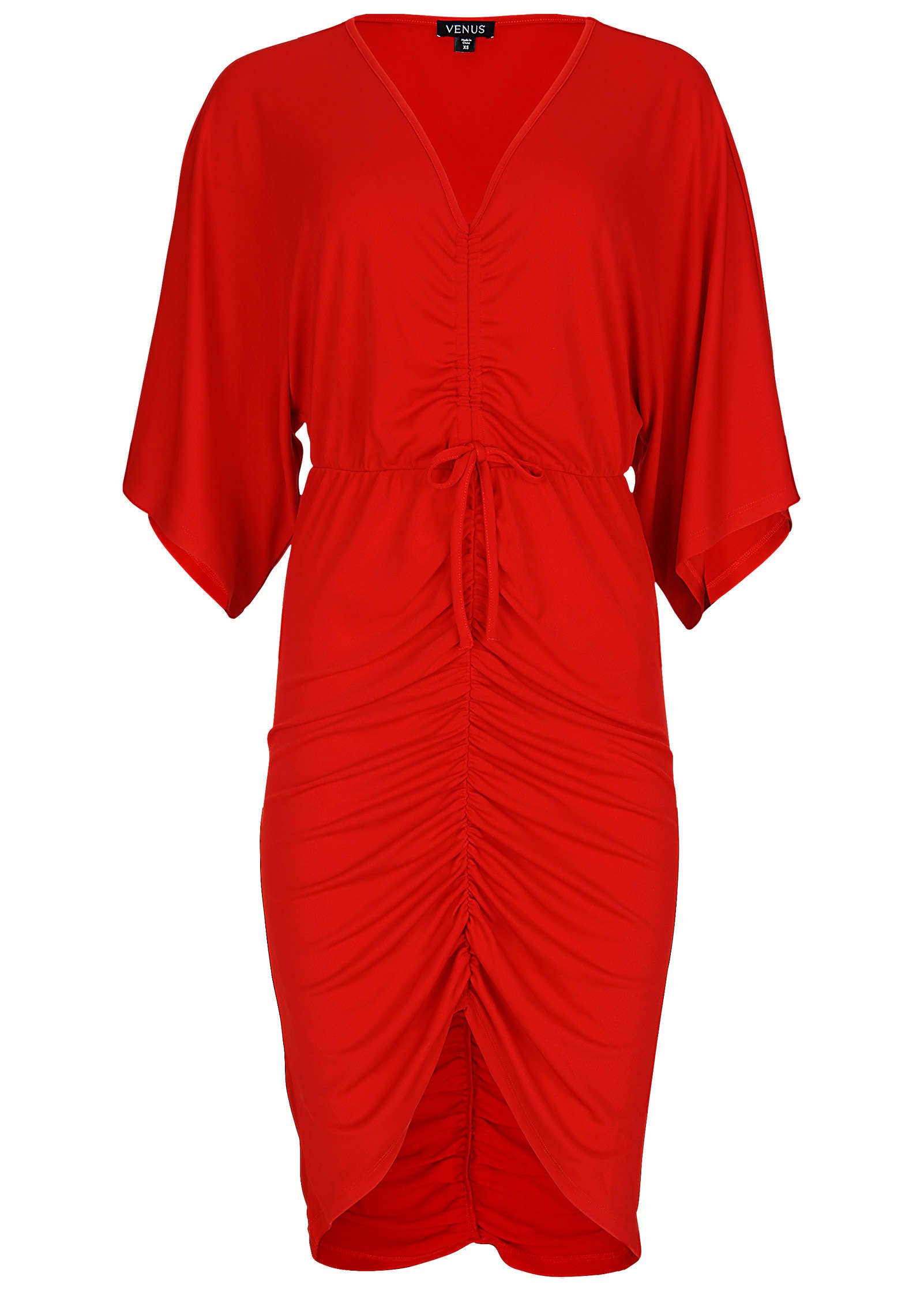 Party dresses don't get more flattering than this! Packed with details that highlight your best features. you'll reach for this dress for every occasion. The V-neckline shows a bit of skin. while flowy kimono-style sleeves keep your arms covered. The waist tie creates an alluring shape. while the ruched skirt creates dimension and flatters your figure. From holiday parties to winter date nights. all you need is a pair of heels for the perfect look. * Sizes: XS (2). S (4-6). M (8-10). L (12-14). XL (16)* V-neckline* Elbow-length sleeves* Ruched front* Knee length: 32.5" to top of front hem. 41.5" at back* Fabric has stretch* Polyester/spandex. Imported