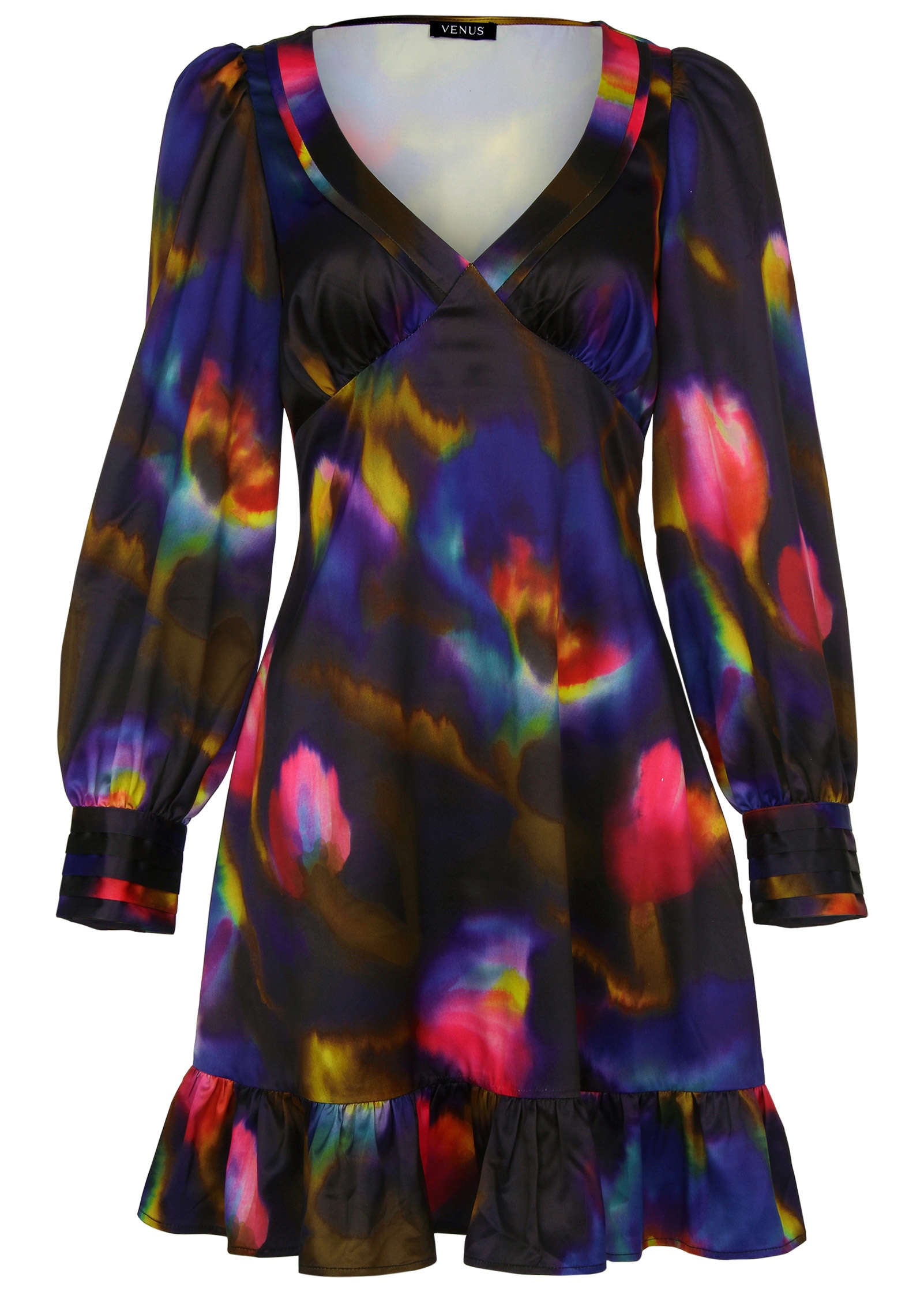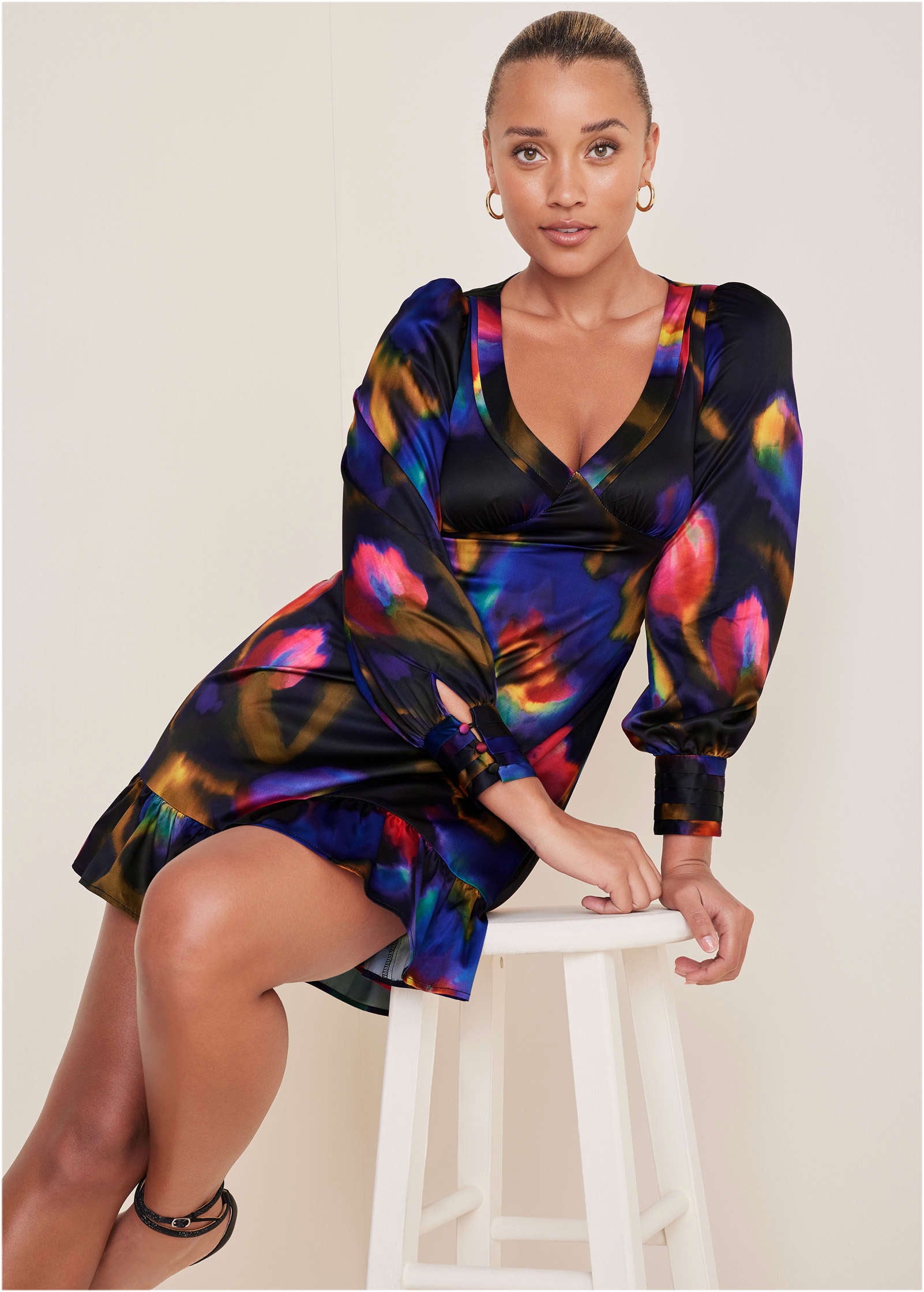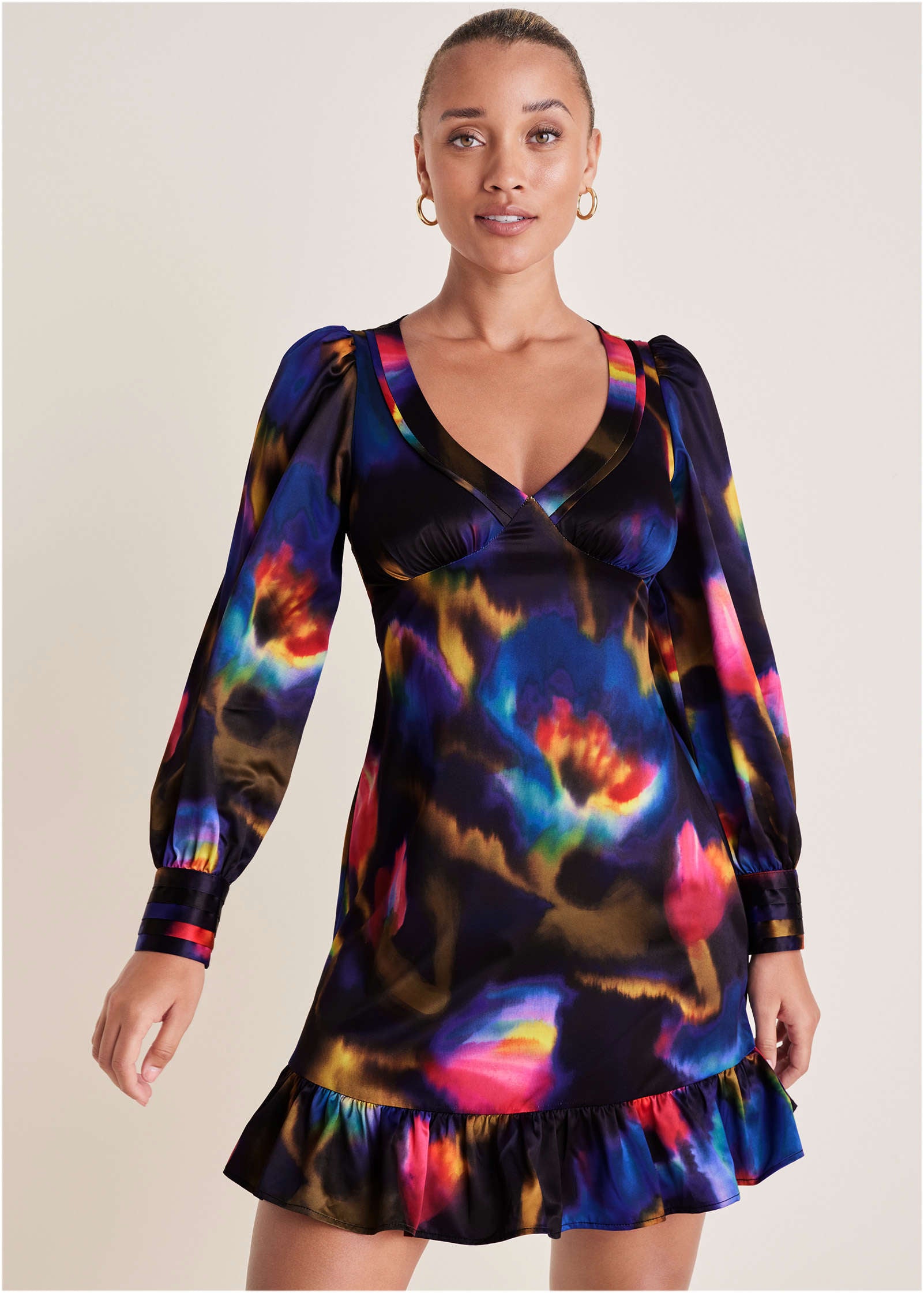 Get a leg up on the party competition in a flirty mini packed with celebration-worthy details. From the spicy V-neckline and slightly puffed sleeves to the eye-catching ruffle on the hem. this stunning silhouette is the perfect for choice for any occasion. Done in our no-wrinkle EffortLuxe fabric with a subtle sheen. it's the ultimate event look. * Sizes: XS (2). S (4-6). M (8-10). L (12-14). XL (16)* V-neckline* Long sleeves* Ruffle hem* Invisible side zipper* Fabric has some stretch* EffortLuxe (Polyester/spandex. Imported)