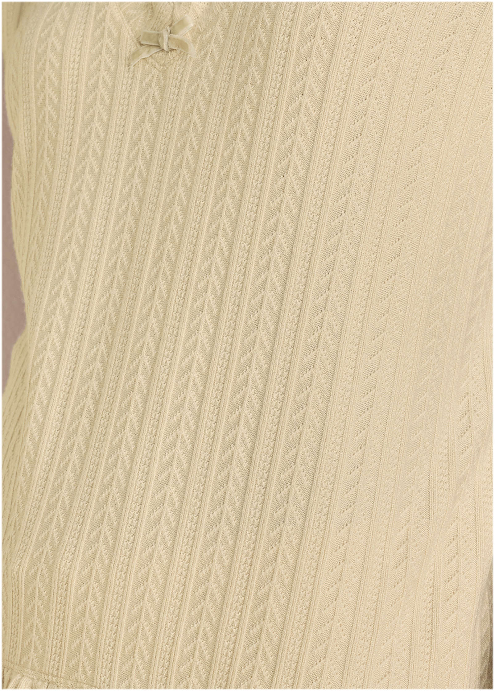 Meet the flirtiest loungewear you've ever seen. With a sweet V-neckline. delicate bow detail. and ruffle hem. this top brings all the romance to your downtime. The cable knit look adds texture. while the soft. cozy fabric makes it perfect for sipping mimosas in style. Pair it with the matching Brunch Knit Short for a set that's five-star stay approved. Whether you're lounging at home or enjoying a luxe hotel getaway. this top is your go-to for looking effortlessly fabulous.* Sizes: XS (2). S (4-6). M (8-10). L (12-14). XL (16)* V-neckline: Flattering and feminine with a tiny bow accent.* Ruffle hem: A playful. flirty finish for extra charm.* Cable knit look: Cozy texture with a lightweight feel.* Soft & lounge-ready: Perfect for slow mornings and hotel stays (especially if there's room service).* Pair it up: Wear with the Brunch Knit Short for an ultra-cute matching set.* Rayon/poly/nylon/spandex. Imported