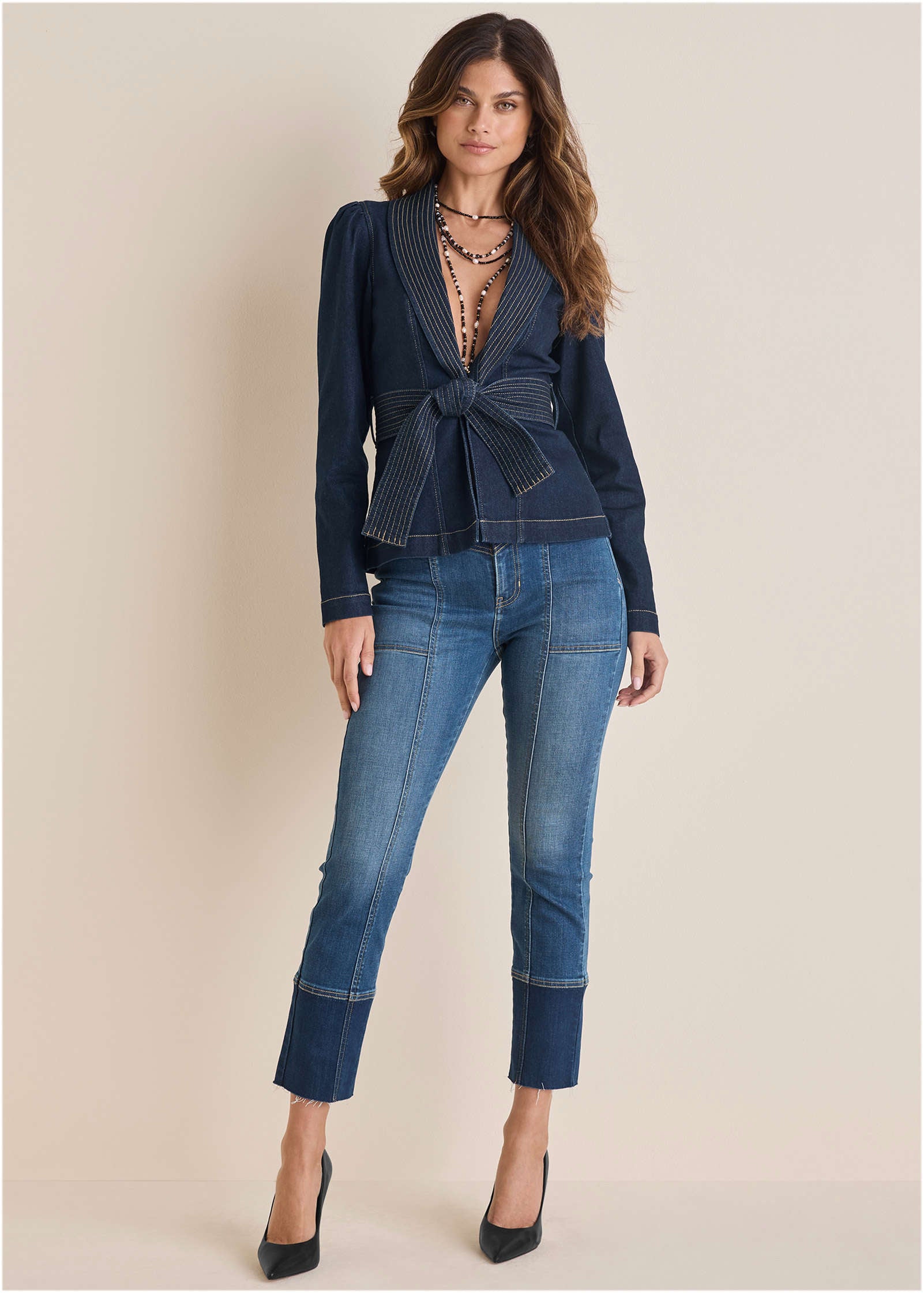 This Puff Shoulder Denim Blazer is so good. you'll neve want to take it off. With puff sleeve detail. bold contrast stitching. and a flattering belt tie at the waist. this blazer levels up any look. The long sleeves keep it chic and versatile for any season. Wear it buttoned up like a top with your favorite denim. or layer it over a tank for extra edge. Either way. it's an instant outfit-maker. * Sizes: XS (2). S (4-6). M (8-10). L (12-14). XL (16)* Puff sleeve detail: Bold and feminine* Long sleeves: Classic and versatile* Belt tie at waist: Cinches for a flattering fit* Contrast stitching: Adds standout detail* Cotton (CmiA)/poly/elastane. Imported