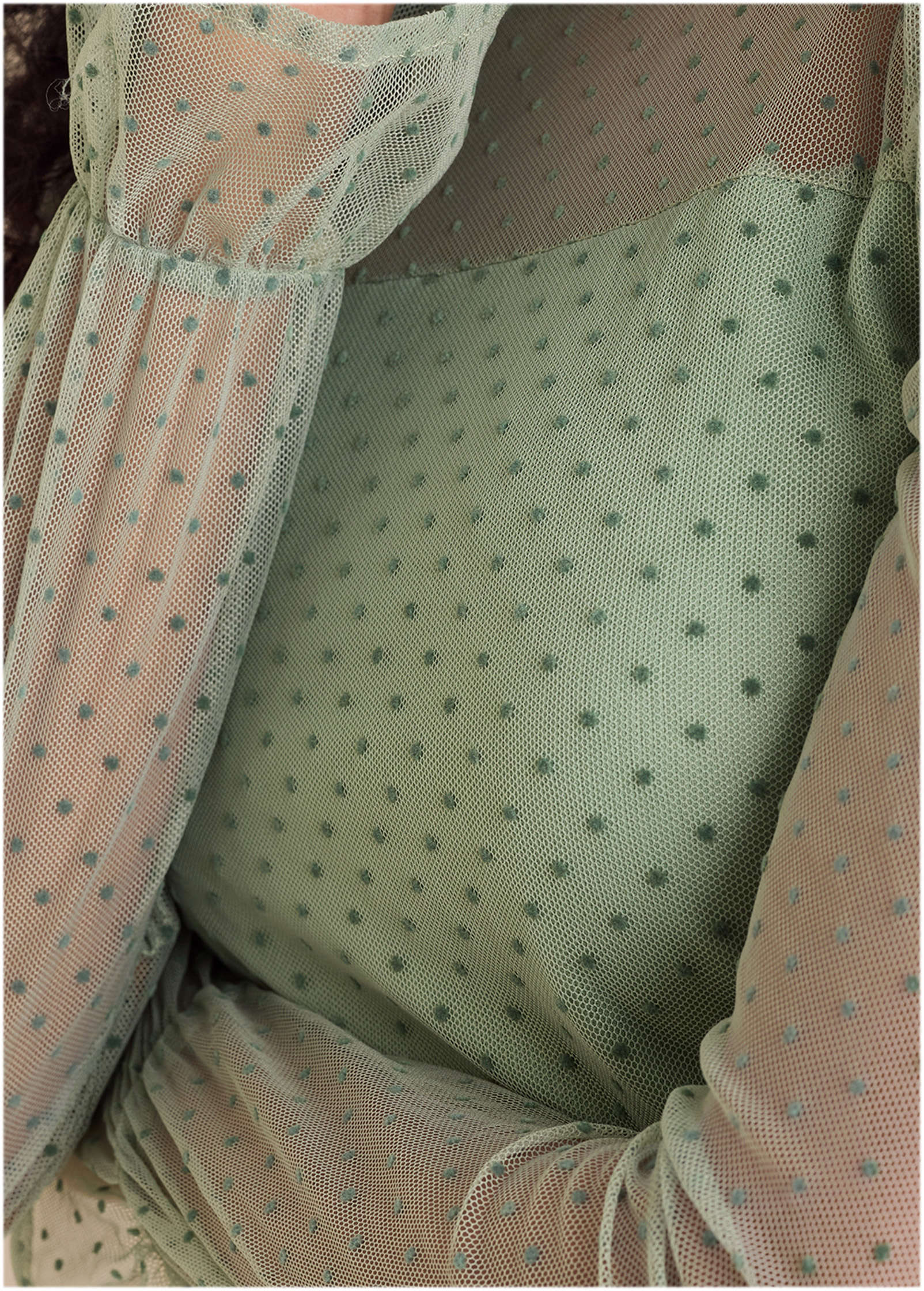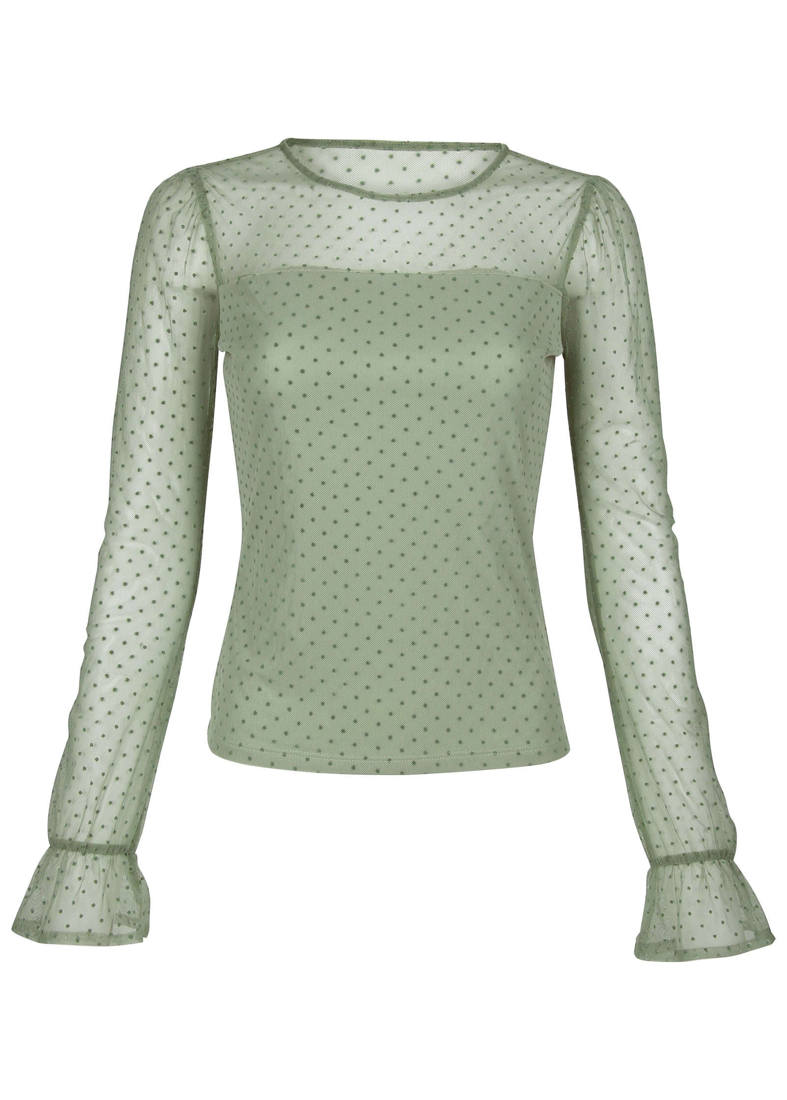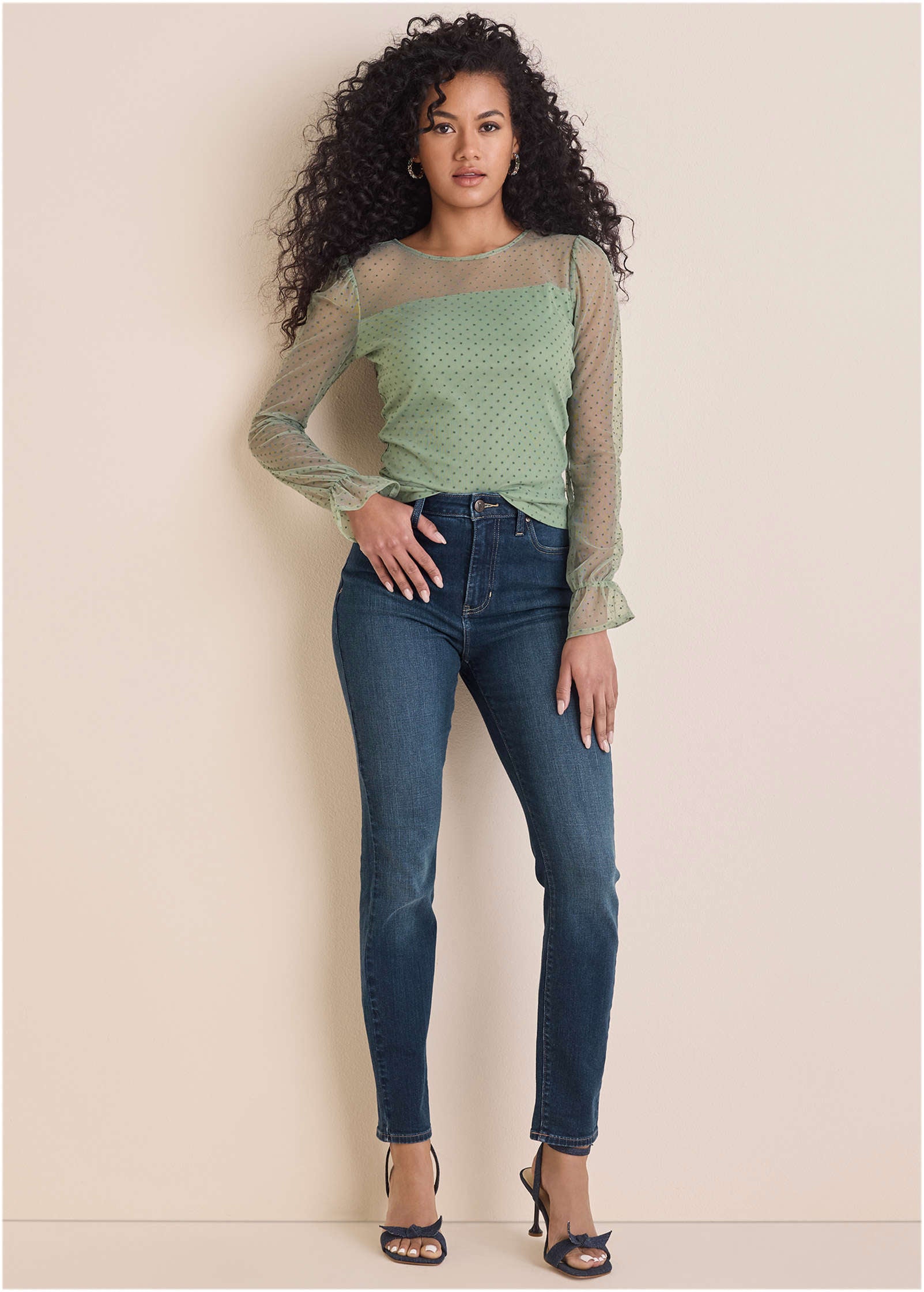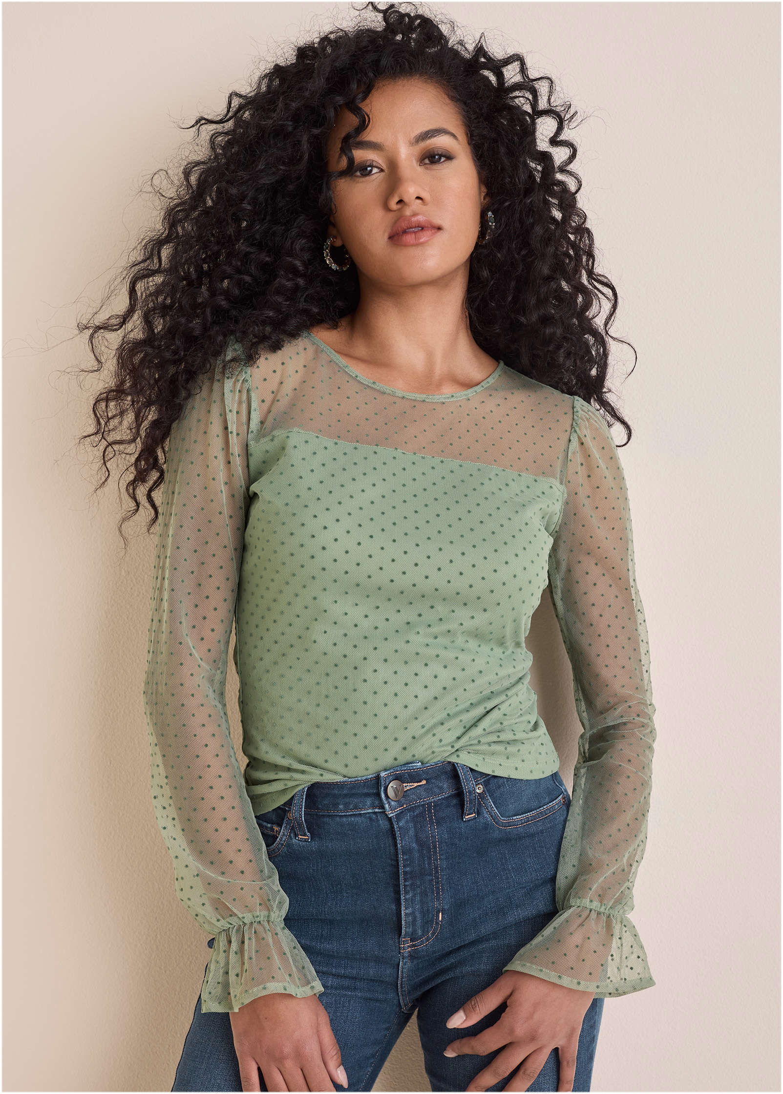 Sheer perfection. with a side of sass. This dot mesh top takes your classic long sleeve to the next level with flirty mesh at the neckline and sleeves. plus a cinched wrist for a little added drama. Semi-lined for just the right amount of coverage. it's made to turn heads without trying too hard. Pair with denim for a femme look that's anything but basic.* Sizes: XS (2). S (4-6). M (8-10). L (12-14). XL (16)* Classic crew neckline: Clean. simple. and made to show off the sheer dot detail.* Dot mesh sleeves and neckline: A flirty twist that adds texture and allure.* Cinched wrist: Creates volume and shape for a dramatic. feminine finish.* Semi-lined: Strikes the perfect balance between sheer and sophisticated.* Nylon. Imported