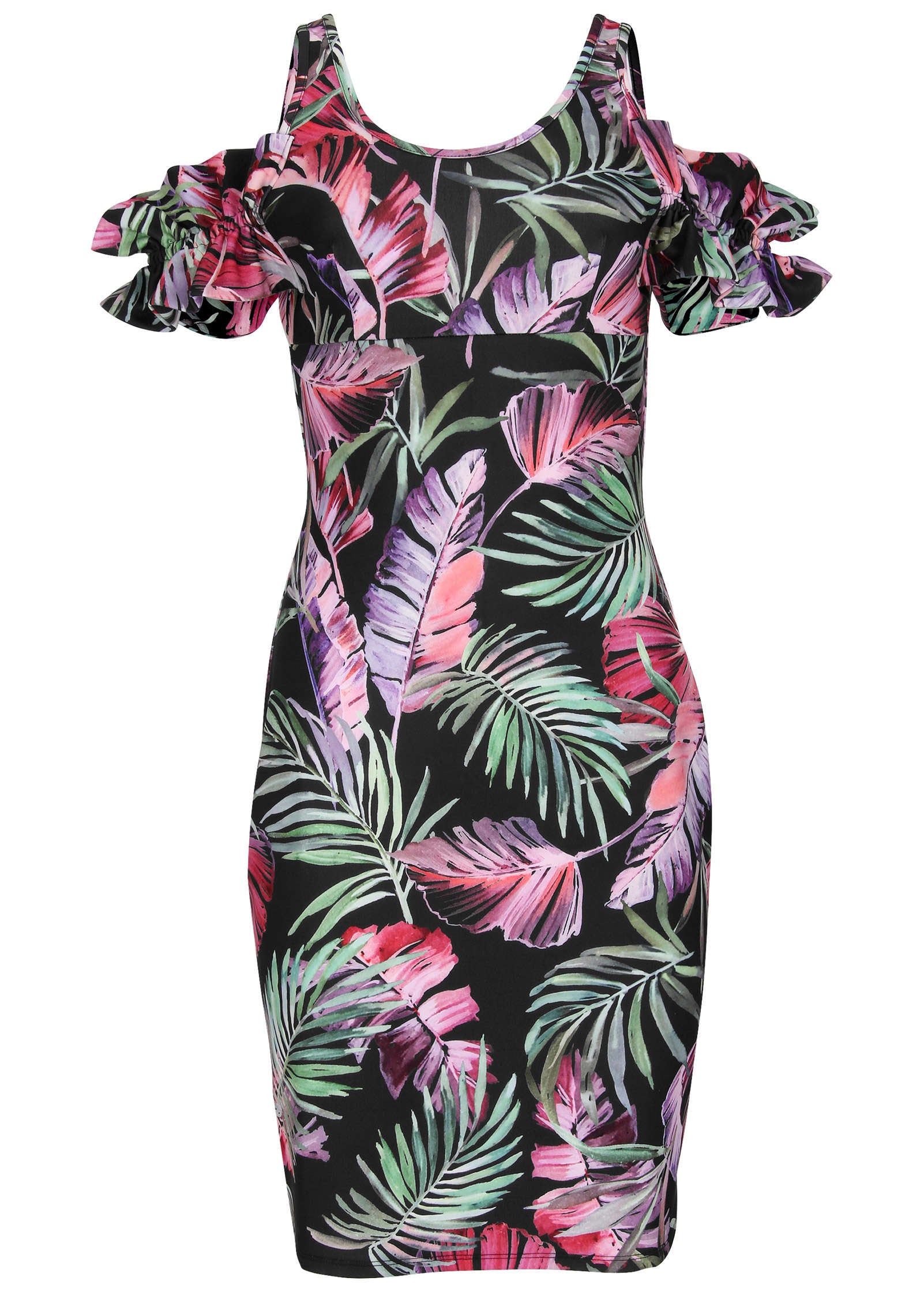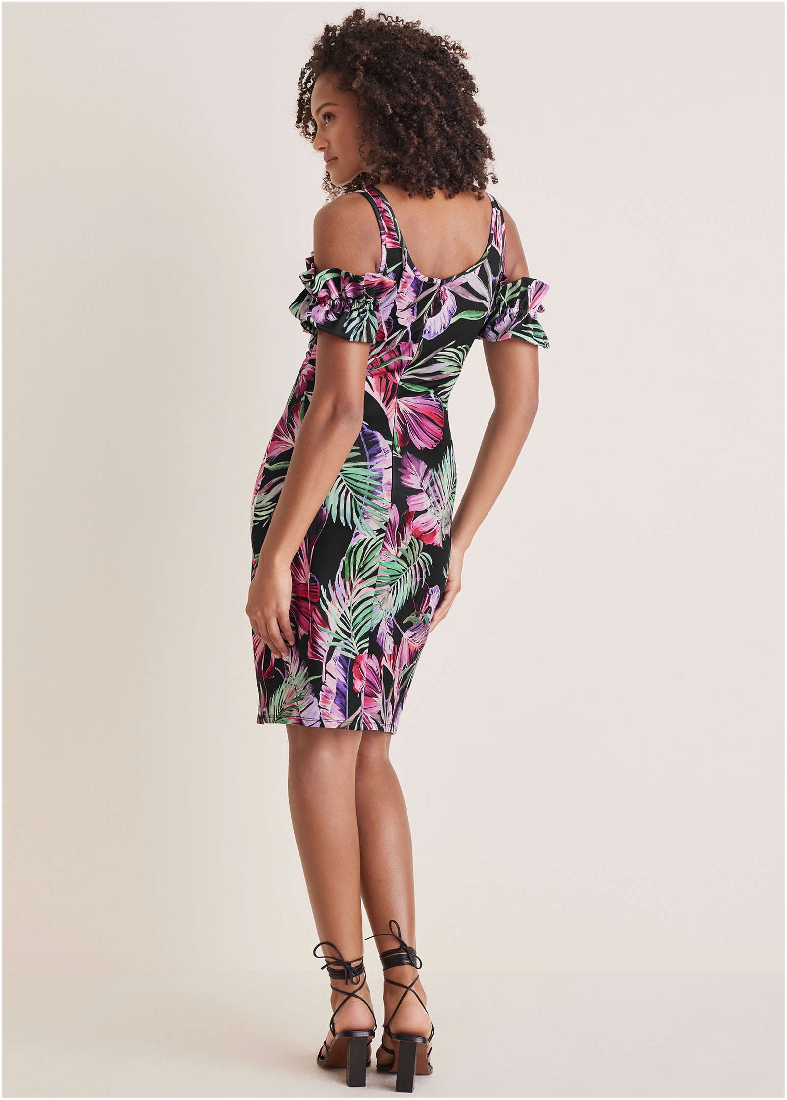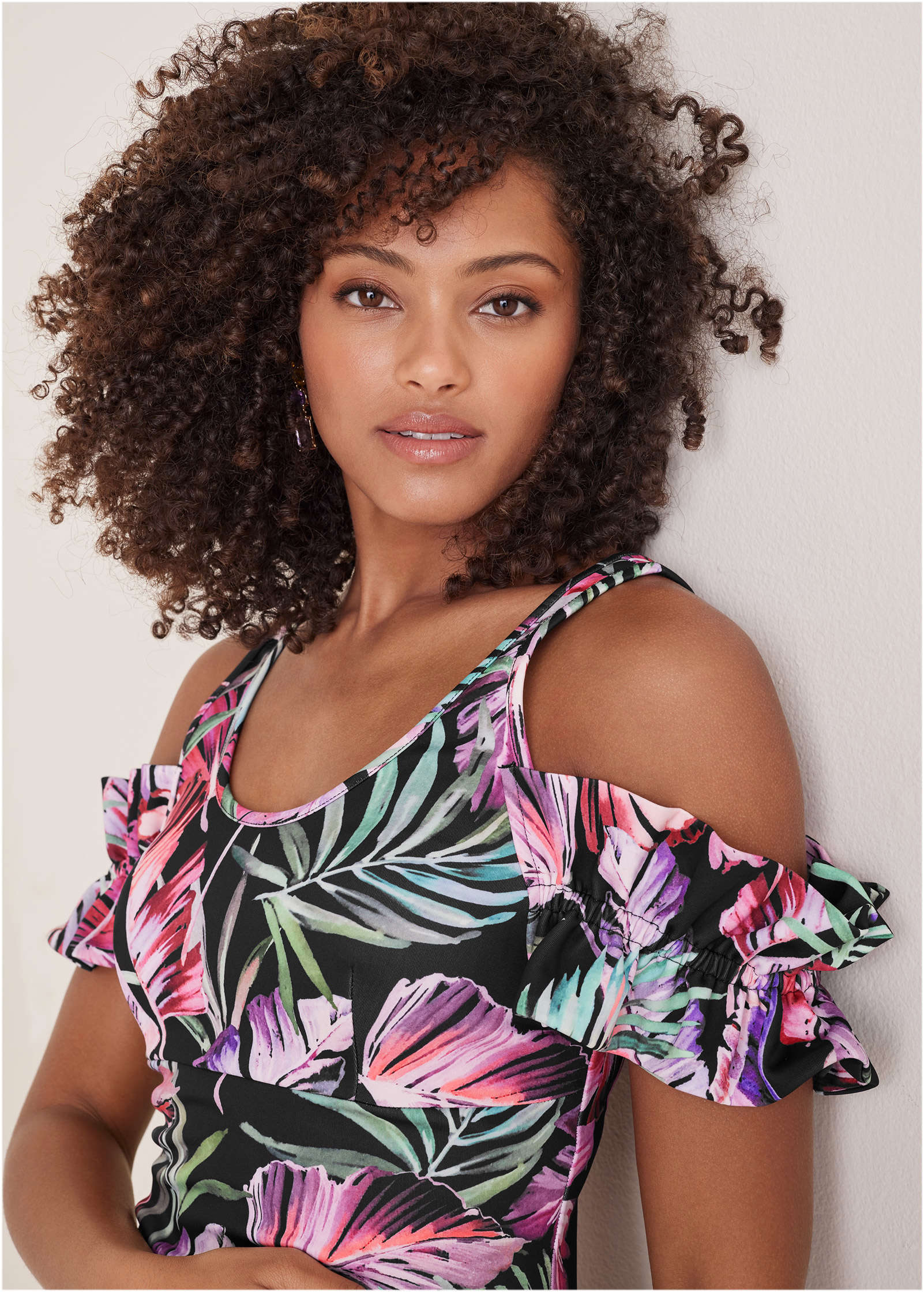 This Floral Cold Shoulder Mini is made for vacation vibes and warm-weather nights. With a cold-shoulder neckline and ruffled sleeves. this dress is equal parts romantic and playful. The breezy silhouette makes it easy to dress up or down. so you can go from dinner to a moonlit beach stroll with zero effort.* Sizes: XS (2). S (4-6). M (8-10). L (12-14). XL (16)* Cold-shoulder neckline: A little flirty. a lot fabulous.* Ruffle sleeves: Feminine details for extra charm.* Mini length: Show off those sun-kissed legs.* Lightweight and breezy: A must-pack for your next getaway.* Versatile styling: Pair with heels or wedges for dinner. then go barefoot in the sand.* Print placement may vary* Poly/spandex. Imported