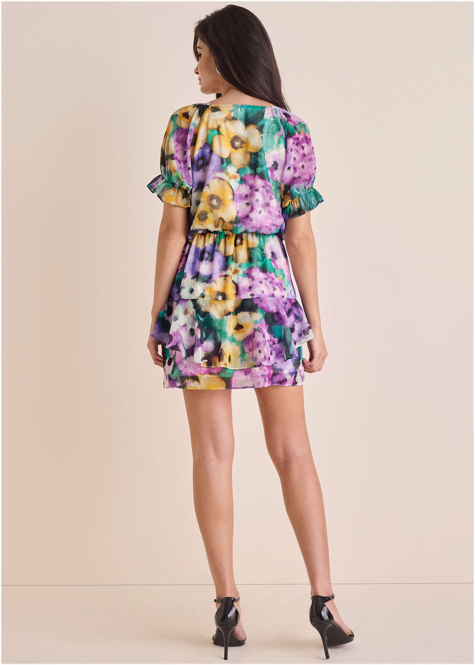 This floral chiffon mini dress is made to play. thanks to its tiered ruffle skirt and flirty short sleeves. The elastic waist and V-neckline give it a flattering fit. while the ruffle detail on the sleeves adds a fun. feminine touch. Whether you're heading to brunch or a date night. this dress will have you feeling effortlessly chic and ready to turn heads.* Sizes: XS (2). S (4-6). M (8-10). L (12-14). XL (16)* Mini length. 35.5" from shoulder* V-neckline: Flattering and perfect for showing off your favorite necklace.* Short sleeves with ruffle detail: A playful touch to elevate your look.* Elastic waist: Comfortable fit that cinches in all the right places.* Tiered ruffle skirt: Adds movement and a touch of whimsy to your step.* For printed items. print placement may vary. * Poly. Imported