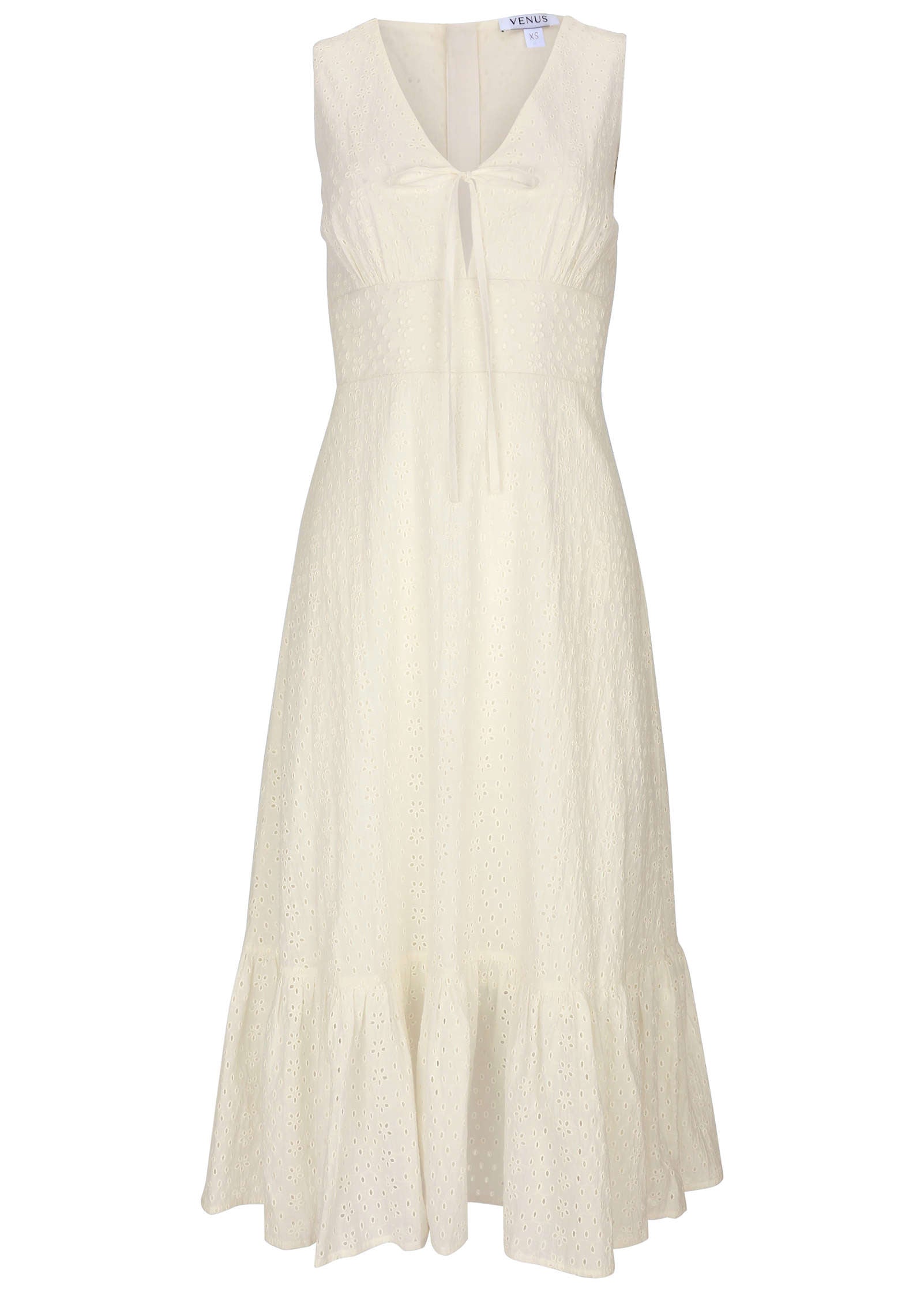 Embrace the airy charm of this sleeveless eyelet midi dress. designed to elevate your spring wardrobe. The V-neckline and keyhole detail add a touch of sophistication. while the breezy cotton fabric and ruffled hem create a relaxed yet polished look. Whether you're strolling through a weekend market or indulging at brunch. this dress has you covered.* Sizes: XS (2). S (4-6). M (8-10). L (12-14). XL (16)* V-neckline: Flattering and feminine for a classic silhouette.* Keyhole detail: Adds a playful touch of skin.* Eyelet detail: Intricate design that brings texture and elegance.* Ruffle on hem: Feminine flair for added movement.* Breezy cotton: Perfect for warm weather with comfort in mind.* Back zipper closure: Smooth. easy wear.* Semi-lined: Light and breathable for the season.* Cotton. Imported