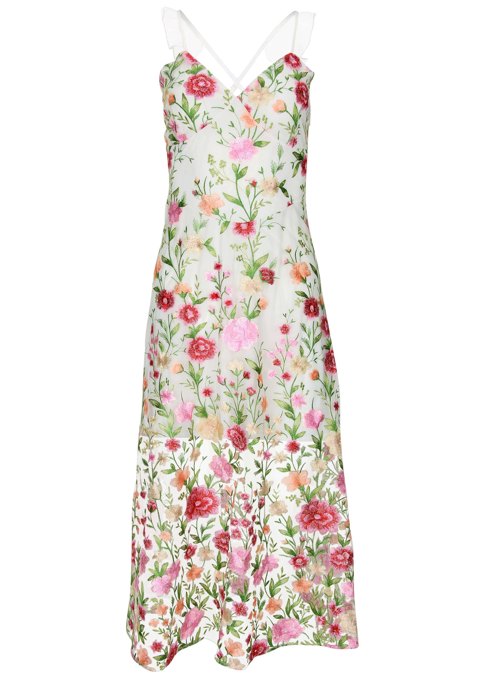 Effortlessly elegant and ready to shine at your next event! This sleeveless maxi dress features sheer ruffle sleeves. a flattering V-neckline. and embroidered floral details that add a romantic touch. The strappy back and invisible side zipper offer a seamless. sleek look. Perfect for brunch dates or special events—pair with your favorite heels for an unforgettable look.* Sizes: XS (2). S (4-6). M (8-10). L (12-14). XL (16)* Plus sizes: 1X (18-20). 2X (22-24). 3X (26-28)* Sleeveless: Stay cool and chic.* Sheer ruffle sleeves: Soft. feminine detailing for a romantic vibe.* Embroidered floral details: Adds texture and sophistication to the design.* Invisible side zipper: Seamless finish for a sleek fit.* Poly. Imported