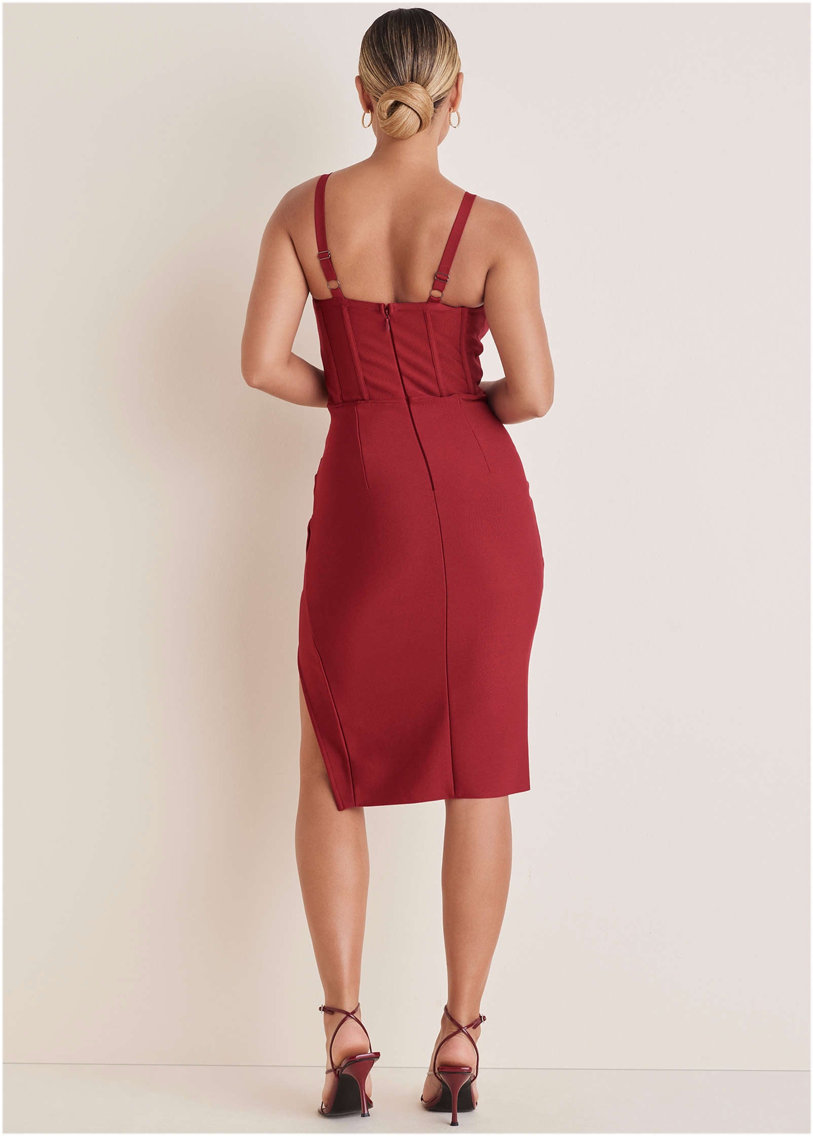 Sleek. sculpted. and designed to stun—this bandage dress hugs in all the right places and brings major main-character energy wherever you go. Add strappy heels and statement earrings for a head-turning look that works from cocktail hour to destination weddings.* Sizes: XS (2). S (4-6). M (8-10). L (12-14). XL (16)* Also comes in petites* Sleeveless: A minimalist cut that shows off your shoulders* Center back zipper closure: Easy on and off with a seamless finish* Side slit: Adds drama. movement. and just the right amount of leg* Stretch fabric: Contours and flatters your shape while keeping you comfy* Nylon/spandex. Imported