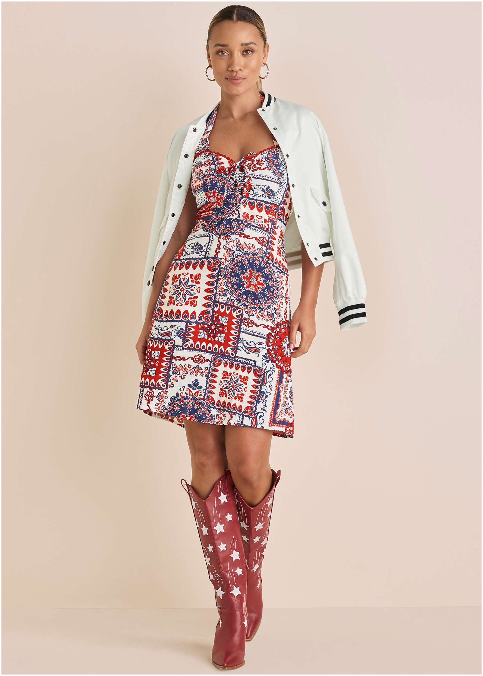Easy-breezy meets effortlessly chic. The Sleeveless Linen Dress is your sunny-day hero. with a halter neckline and flattering A-line shape that screams vacation-ready. The subtle trim details at the neckline and hem add a crisp. polished touch. while the lightweight linen keeps you cool no matter where the day takes you.* Sizes: XS (2). S (4-6). M (8-10). L (12-14). XL (16)* Halter neckline: Sleek and flattering for a modern summer silhouette.* Trim along neckline and hem: A sweet touch that elevates the look.* Sleeveless: Made for warm-weather days.* Invisible back zipper closure: Clean finish with easy on-and-off.* A-line shape: Flowy. feminine. and universally flattering.* For printed items; placement may vary* Viscose/cotton/linen. Imported