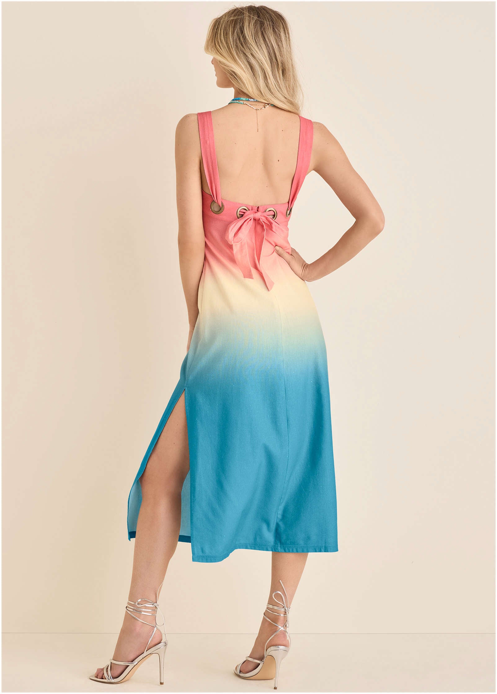 This Cotton Linen Midi Dress is your new go-to for warm-weather occasions. Crafted from a breezy cotton-linen blend. it features a flattering square neckline. a playful back tie. and a subtle side slit that adds a little drama with every step. It's minimal. effortless. and oh-so-elegant. Perfect for garden parties. or elevated brunch plans—just add heels and let the compliments roll in.* Sizes: XS (2). S (4-6). M (8-10). L (12-14). XL (16)* Plus sizes: 1X (18-20). 2X (22-24)* Sleeveless: A warm-weather must.* Square neckline: Clean lines for a flattering fit.* Side slit: Just enough to show a little leg.* Back tie detail: Adds a flirty finish and an adjustable fit.* Viscose/cotton (CmiA)/linen. Imported
