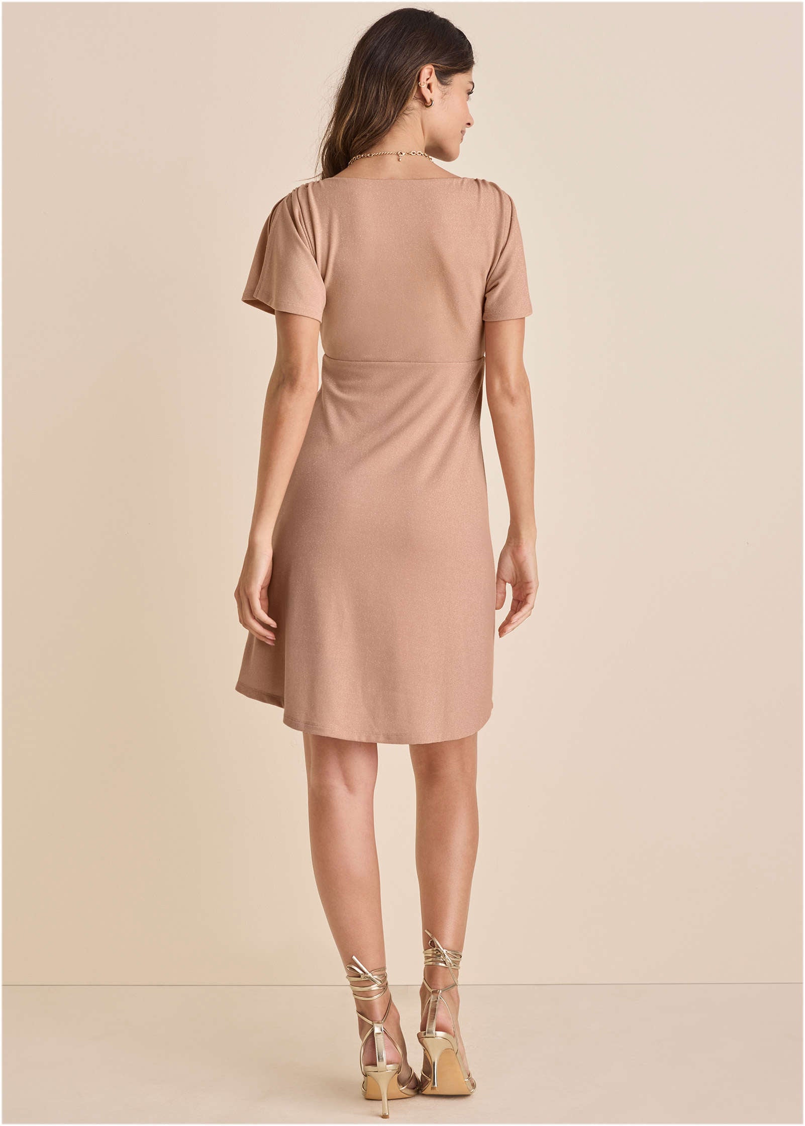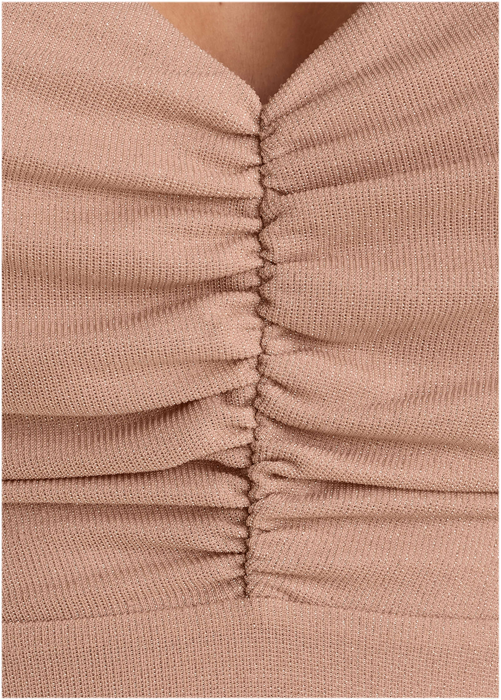 Shine bright like the star you are in this glitter mini dress! With a flattering V-neckline and a ruched detail at the neckline. this dress is all about making an entrance. The split sleeves add a touch of drama. while the glitter fabric ensures you sparkle all night long. Whether you're at cocktail hour or heading out for a date night. this dress is the perfect choice for turning heads.* Sizes: XS (2). S (4-6). M (8-10). L (12-14). XL (16)* V-neckline: A flattering and sultry cut.* Short sleeves with split design: Adds a dramatic flair to the silhouette.* Ruched detail at neckline: Creates a figure-flattering effect.* Glitter fabric: Shimmers and shines for a bold. statement-making look.* Fabric has stretch* Nylon/lurex/spandex/poly. Imported