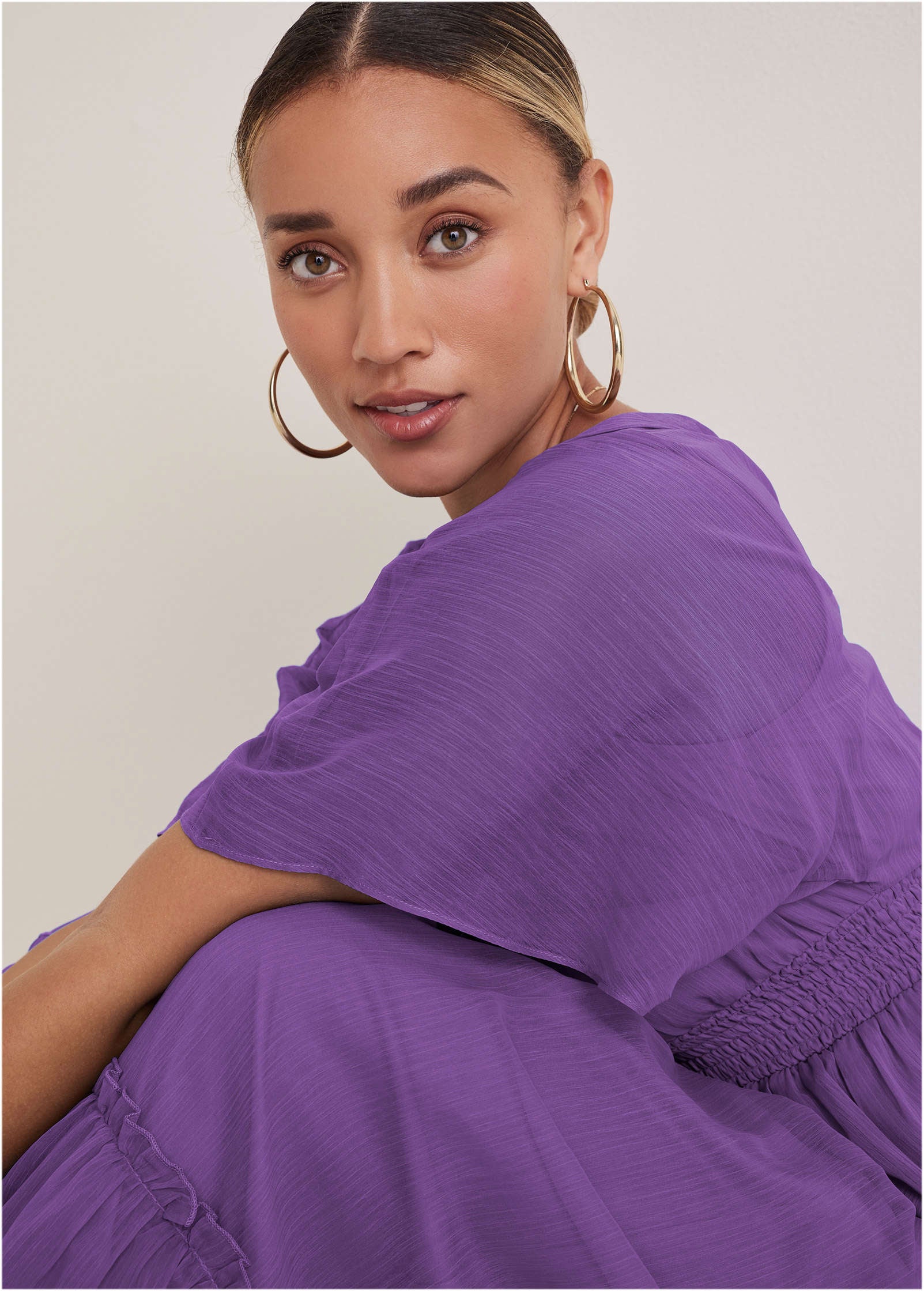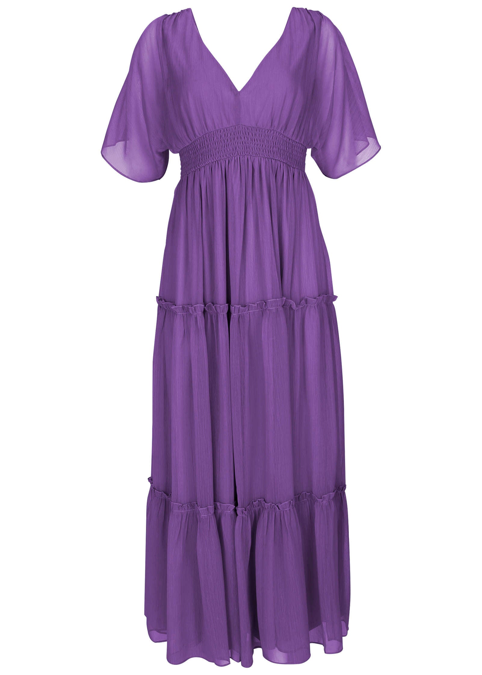 This floaty maxi is your ticket to paradise! With a flattering empire waist and twirly tiers of fabric beneath. this dress is ready to get caught in a cool breeze. Sheer flutter sleeves up the feminine feels while a tie across the shoulders draws attention to the V-back. Looks best beachside. but any sunny locale will do.* Sizes: XS (2). S (4-6). M (8-10). L (12-14). XL (16) * Plus sizes: 1X (18-20). 2X (22-24). 3X (26-28)* Item runs large; size down for a better fit* V-neckline* Short sleeves* Smocked waist * Tiered hem* Maxi length: 56" from shoulder* Polyester. Imported